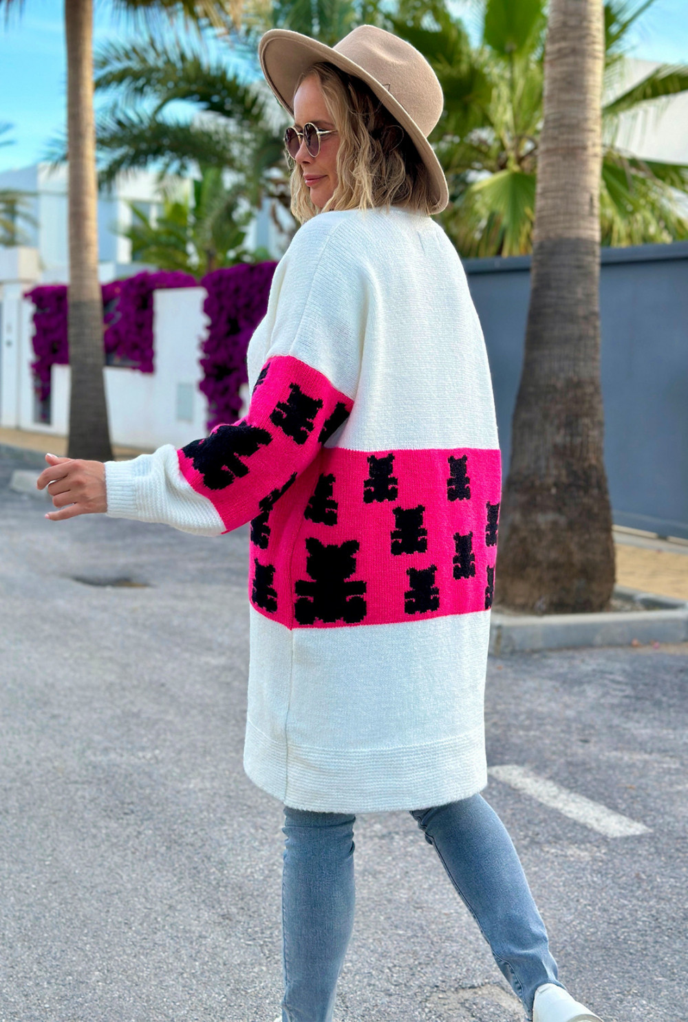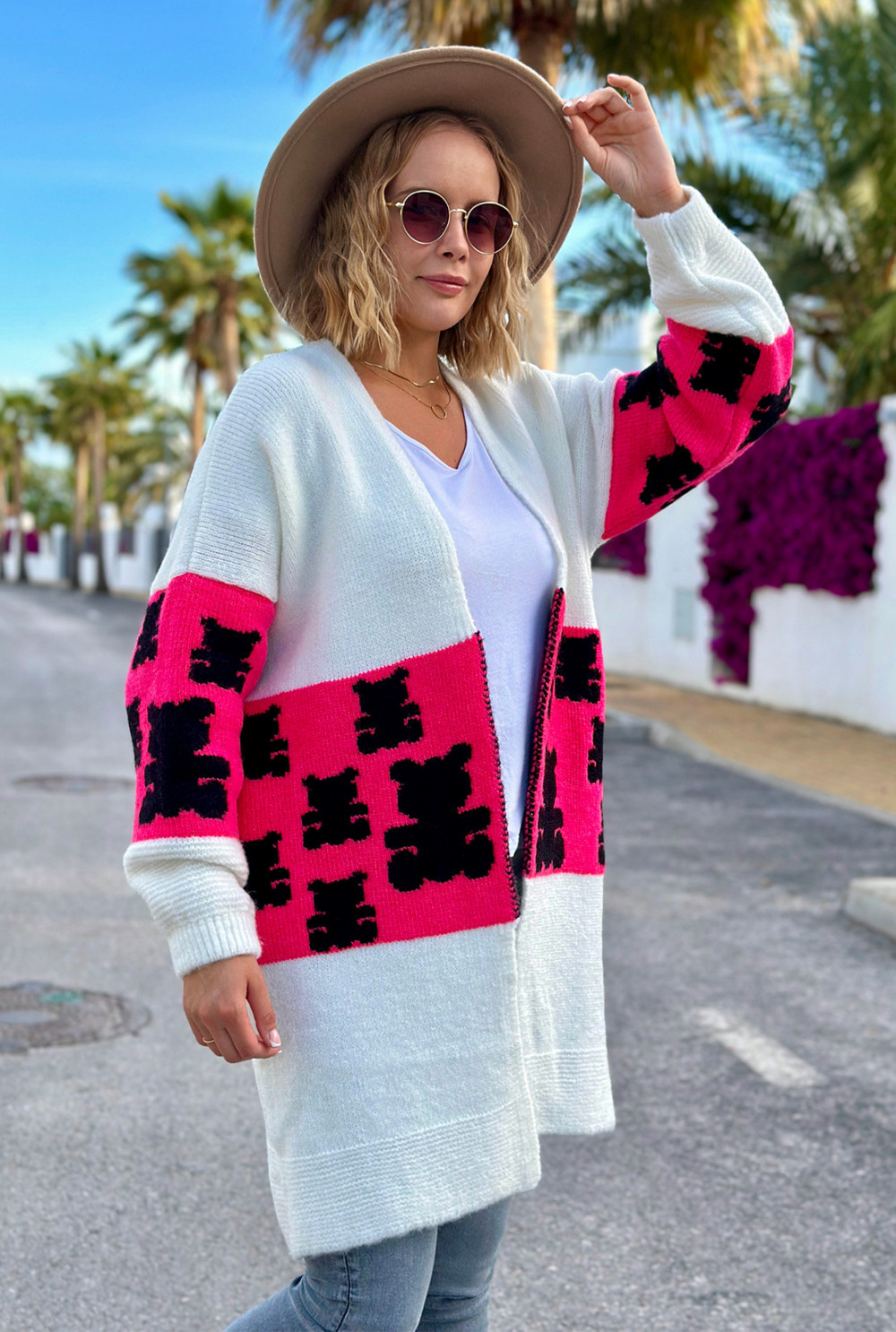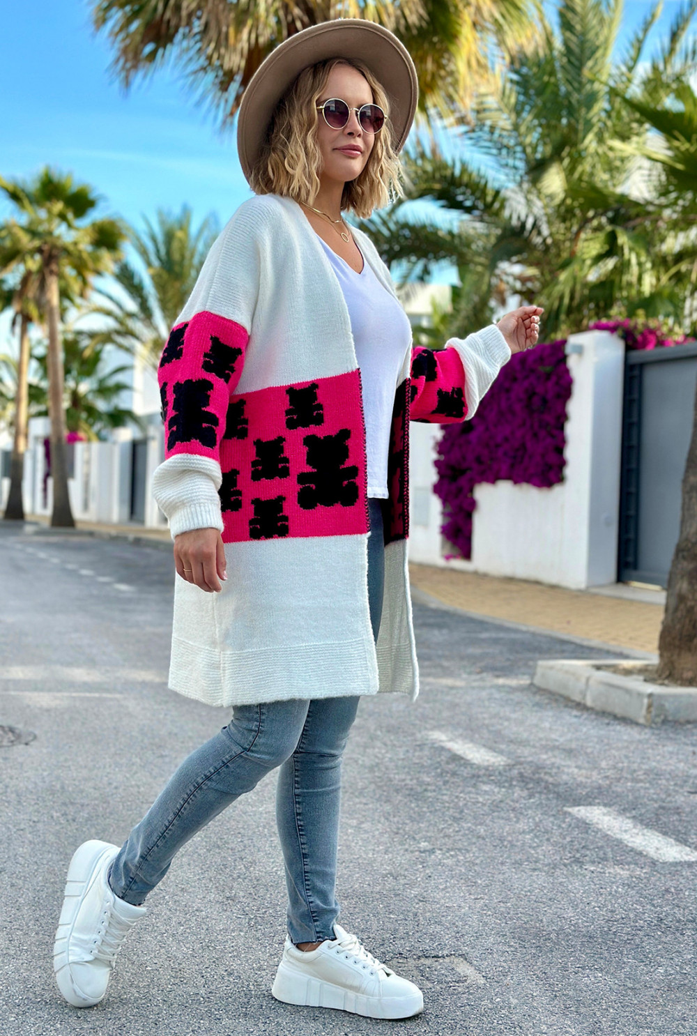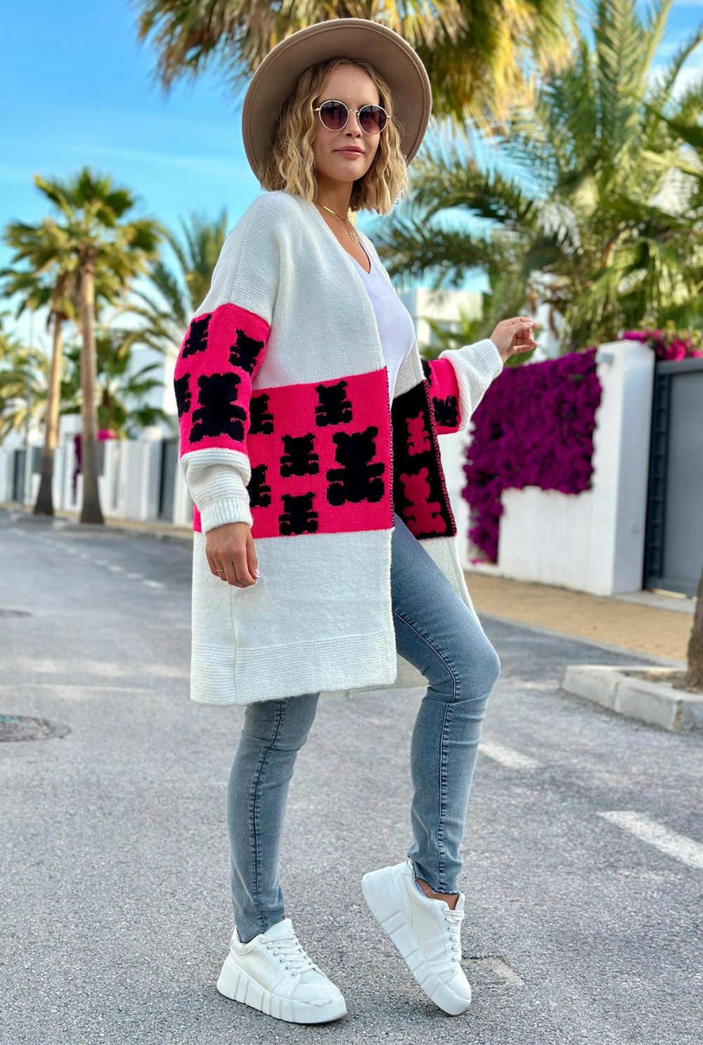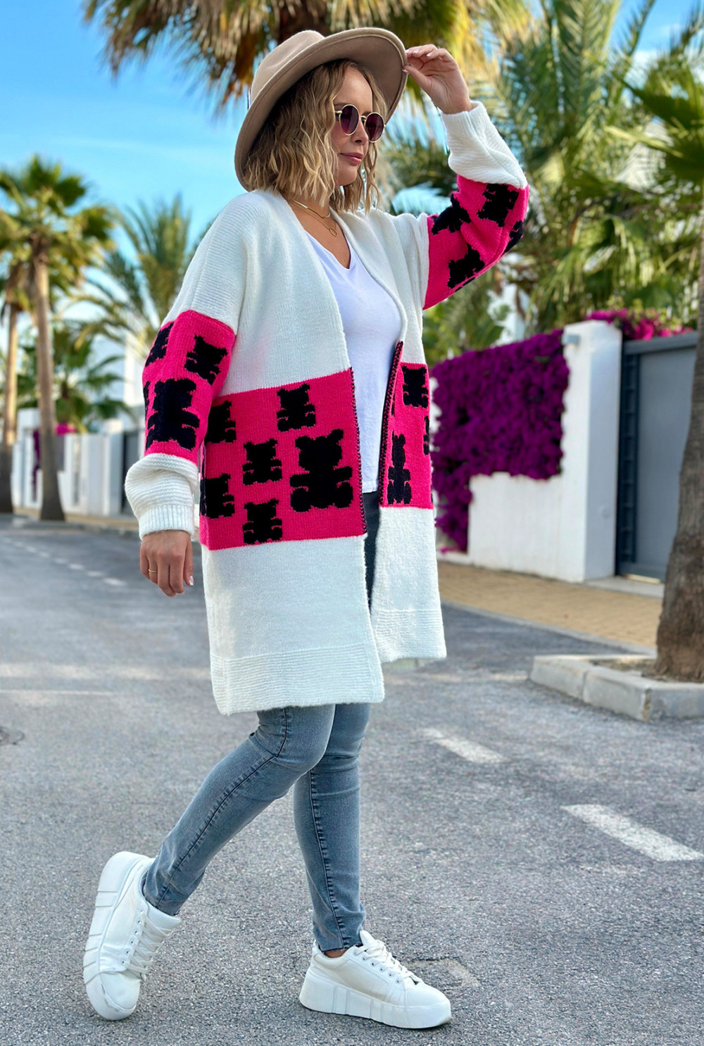 Miękki kardigan wykonany z najwyższej jakości materiałów! Posiada najmodniejszy w tym sezonie motyw misia, który dodaje niepowtarzalnego charakteru! Wyróżnia go oryginalne połączenie kolorów. Zakończony ściągaczami przy rękawach. Świetnie sprawdzi się w codziennej stylizacji!