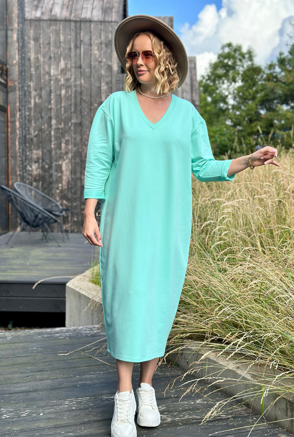 Bawełniana sukienka o długości midi. Jej prosty krój, dekolt w kształcie litery V oraz dłuższy rękaw zwieńczony podwinięciem sprawiają, że jest ona idealną propozycją na każdy sezon.