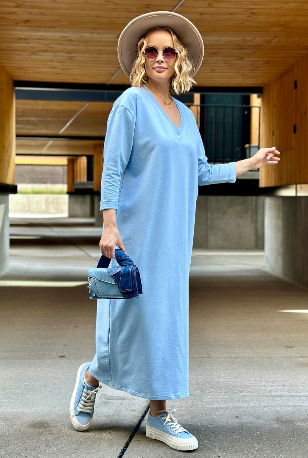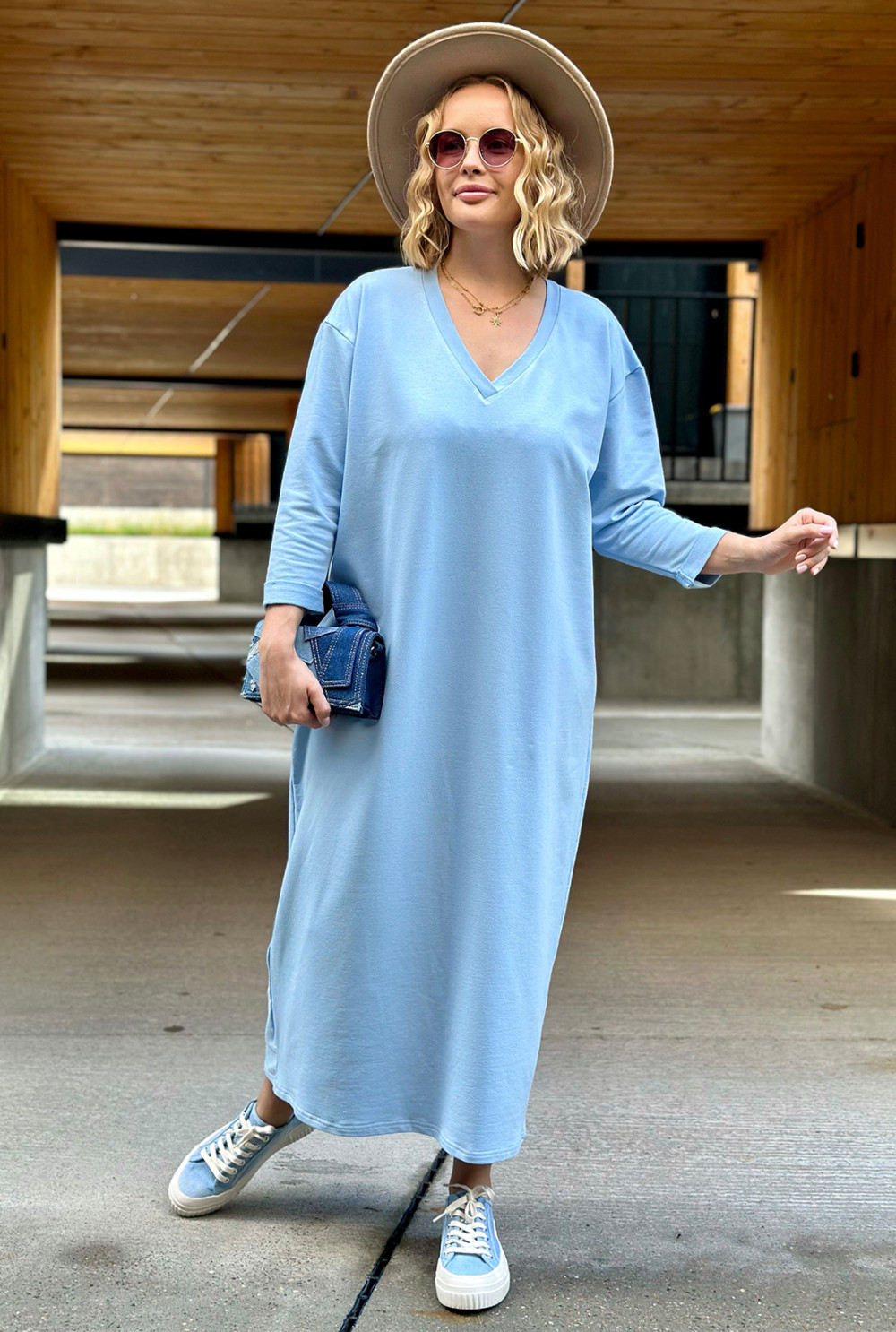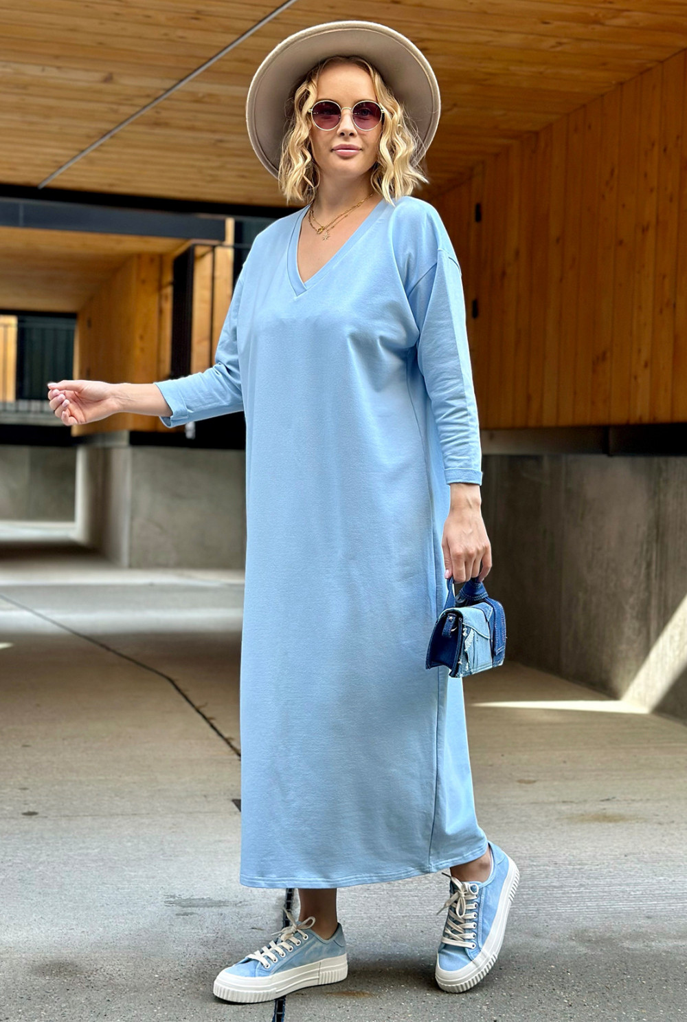 Bawełniana sukienka o długości midi. Jej prosty krój, dekolt w kształcie litery V oraz dłuższy rękaw zwieńczony podwinięciem sprawiają, że jest ona idealną propozycją na każdy sezon.