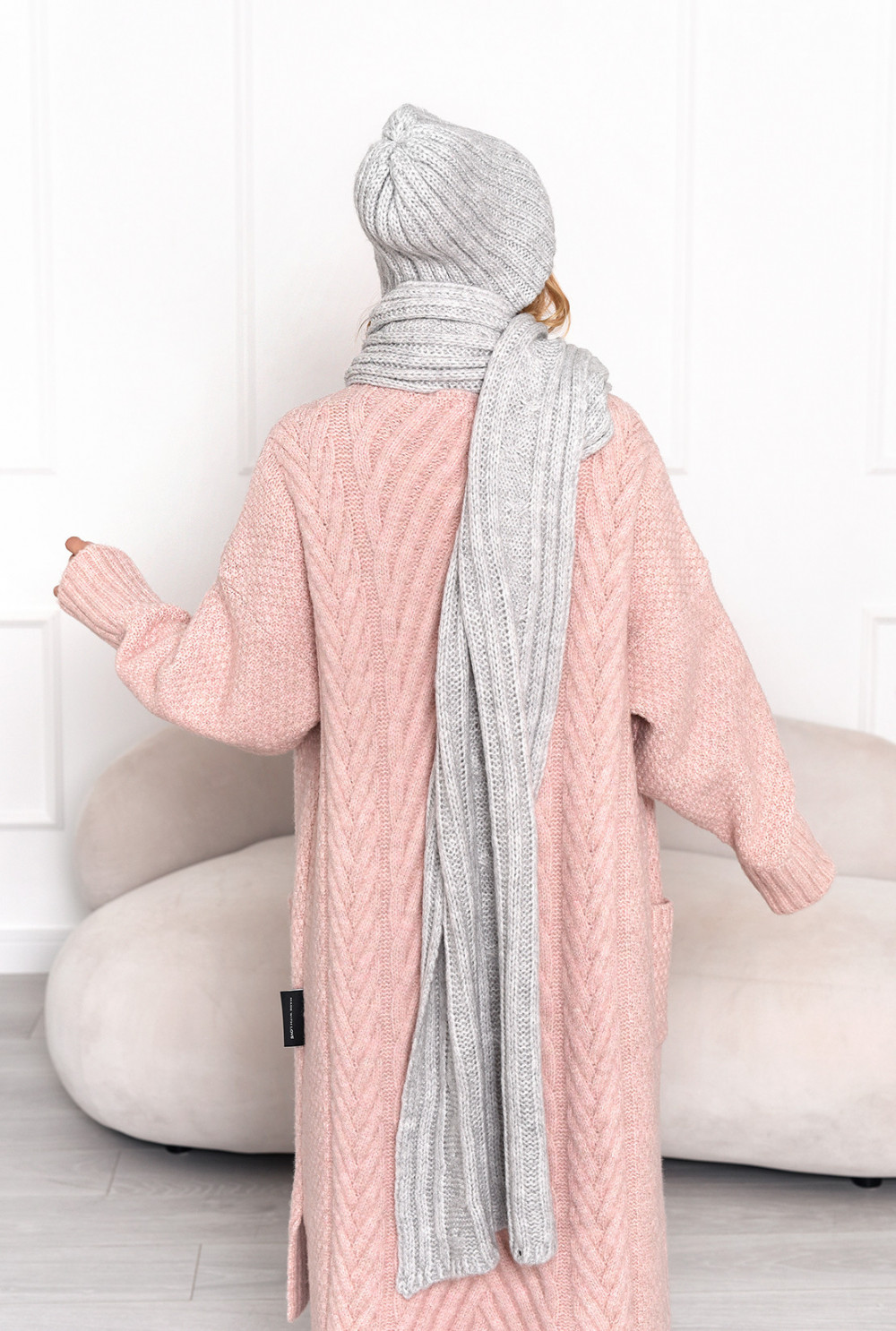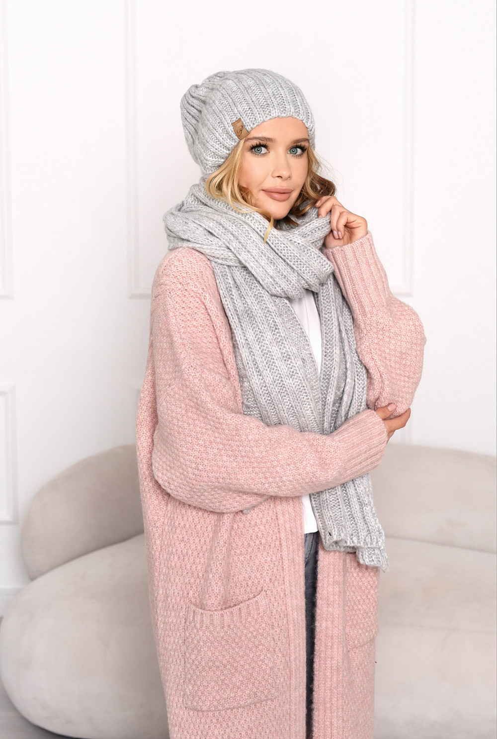 Ciepły komplet składający się z czapki i długiego szalika. Wykonany z wysokiej jakości materiałów. Ogrzeje Cię w chłodne dni i uzupełni Twój jesienno-zimowy look!