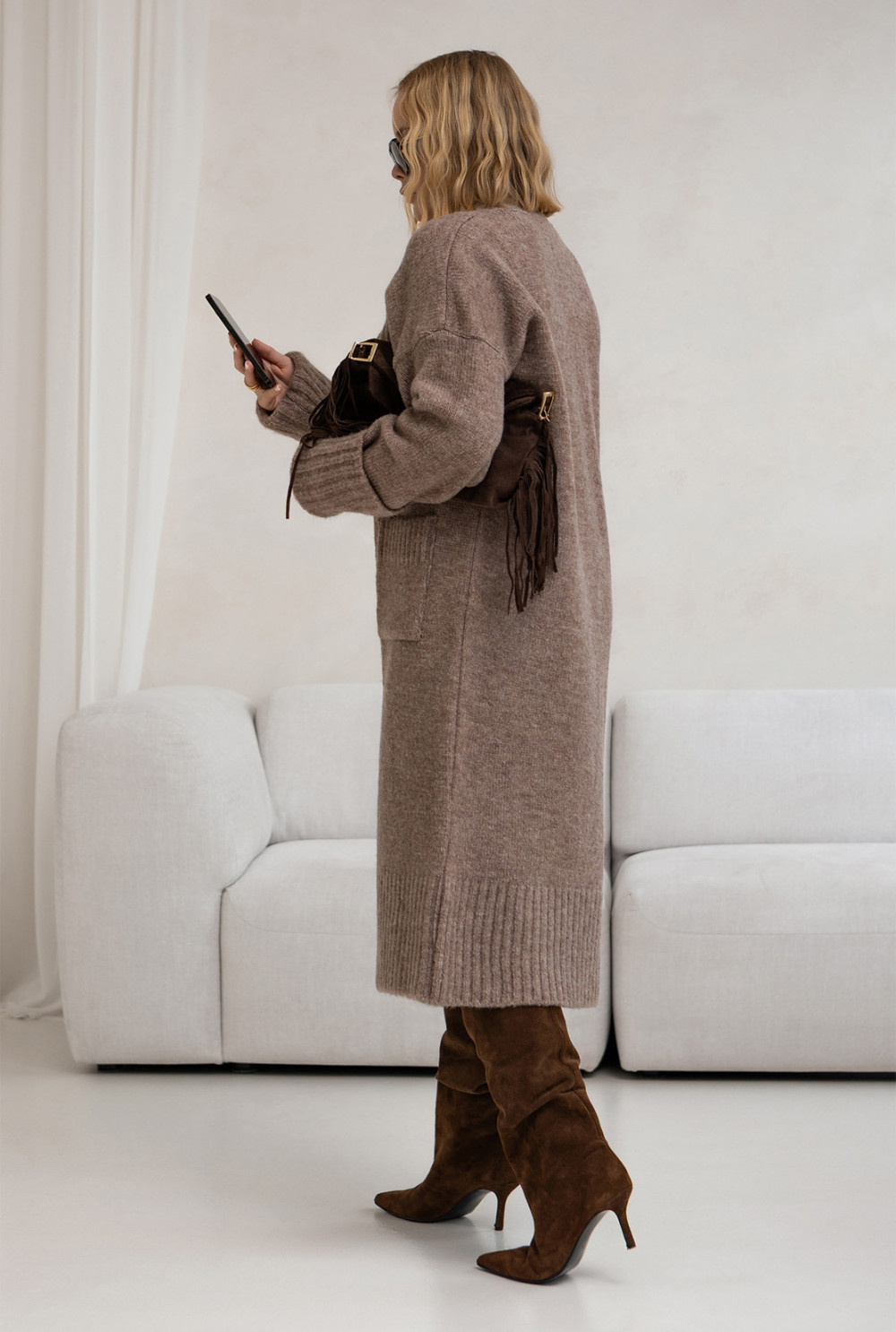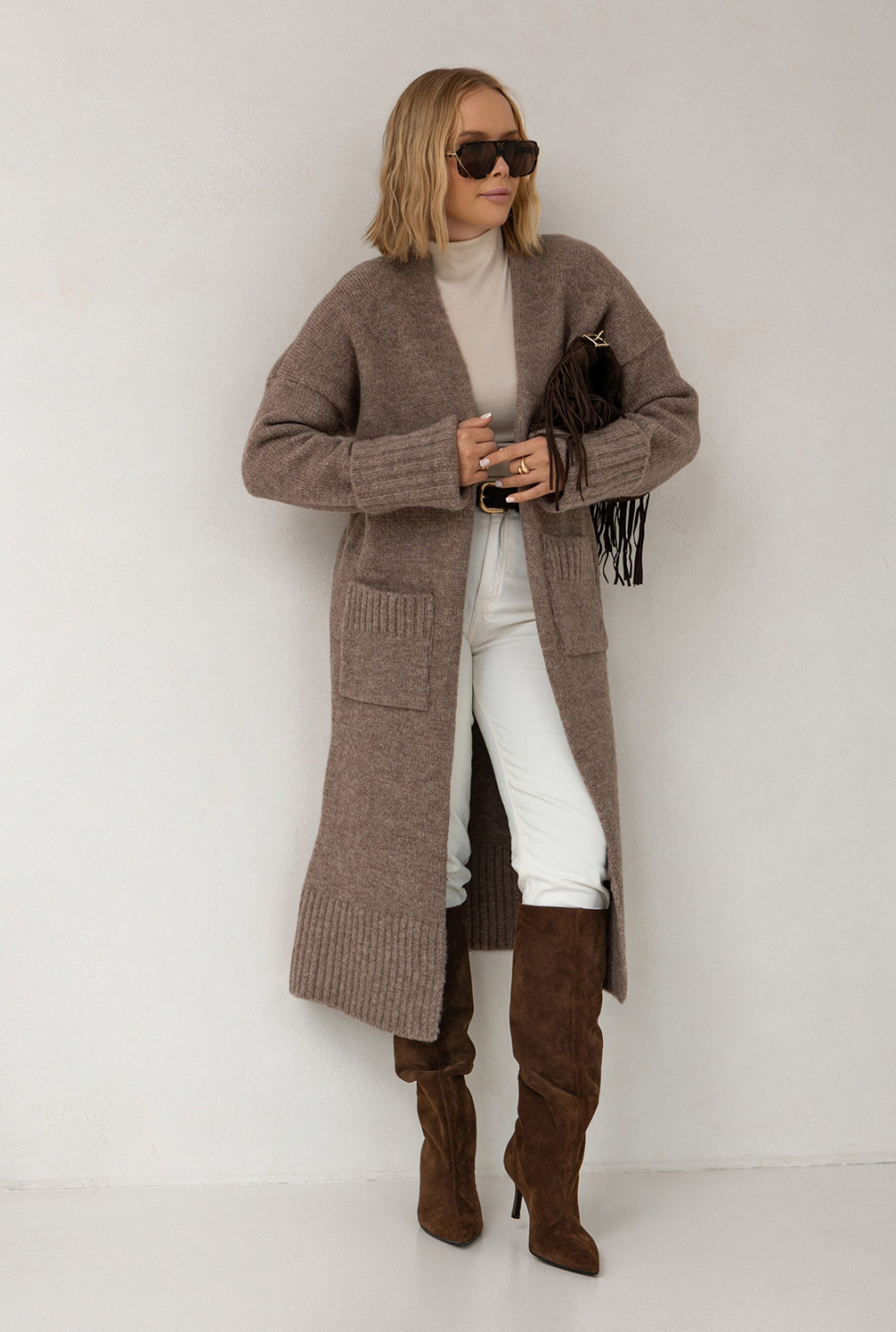 Długi kardigan o luźnym, oversizowym kroju to absolutny must have w kobiecej garderobie! Zwraca uwagę subtelnym splotem, praktycznymi kieszeniami i wywijanymi rękawami. To idealna propozycja do codziennych, komfortowych stylizacji, które łączą styl z wygodą.