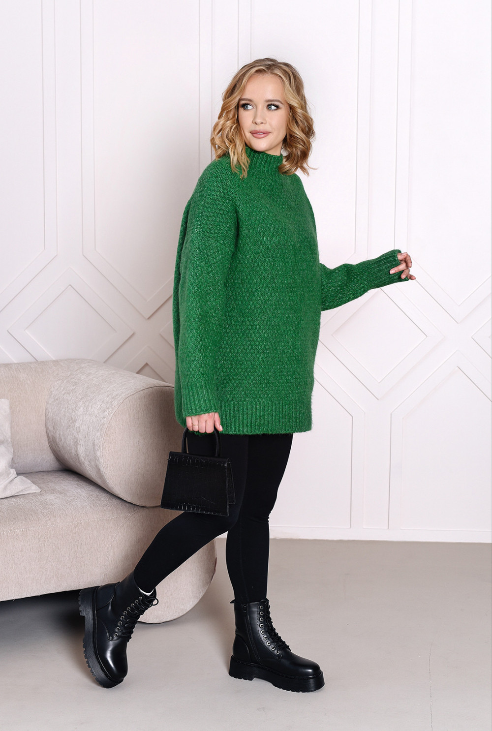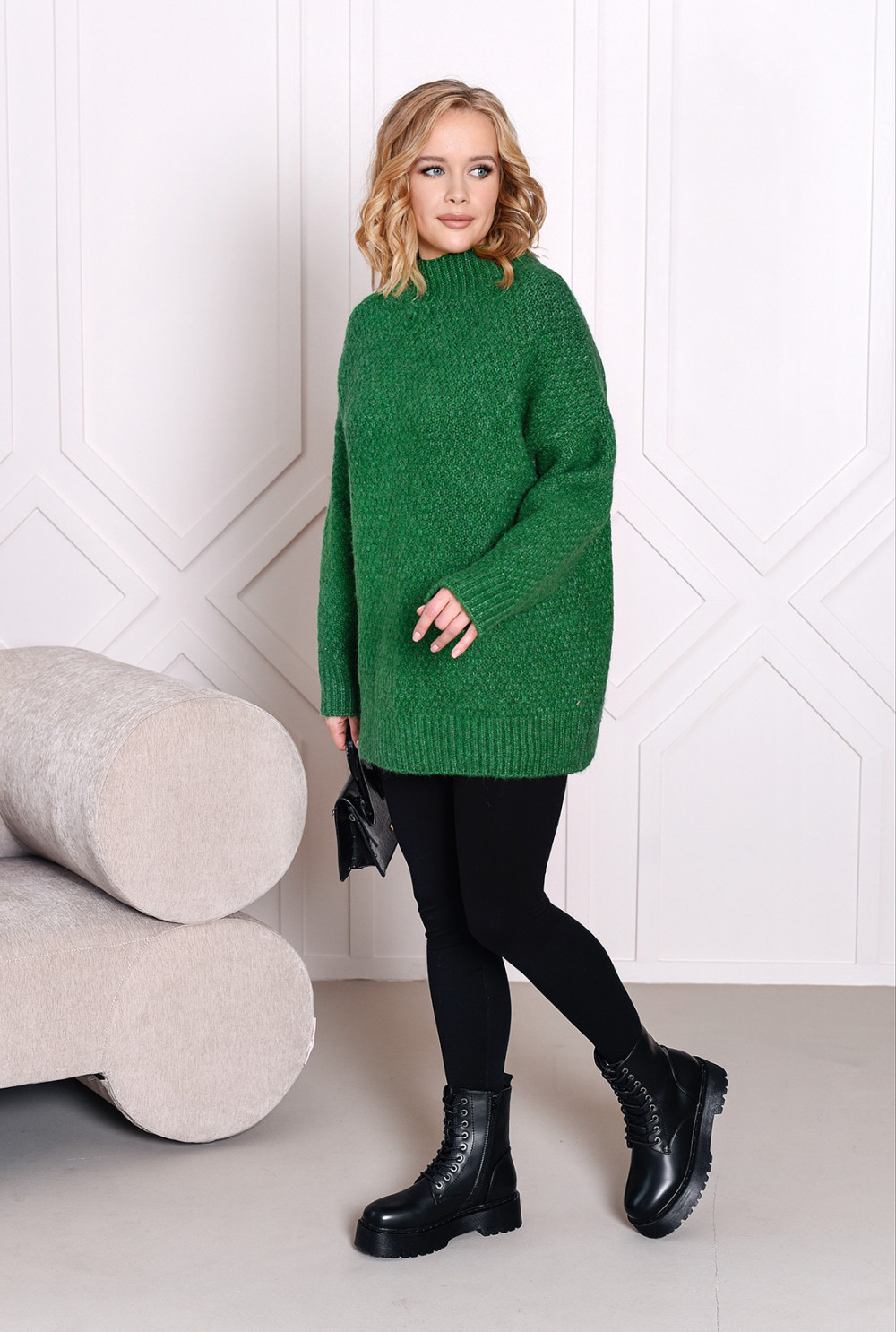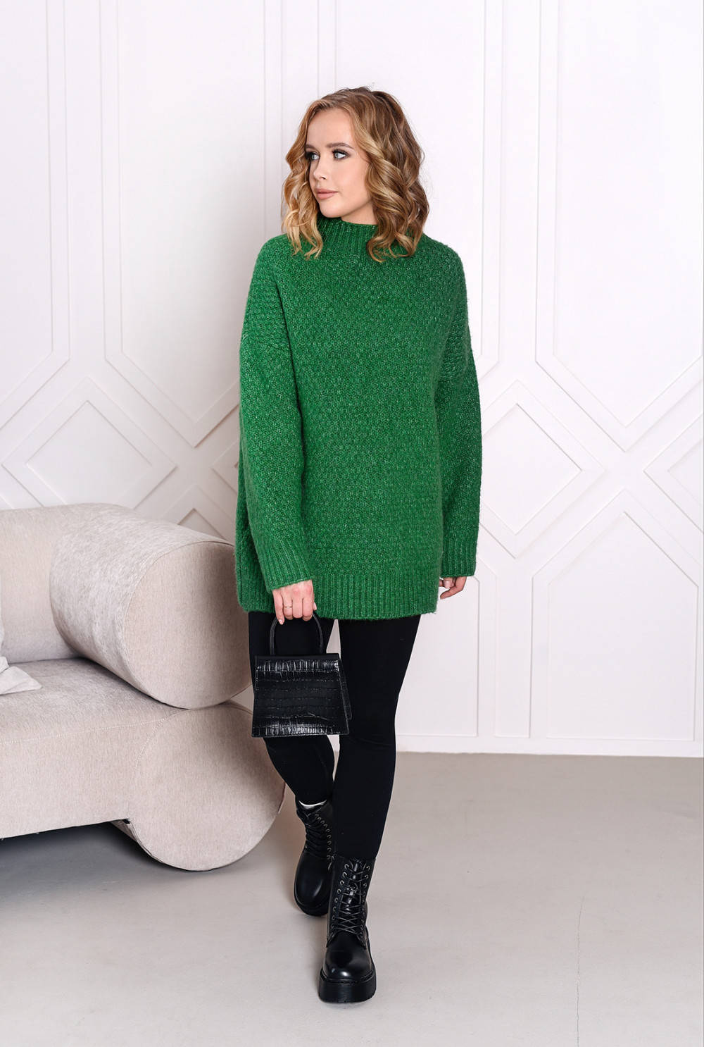 Dłuższy sweterek wykonany z wysokiej jakości materiałów. Model o oversizowym kroju, świetnie sprawdzi się w codziennej stylizacji. Posiada półgolf wokół szyi.