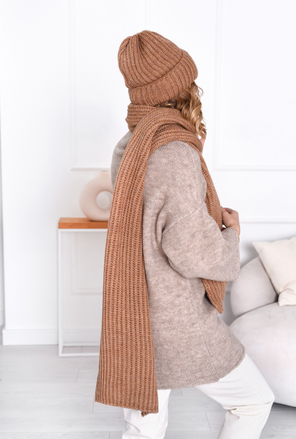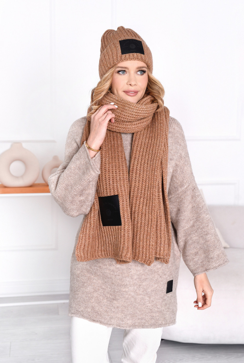 Ciepły komplet to doskonały wybór na chłodne zimowe dni, jak i na prezent dla bliskiej osoby. Czapka i długi szal posiadają ozdobną naszywkę. Komplet dostępny w wielu kolorach.