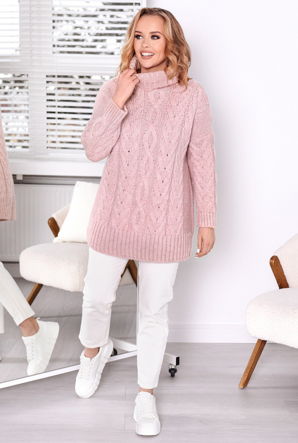 Dłuższy sweter z golfem i ozdobnym splotem. Model zakończony ściągaczem przy rękawach i na dole. Możesz zestawić go z halką lub spodniami i ciężkimi butami – świetna stylizacja gotowa!