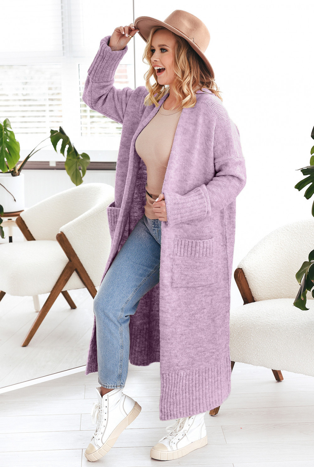 Długi kardigan o luźnym, oversizowym kroju to absolutny must have w kobiecej garderobie! Zwraca uwagę subtelnym splotem, praktycznymi kieszeniami i wywijanymi rękawami. To idealna propozycja do codziennych, komfortowych stylizacji, które łączą styl z wygodą.