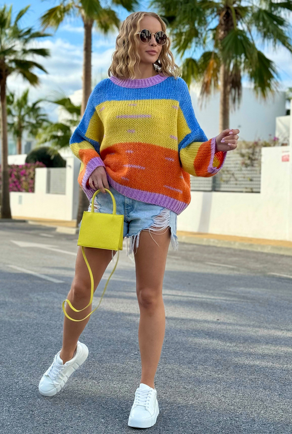 Sweter o kroju oversize w kolorowe pasy to doskonała baza do wielu stylizacji. Model posiada szersze rękawy. Dostępny w wielu wersjach kolorystycznych!