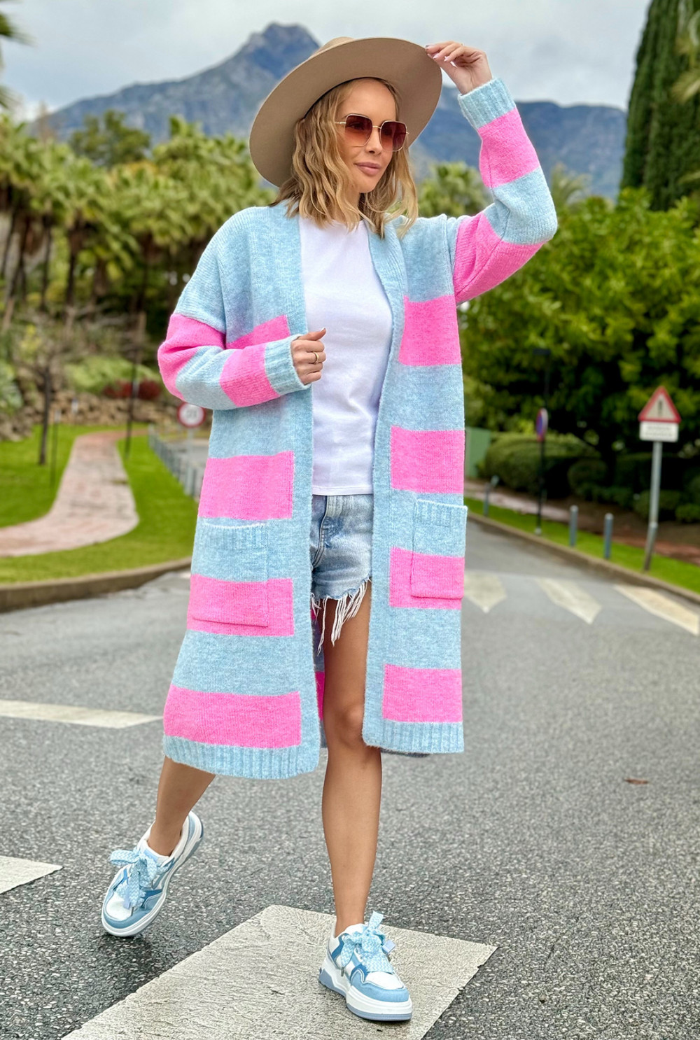 Długi kardigan w kolorowe pasy Arleta błękit-baby róż