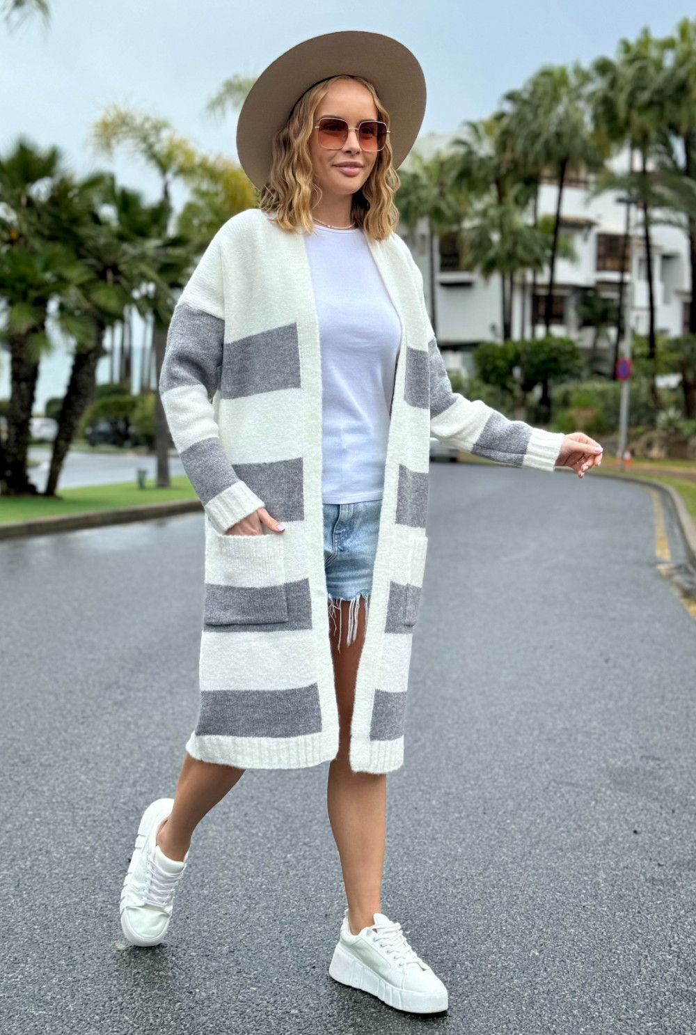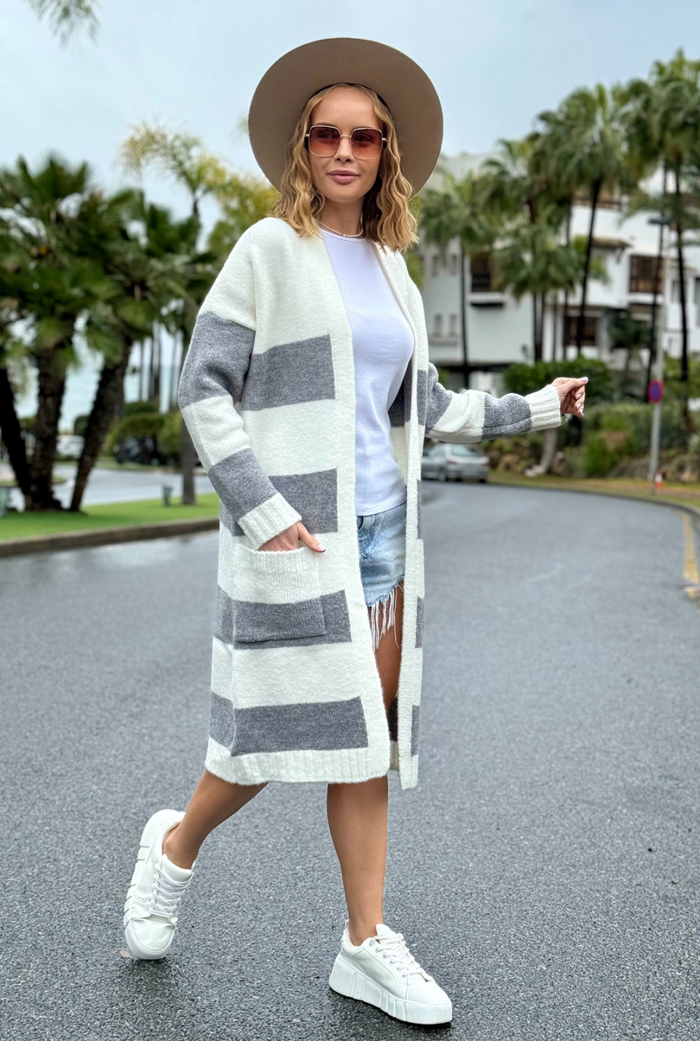 Długi kardigan w kolorowe pasy Arleta ecru-ciemnoszary