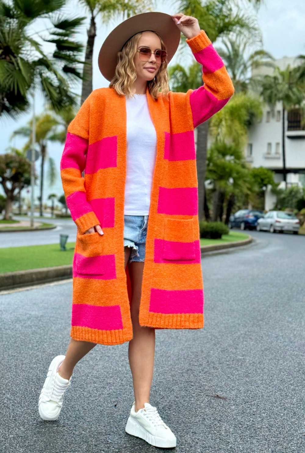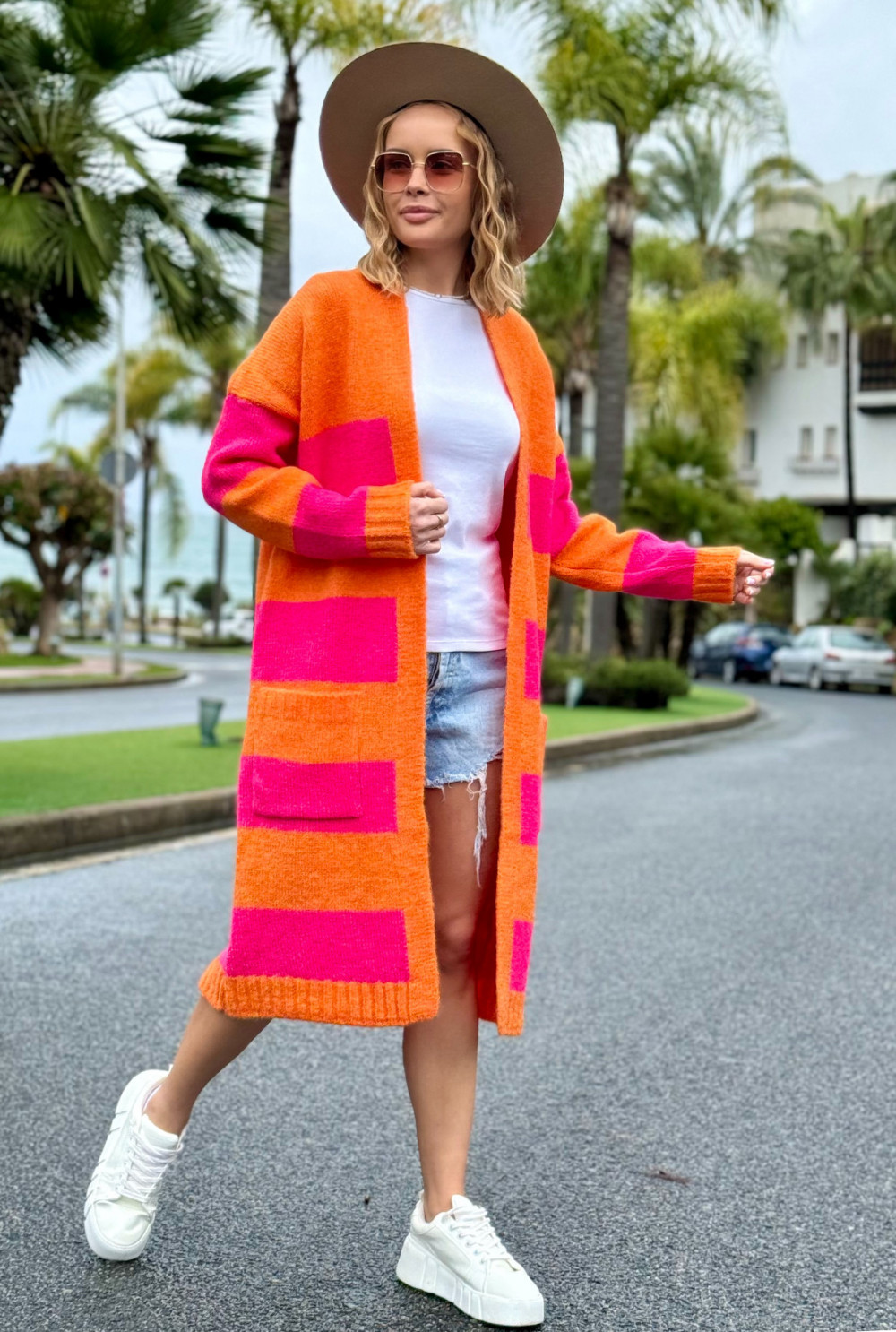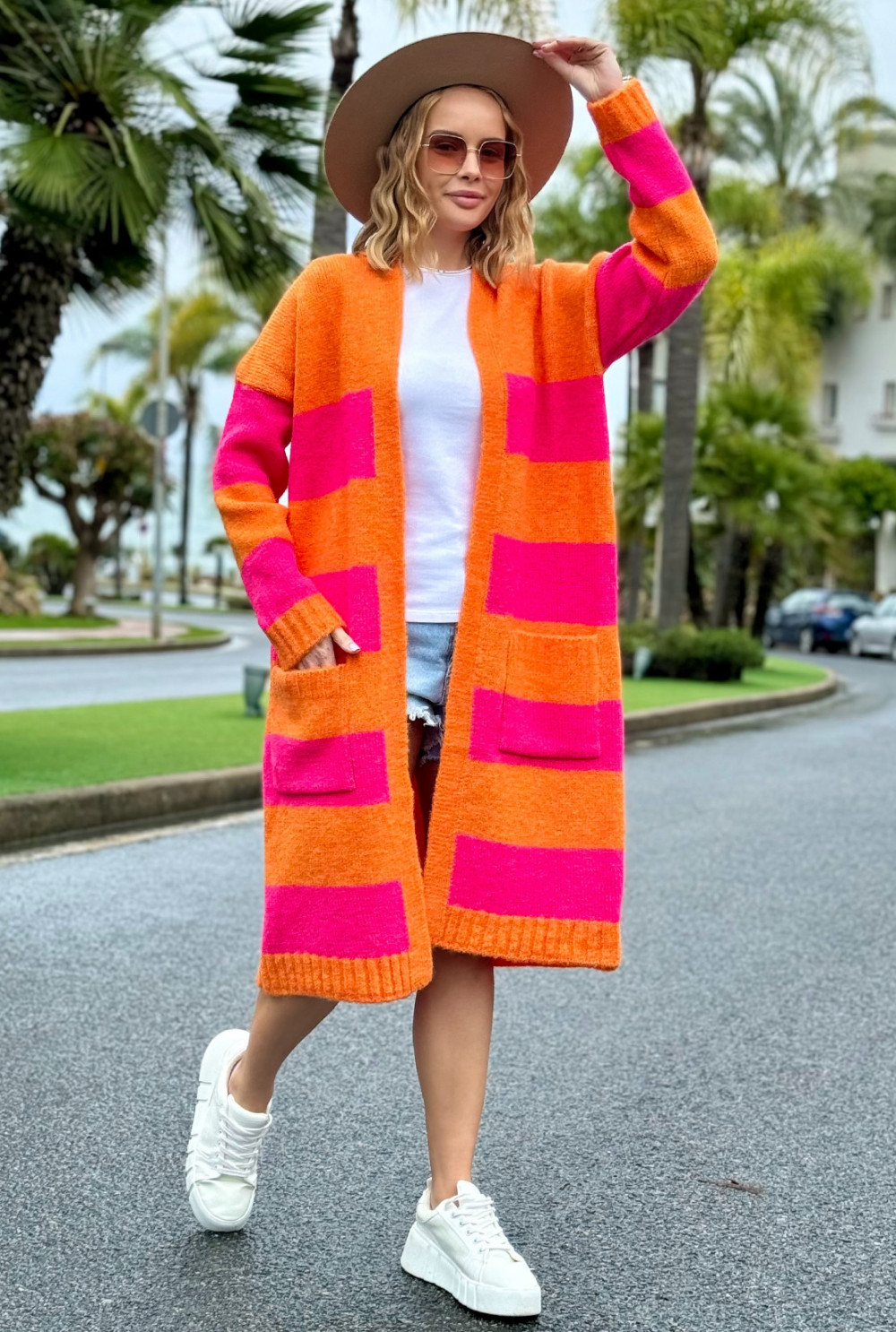 Długi kardigan w kolorowe pasy Arleta pomarańcz-fuksja