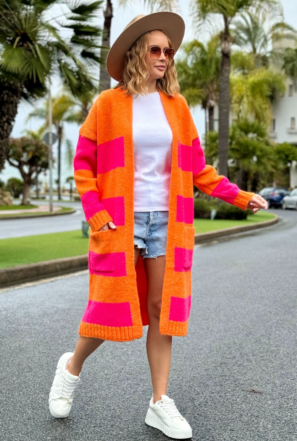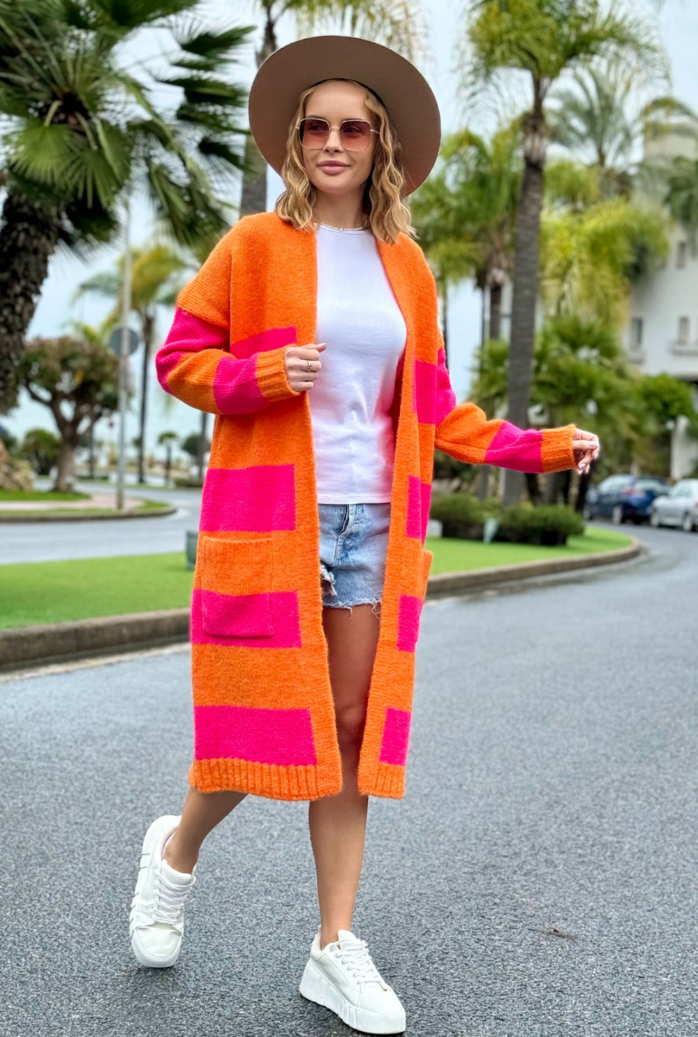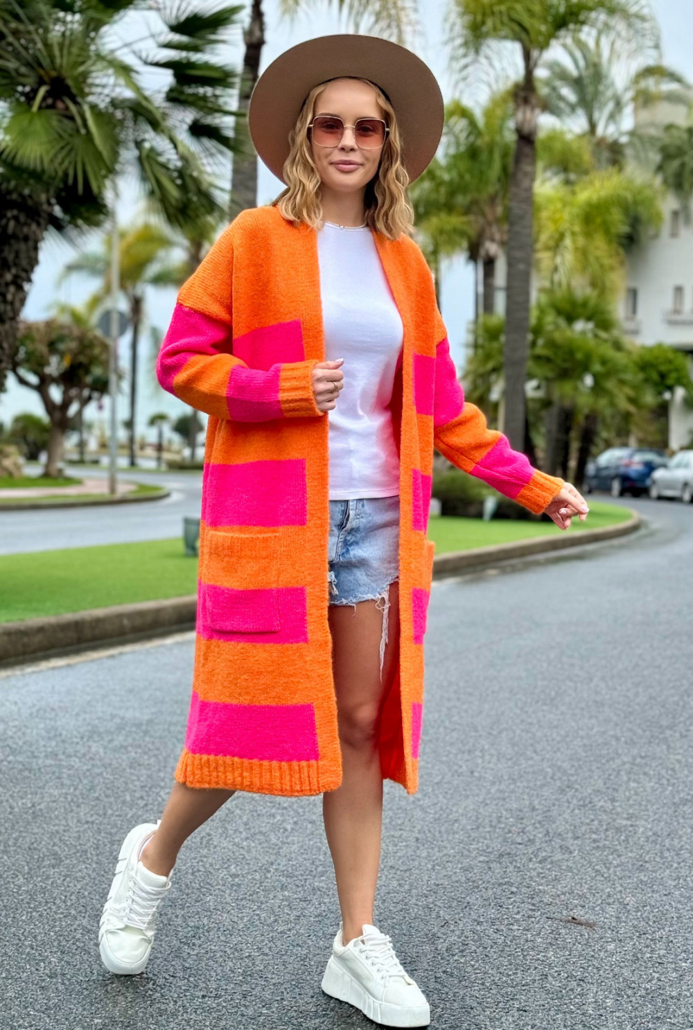 Długi kardigan w kolorowe pasy Arleta pomarańcz-fuksja
