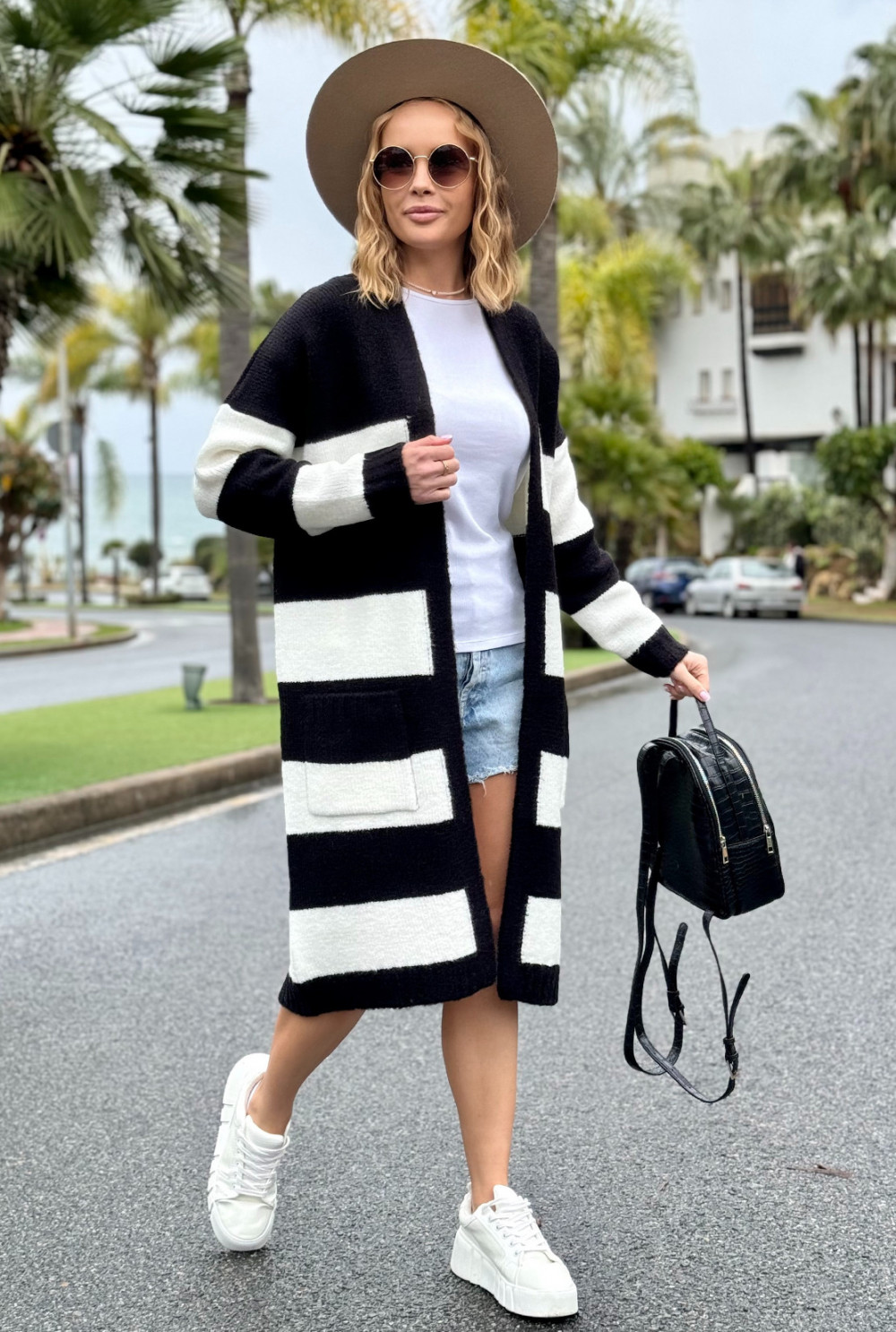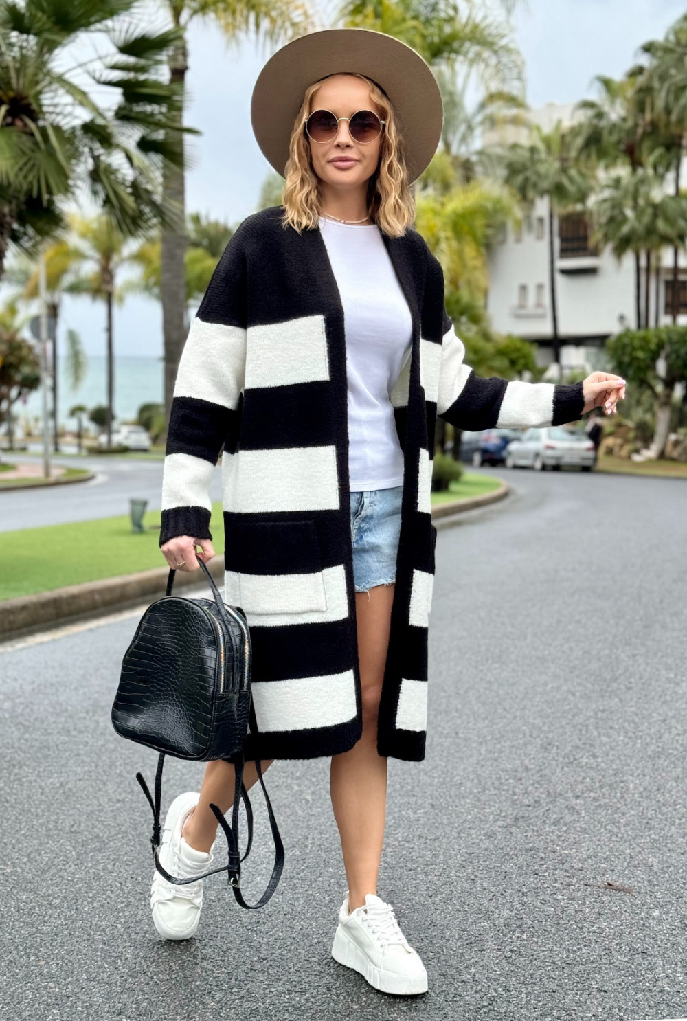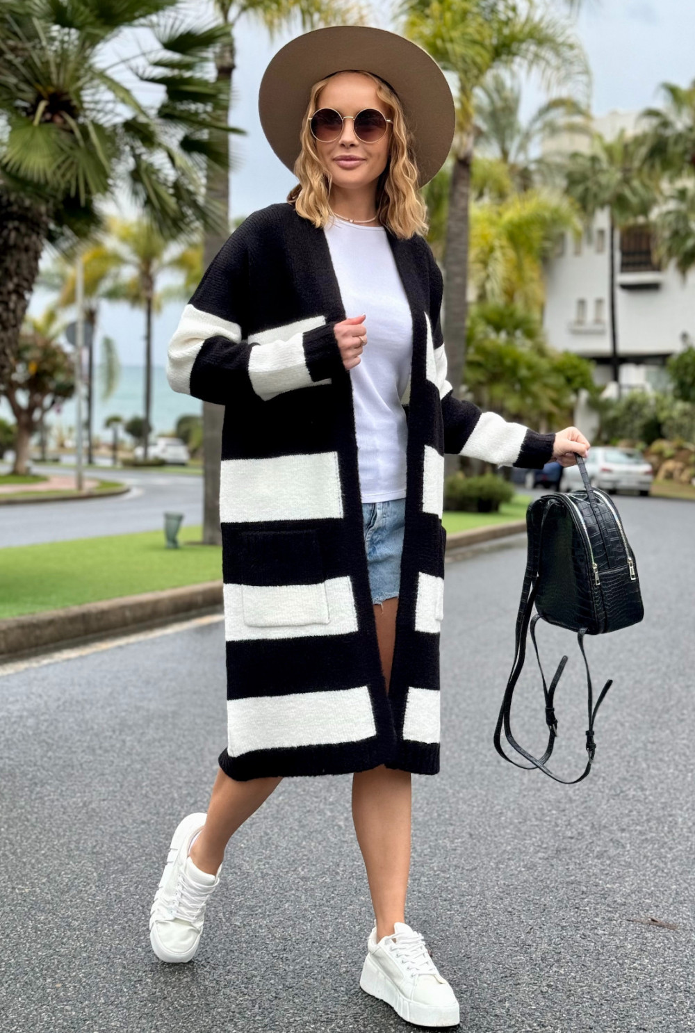 Długi kardigan w kolorowe pasy Arleta czarny-ecru