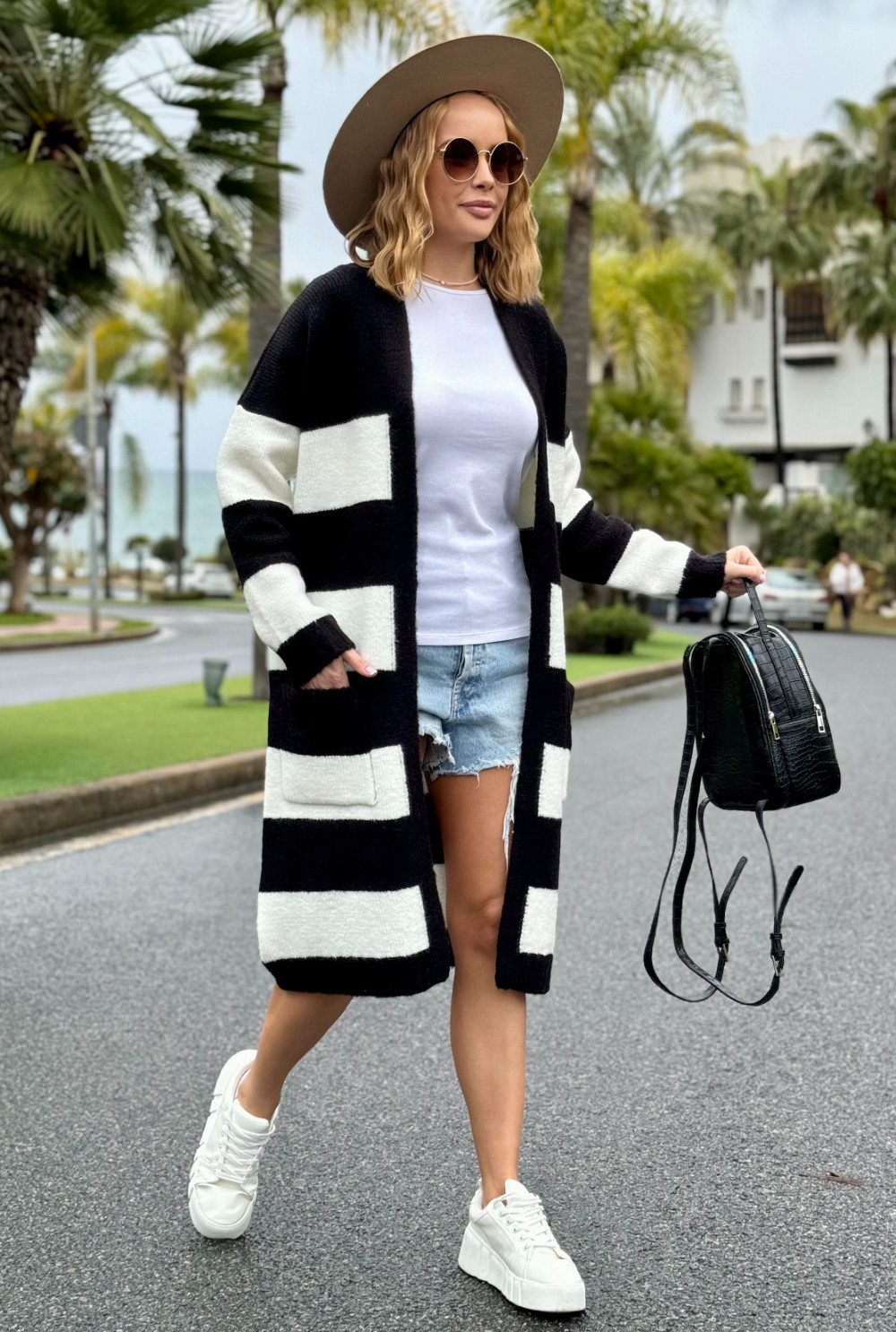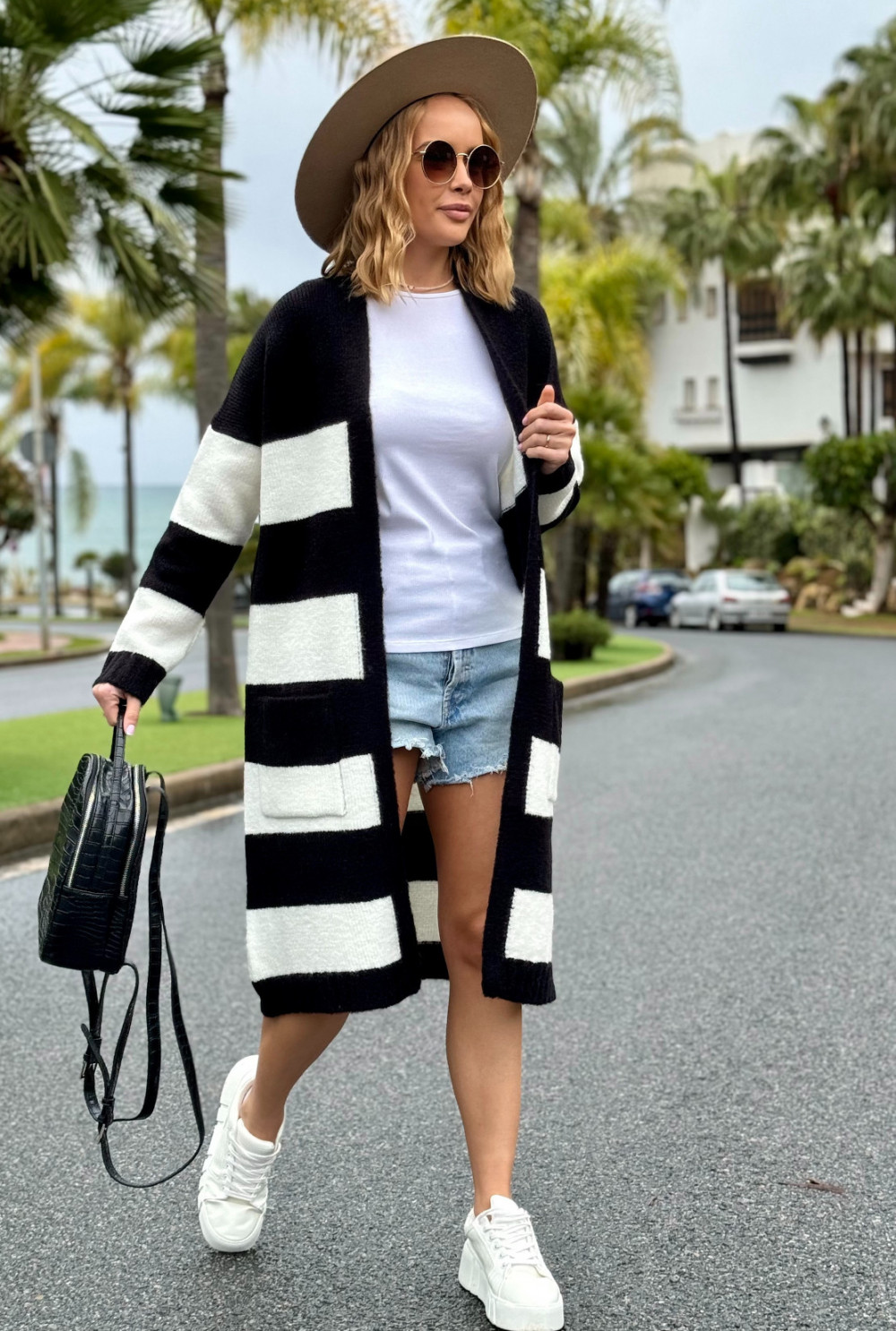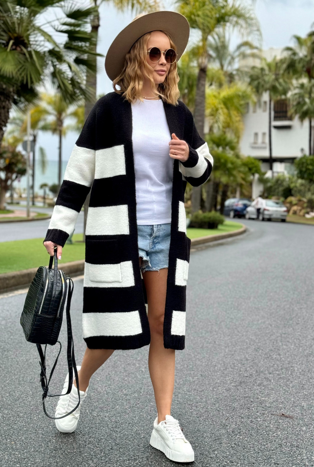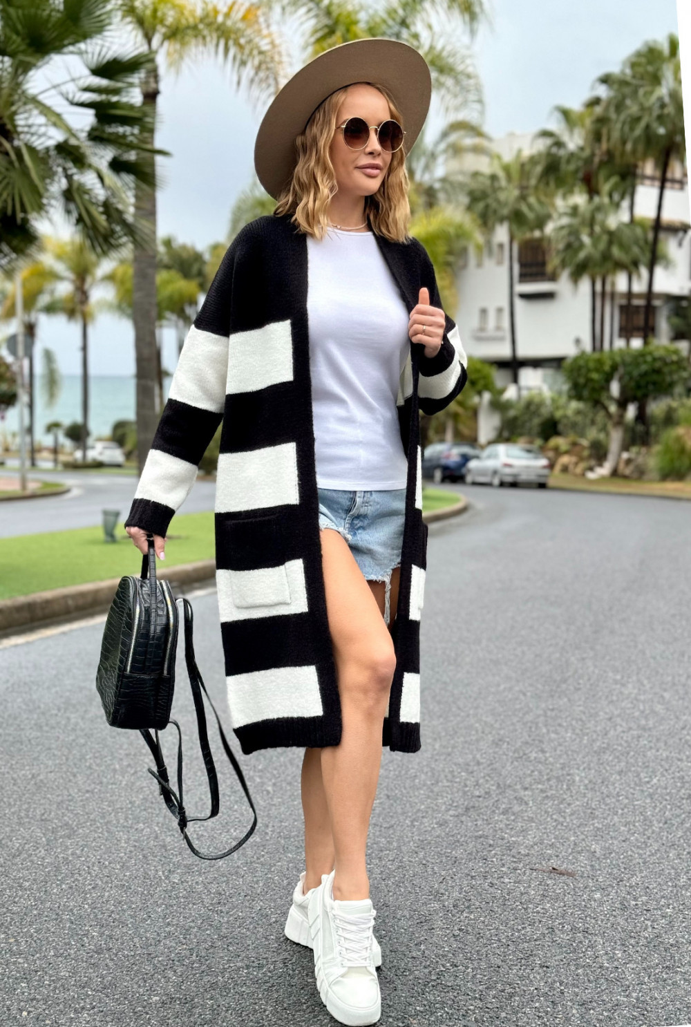 Długi kardigan w kolorowe pasy Arleta czarny-ecru