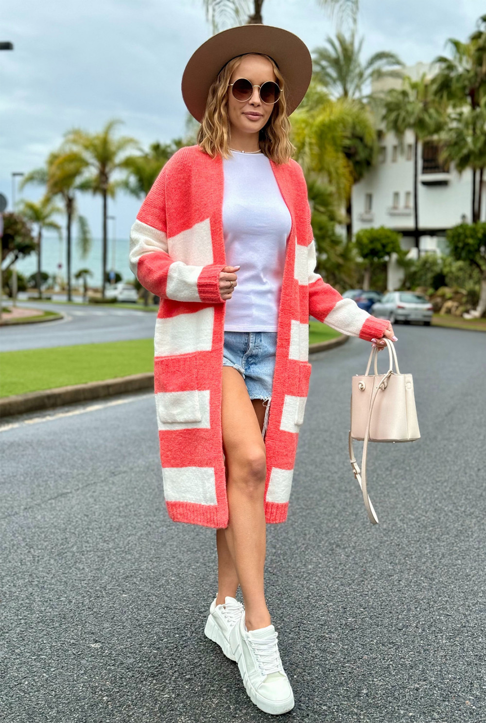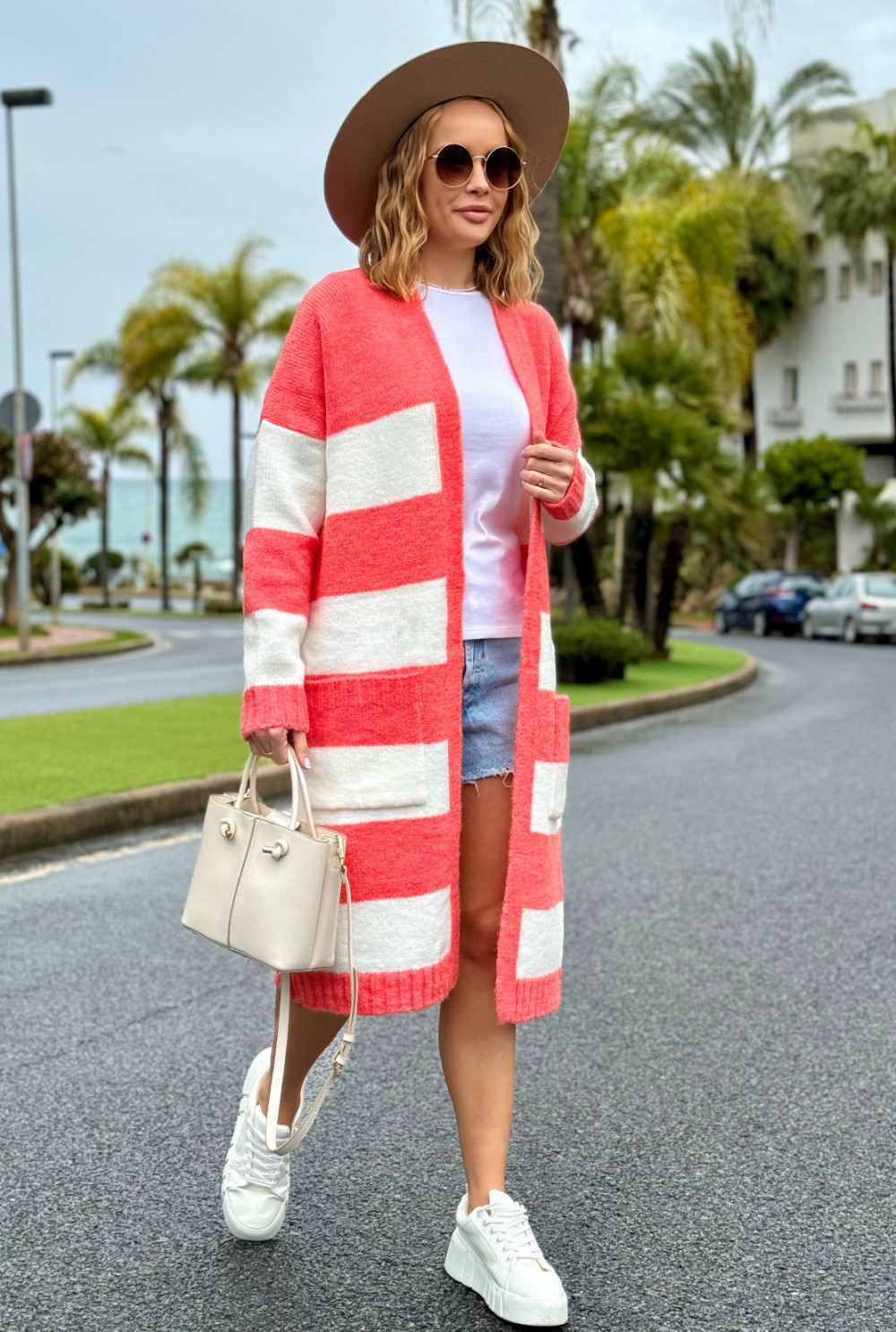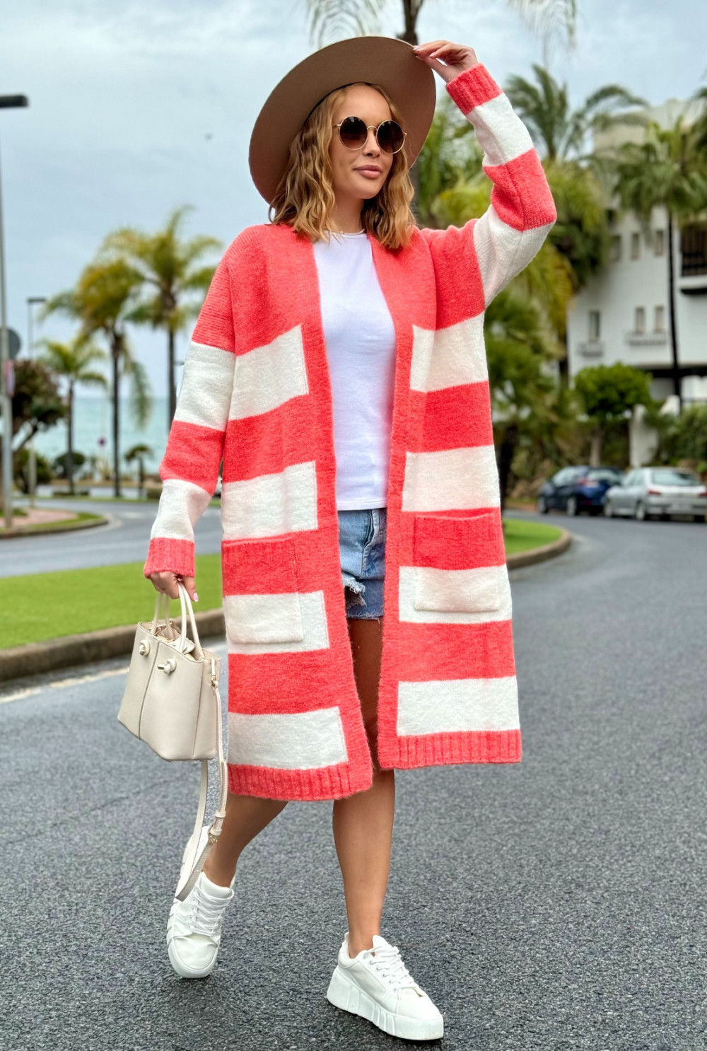 Długi kardigan w kolorowe pasy Arleta koral-ecru