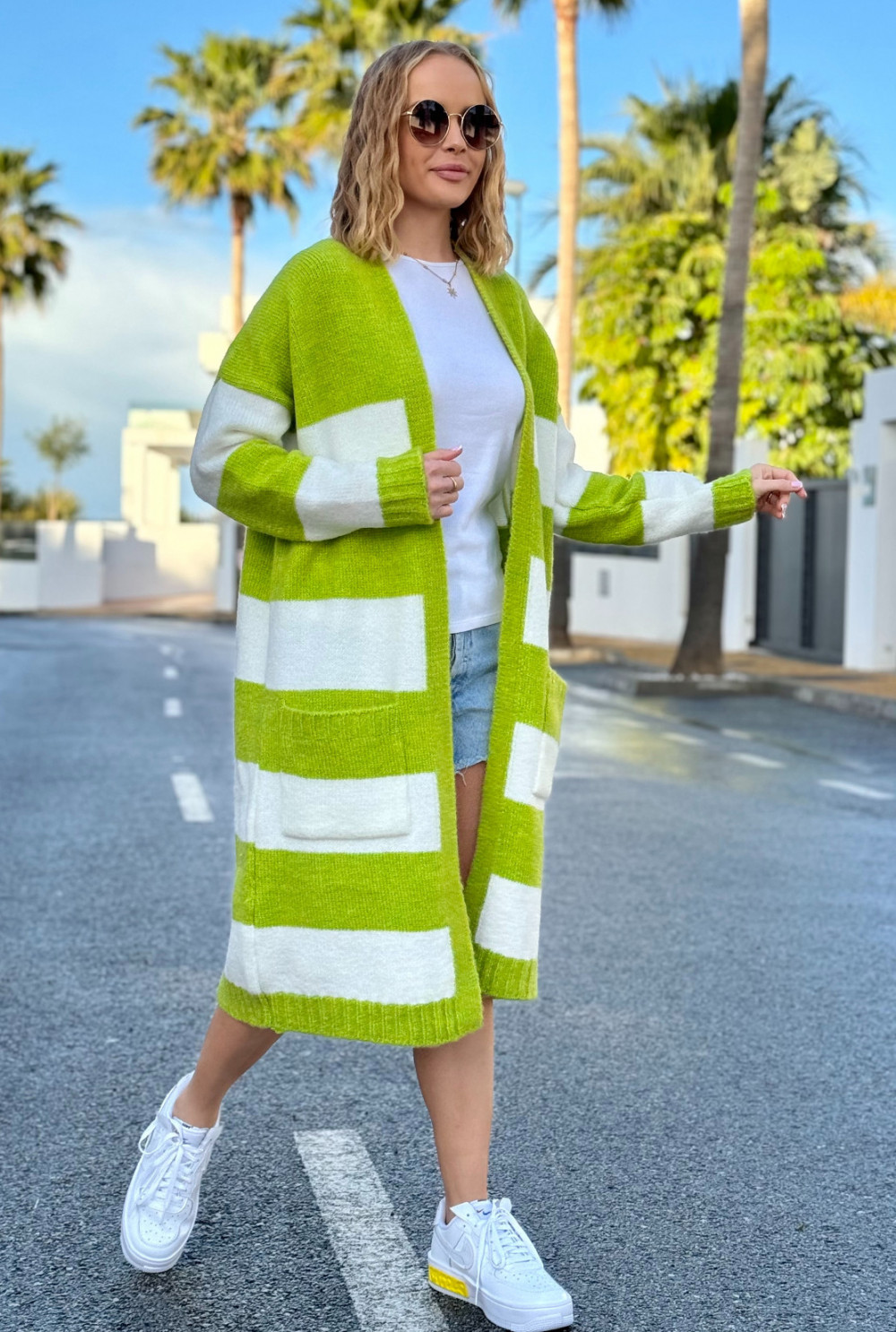 Długi kardigan w kolorowe pasy Arleta limonka-ecru