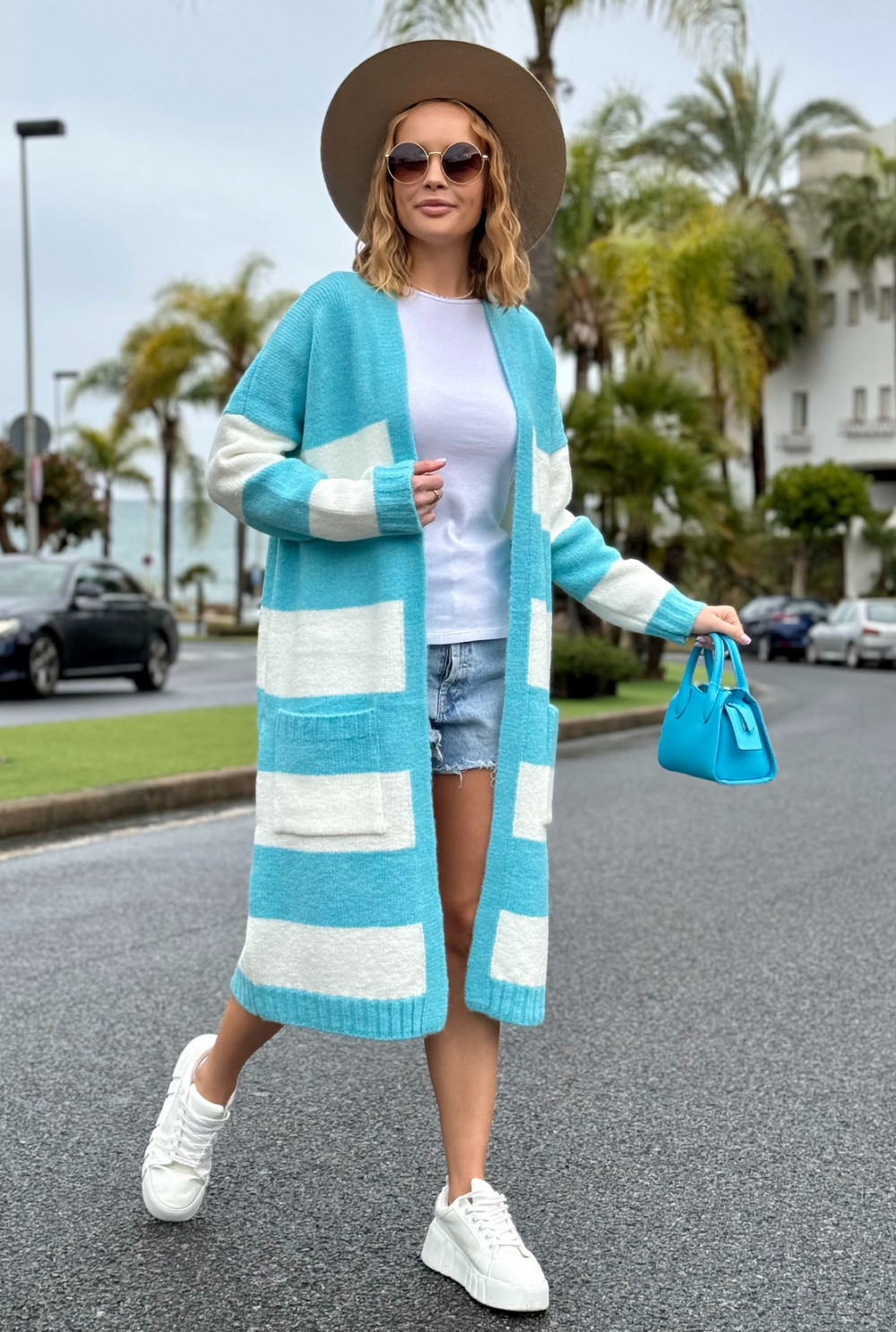 Długi kardigan w kolorowe pasy Arleta niebo-ecru