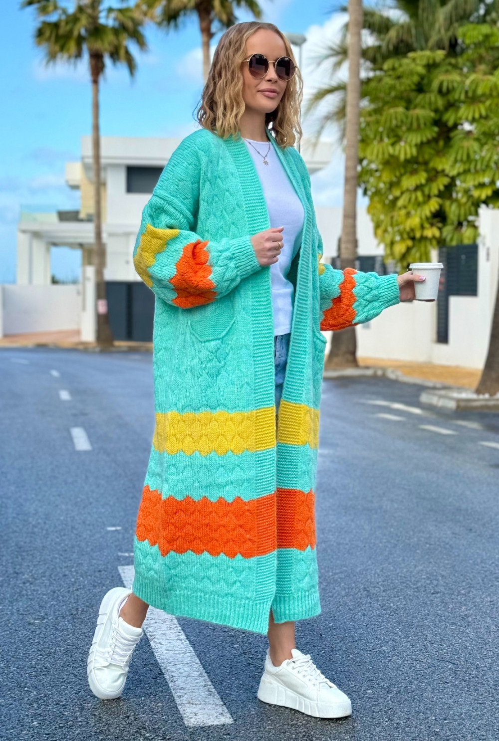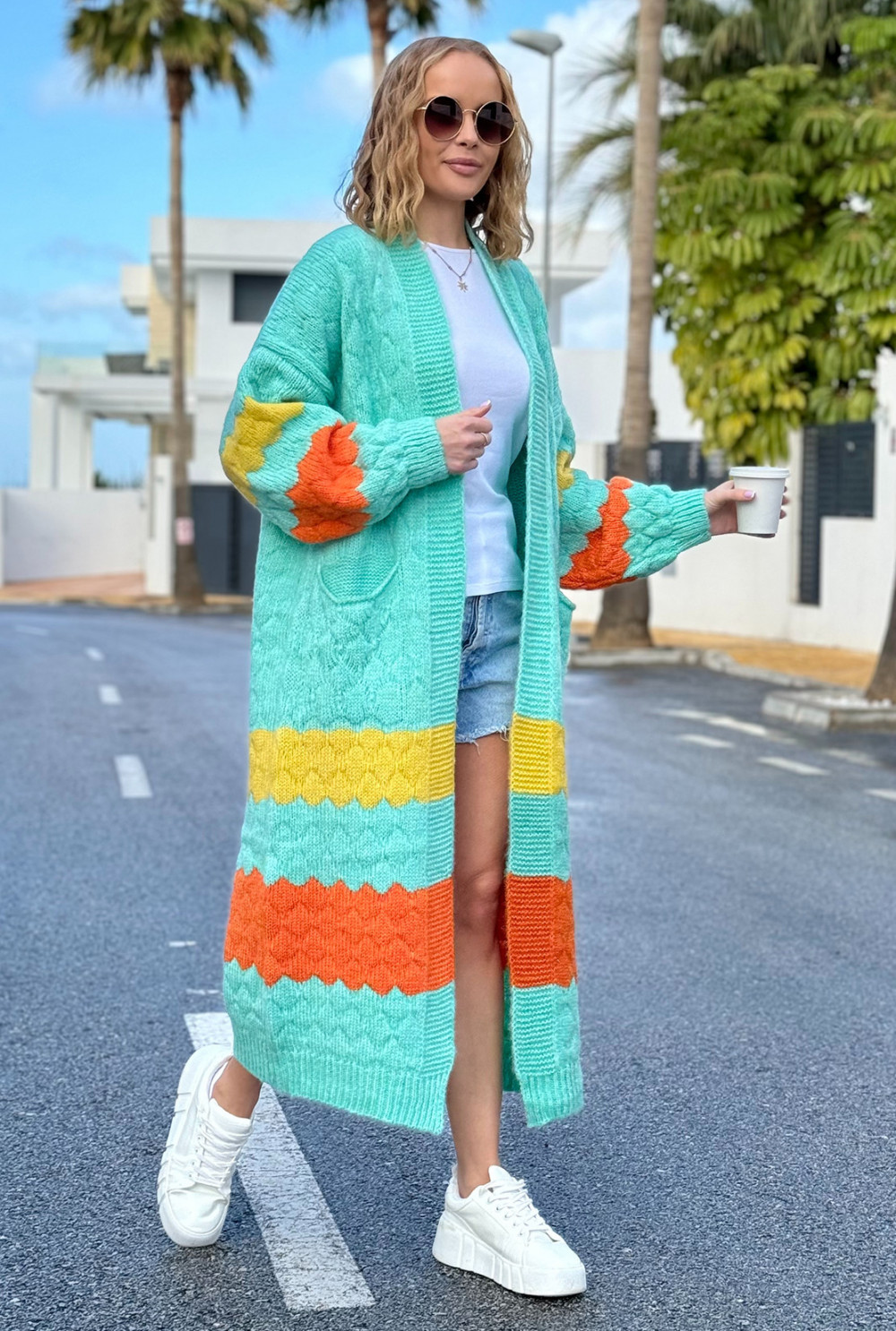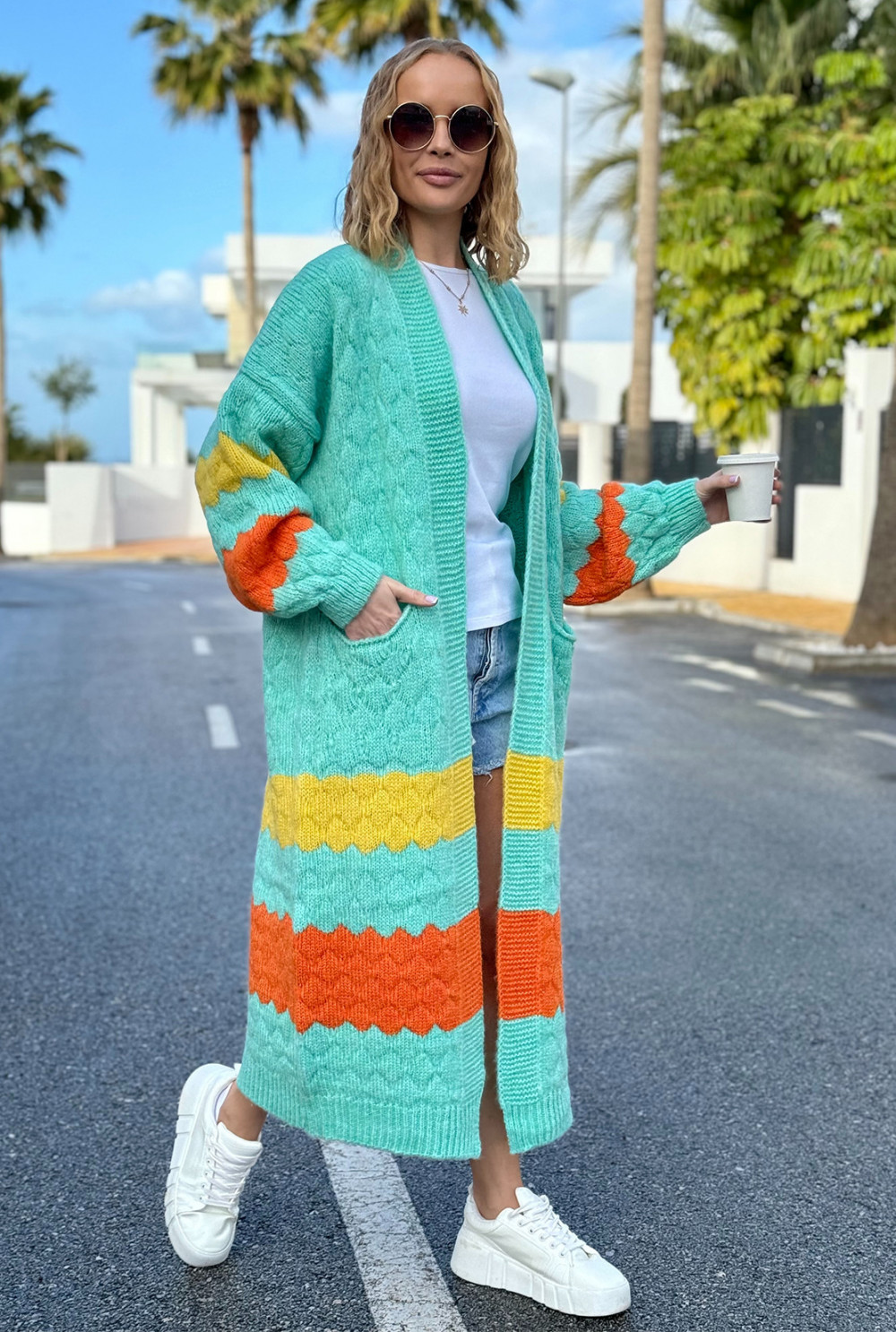 Długi kardigan o oversizowym kroju z domieszką wełny. Uroku nadają mu kolorowe pasy. Model posiada praktyczne kieszenie z przodu. Na rękawach zakończony jest ściągaczami. Dostępny w wielu wersjach kolorystycznych.