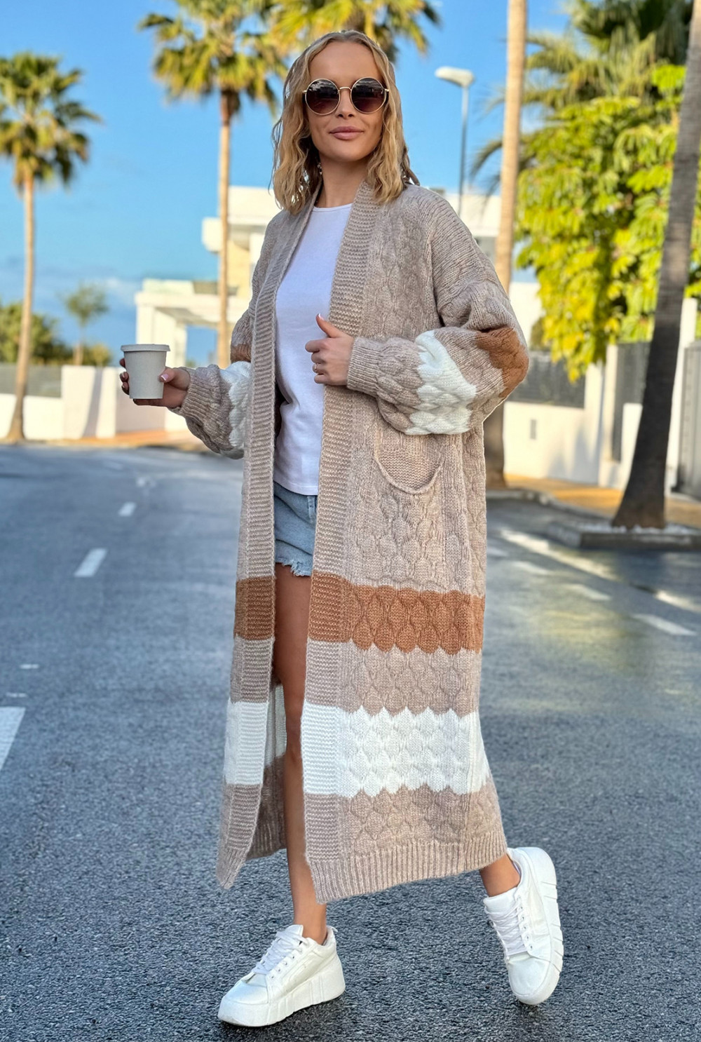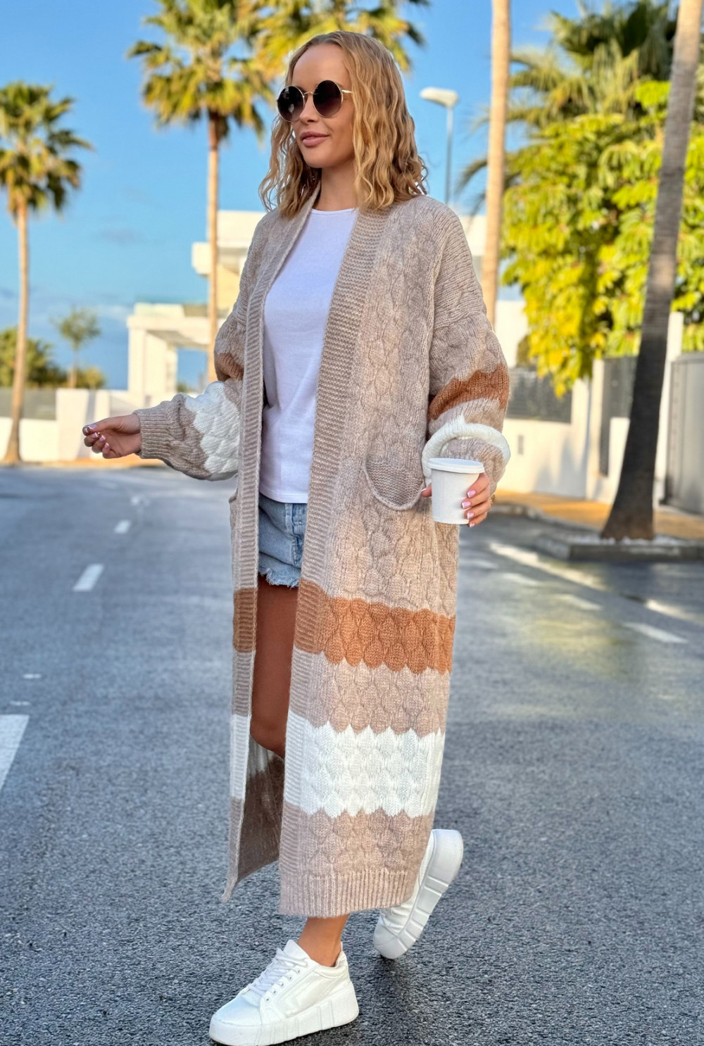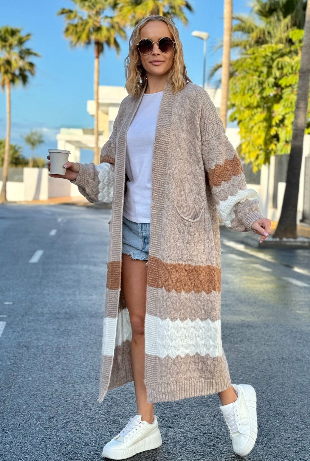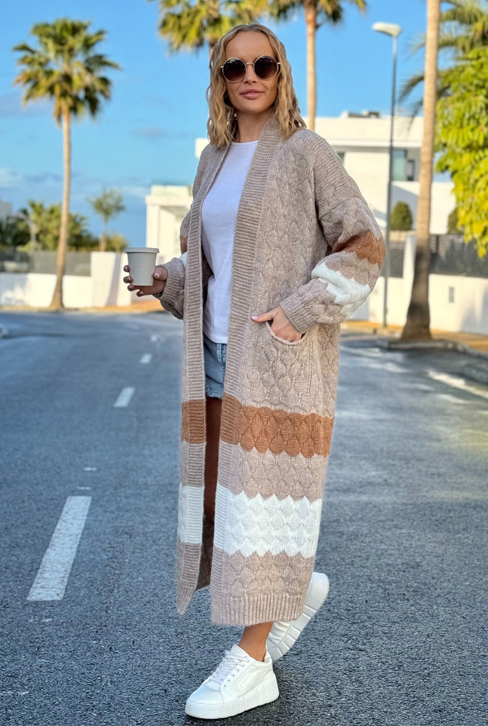 Długi kolorowy kardigan z kieszeniami Lucy Beż