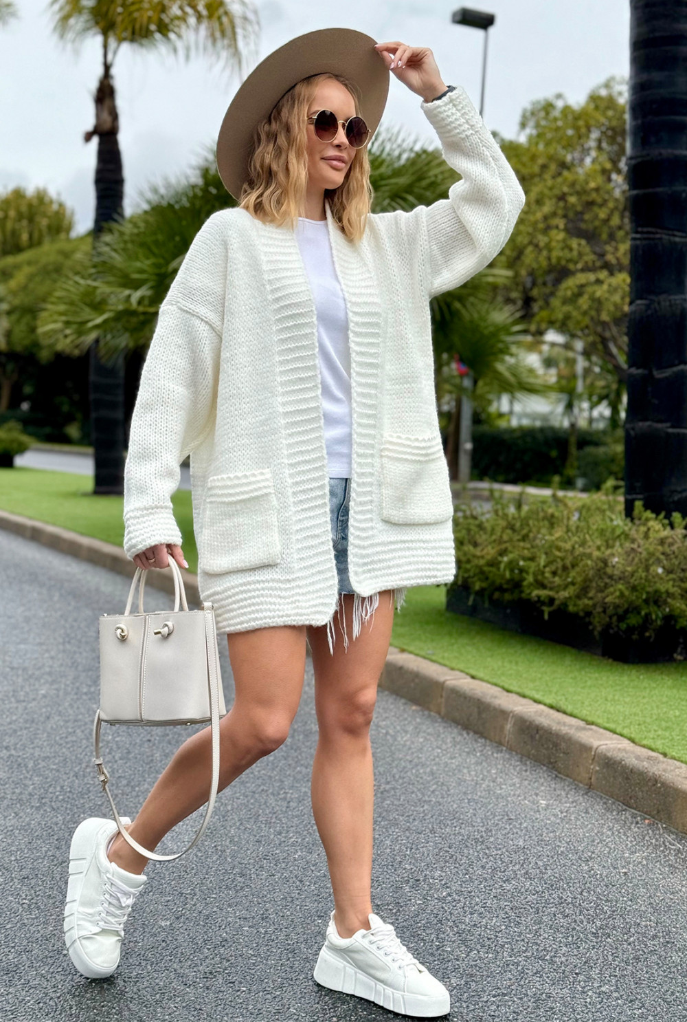 Miękki kardigan z domieszką wełny to doskonałe uzupełnienie codziennych looków. Model o nieco krótszym kroju oversize bez zapięcia. Posiada praktyczne kieszenie z przodu. Dostępny w wielu kolorach!