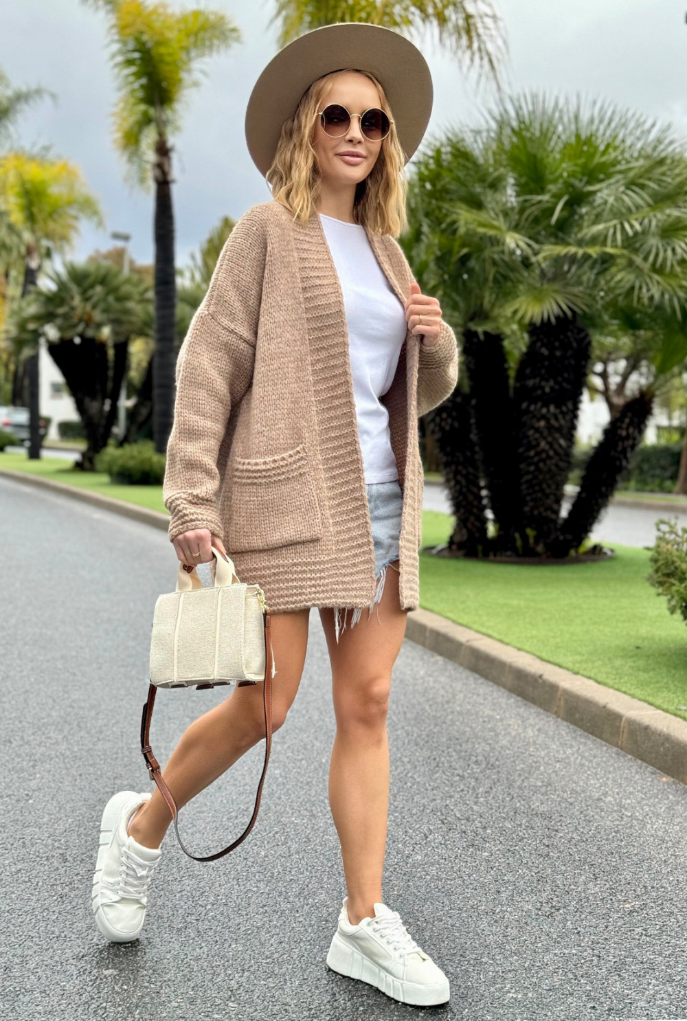 Miękki kardigan z domieszką wełny to doskonałe uzupełnienie codziennych looków. Model o nieco krótszym kroju oversize bez zapięcia. Posiada praktyczne kieszenie z przodu. Dostępny w wielu kolorach!