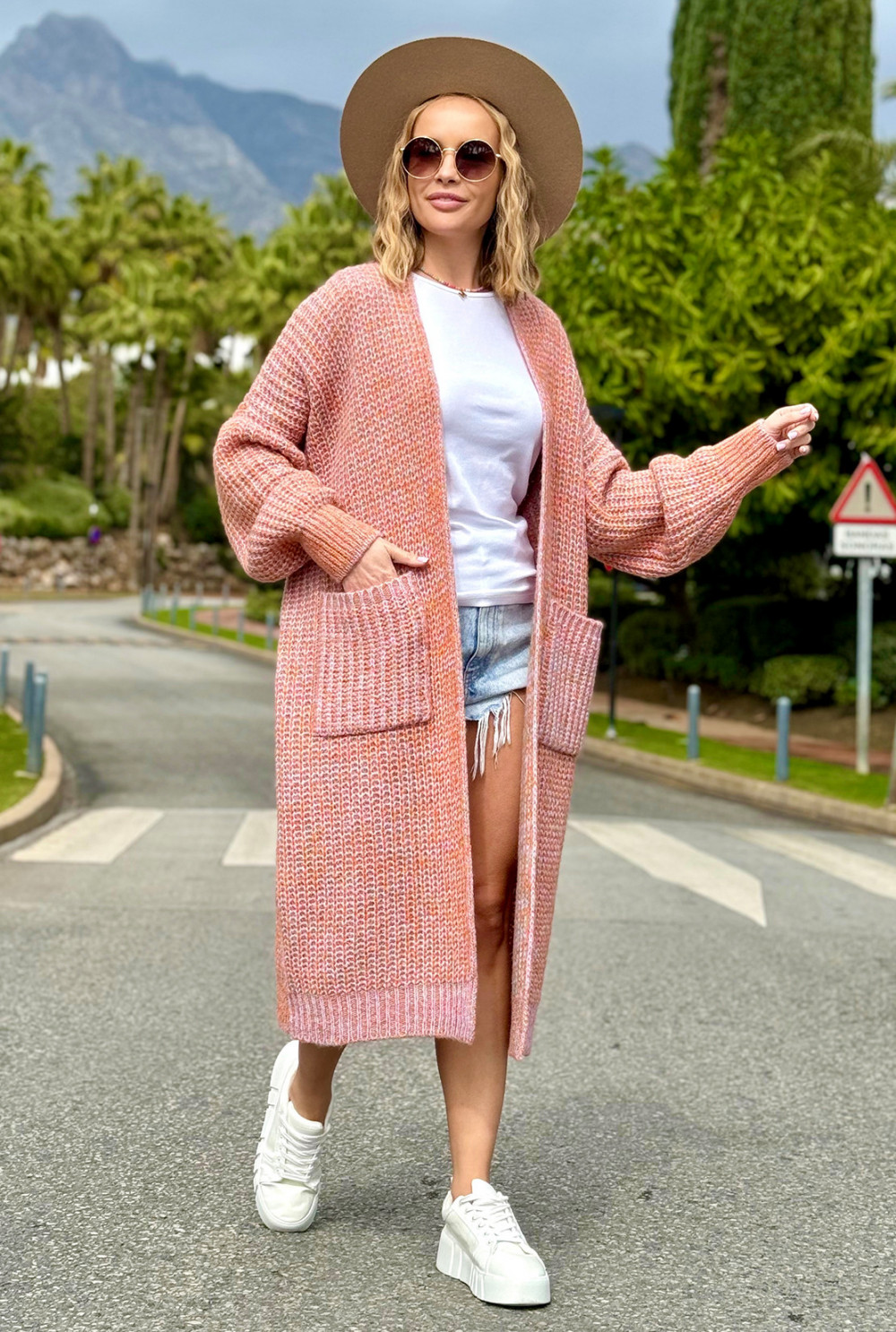 Długi kardigan oversize z kieszeniami Multicolor Pomarańcz-niebo