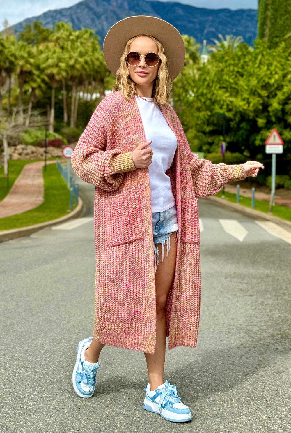 Długi kardigan oversize z kieszeniami Multicolor Fuksja-limonka