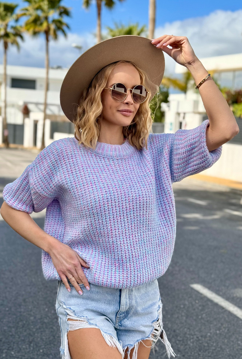 Miękki sweter to propozycja doskonała do codziennych looków!. Model o lekko oversizowym fasonie z zaokrąglonym dekoltem. Krótkie rękawki i dół wykończone zostały ściągaczami.