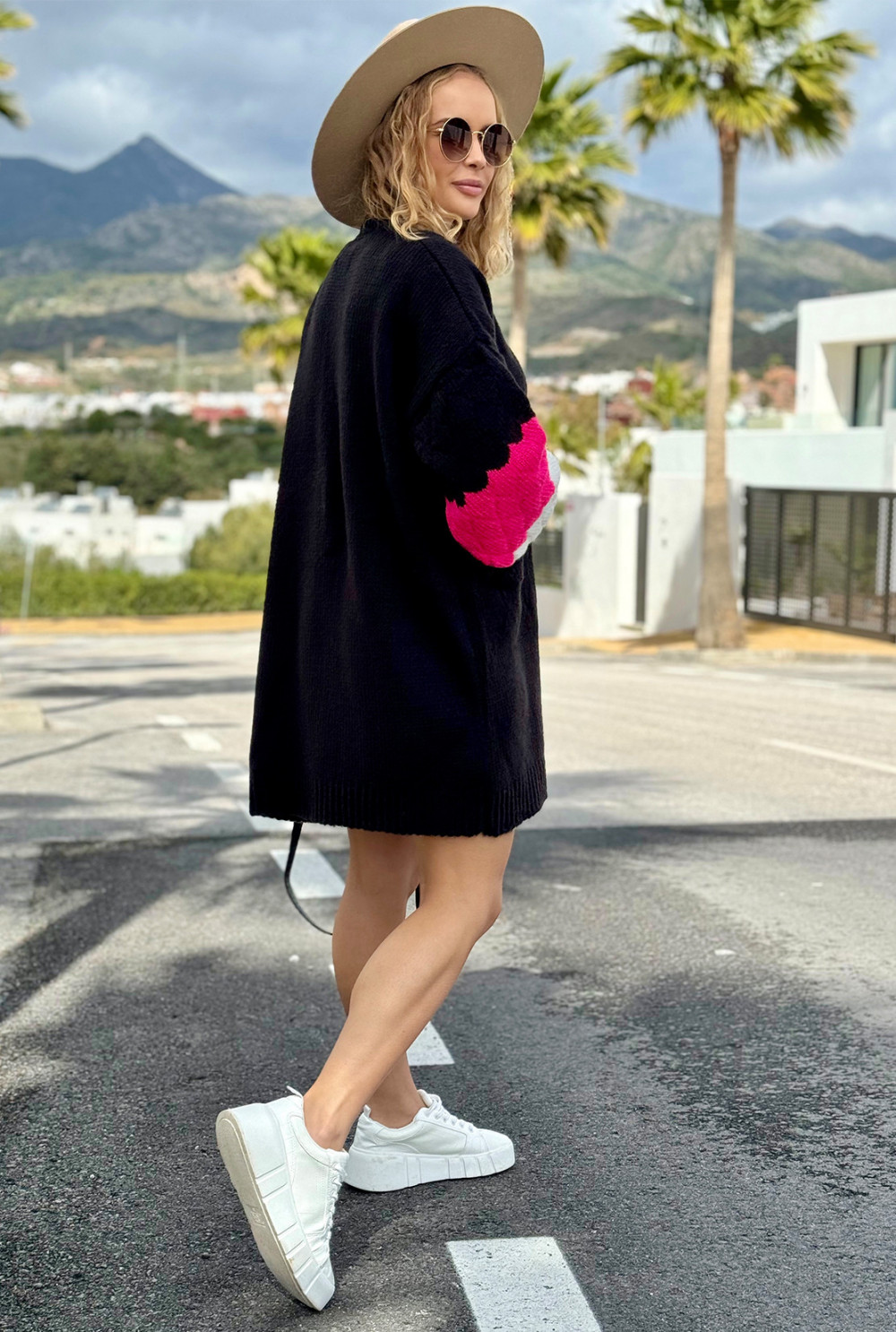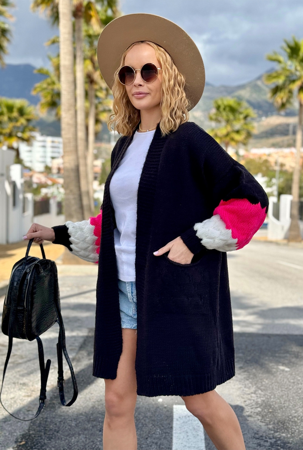 Kardigan o oversizowym kroju z domieszką wełny. Uroku nadają mu kolorowe pasy na rękawach. Model posiada praktyczne kieszenie z przodu. Na rękawach zakończony jest ściągaczami. Dostępny w wielu wersjach kolorystycznych.