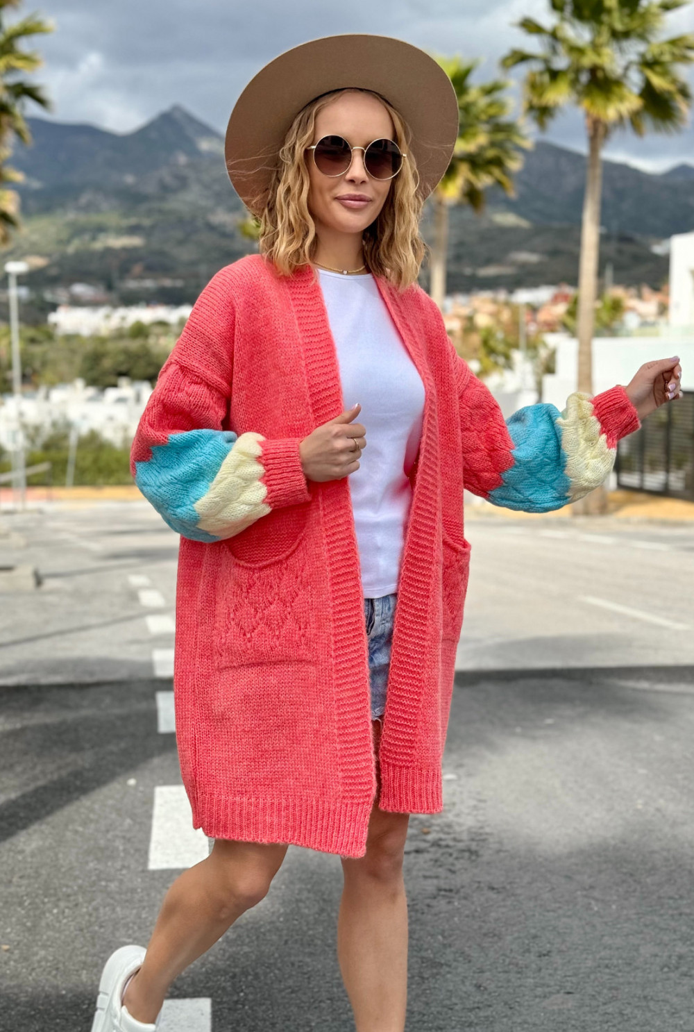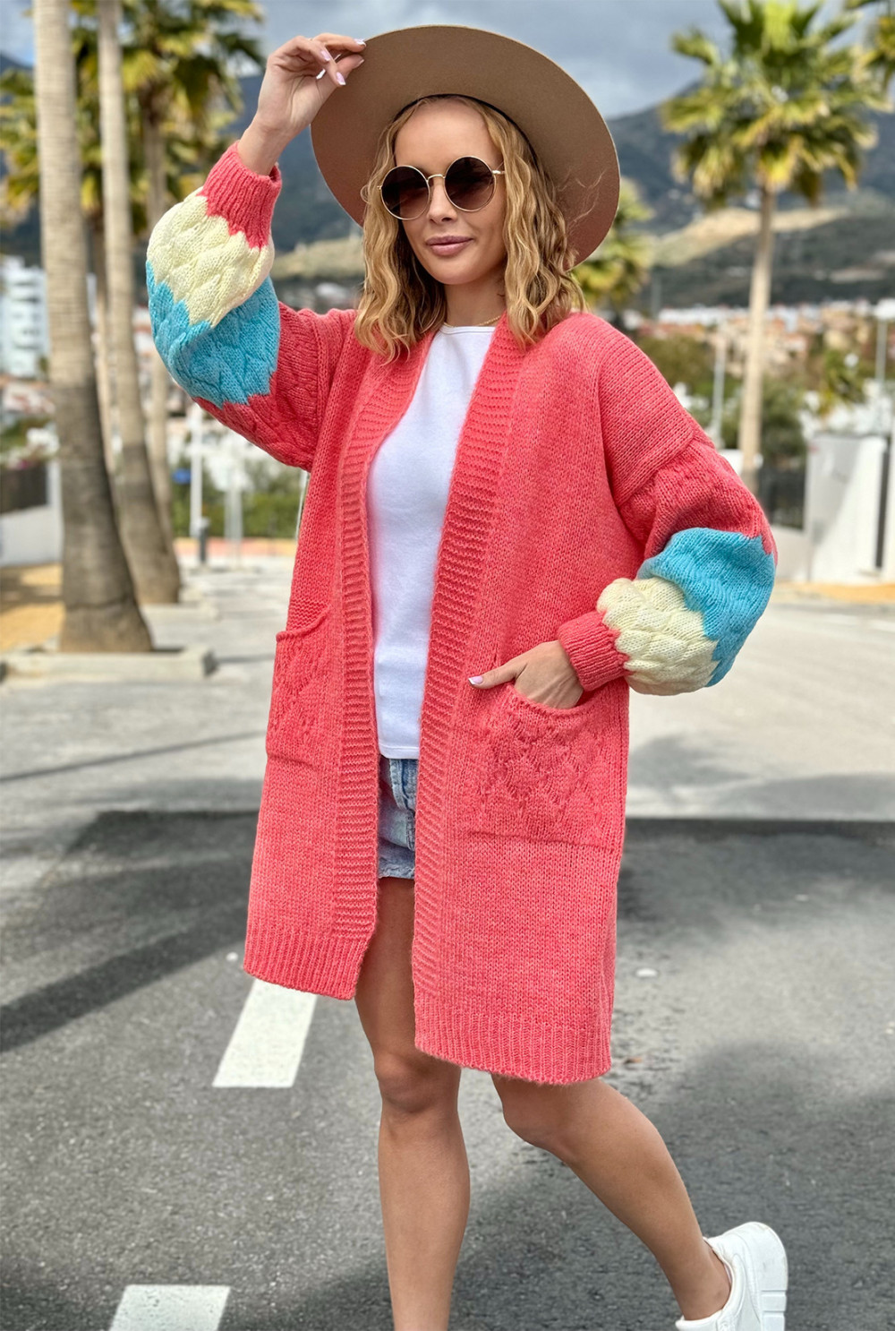 Kardigan o oversizowym kroju z domieszką wełny. Uroku nadają mu kolorowe pasy na rękawach. Model posiada praktyczne kieszenie z przodu. Na rękawach zakończony jest ściągaczami. Dostępny w wielu wersjach kolorystycznych.