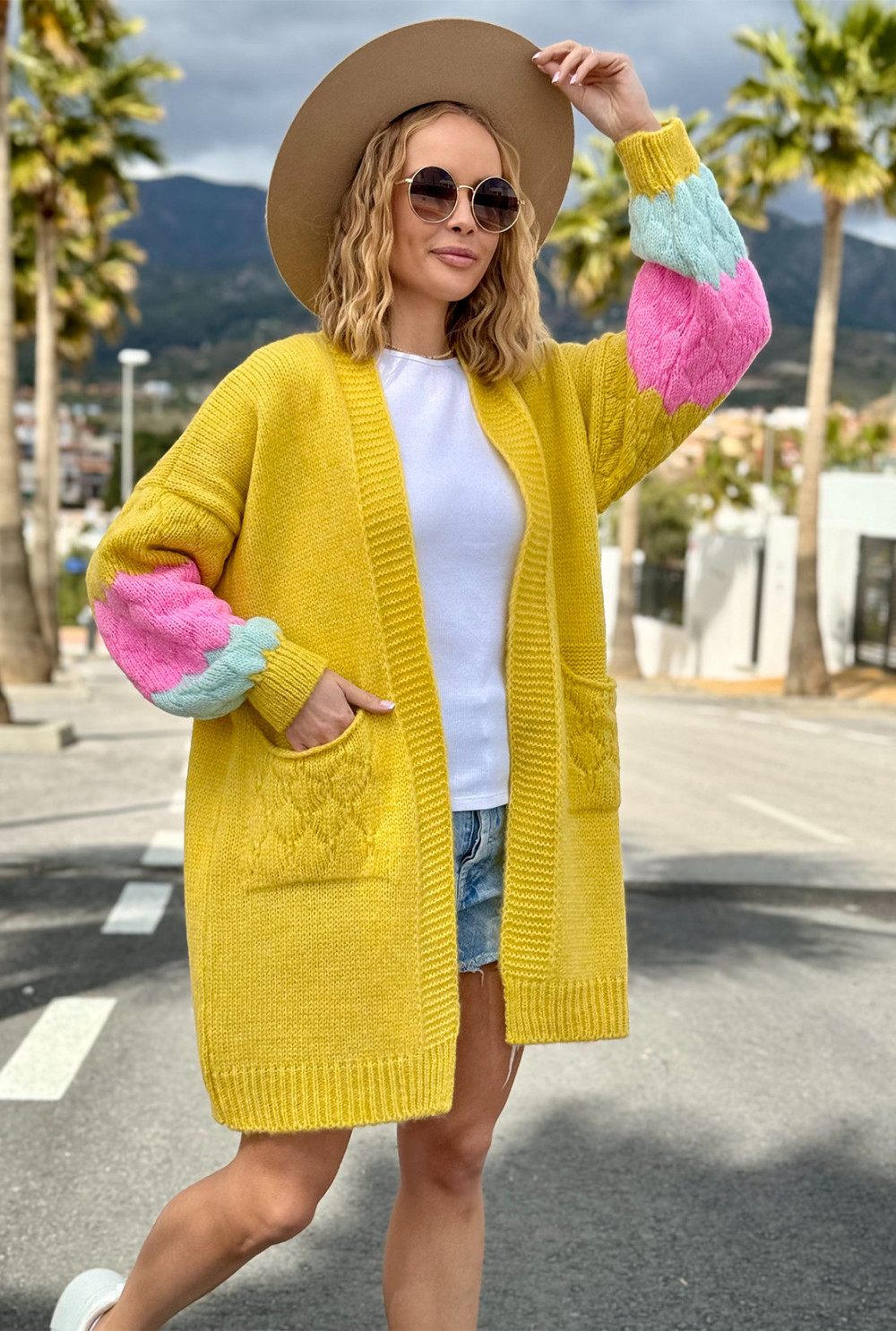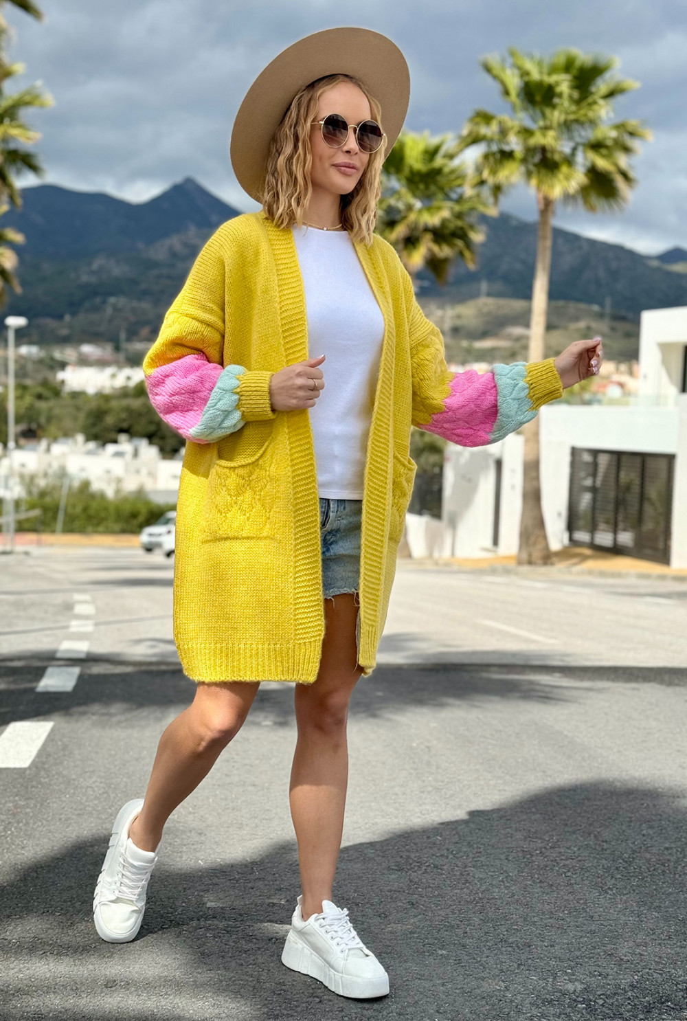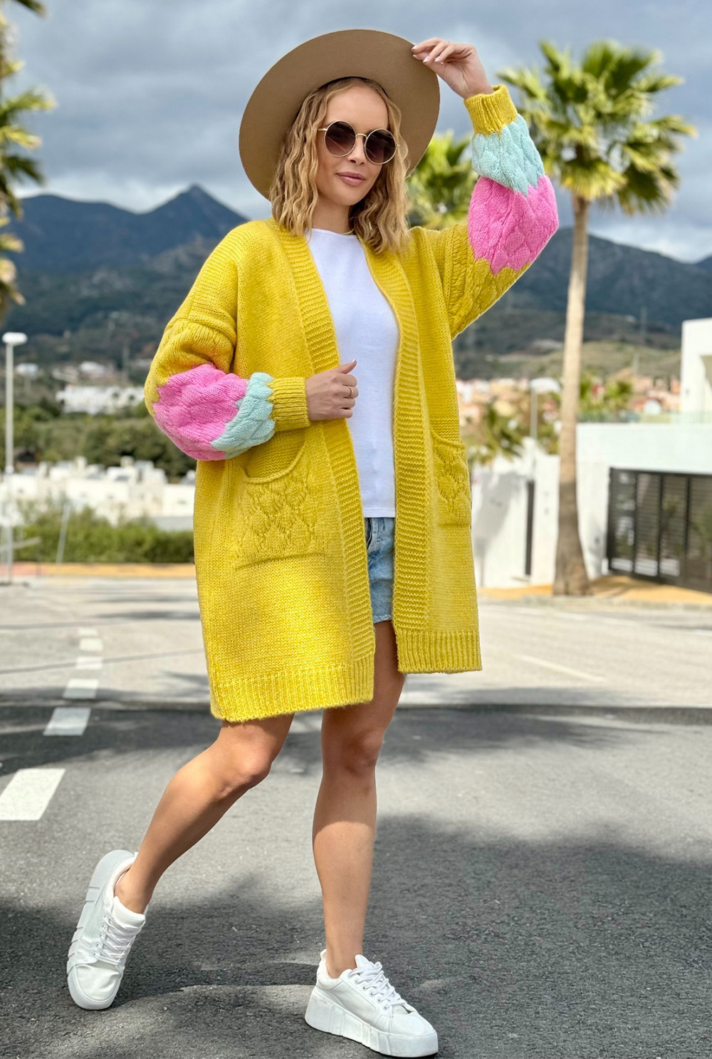 Kardigan o oversizowym kroju z domieszką wełny. Uroku nadają mu kolorowe pasy na rękawach. Model posiada praktyczne kieszenie z przodu. Na rękawach zakończony jest ściągaczami. Dostępny w wielu wersjach kolorystycznych.