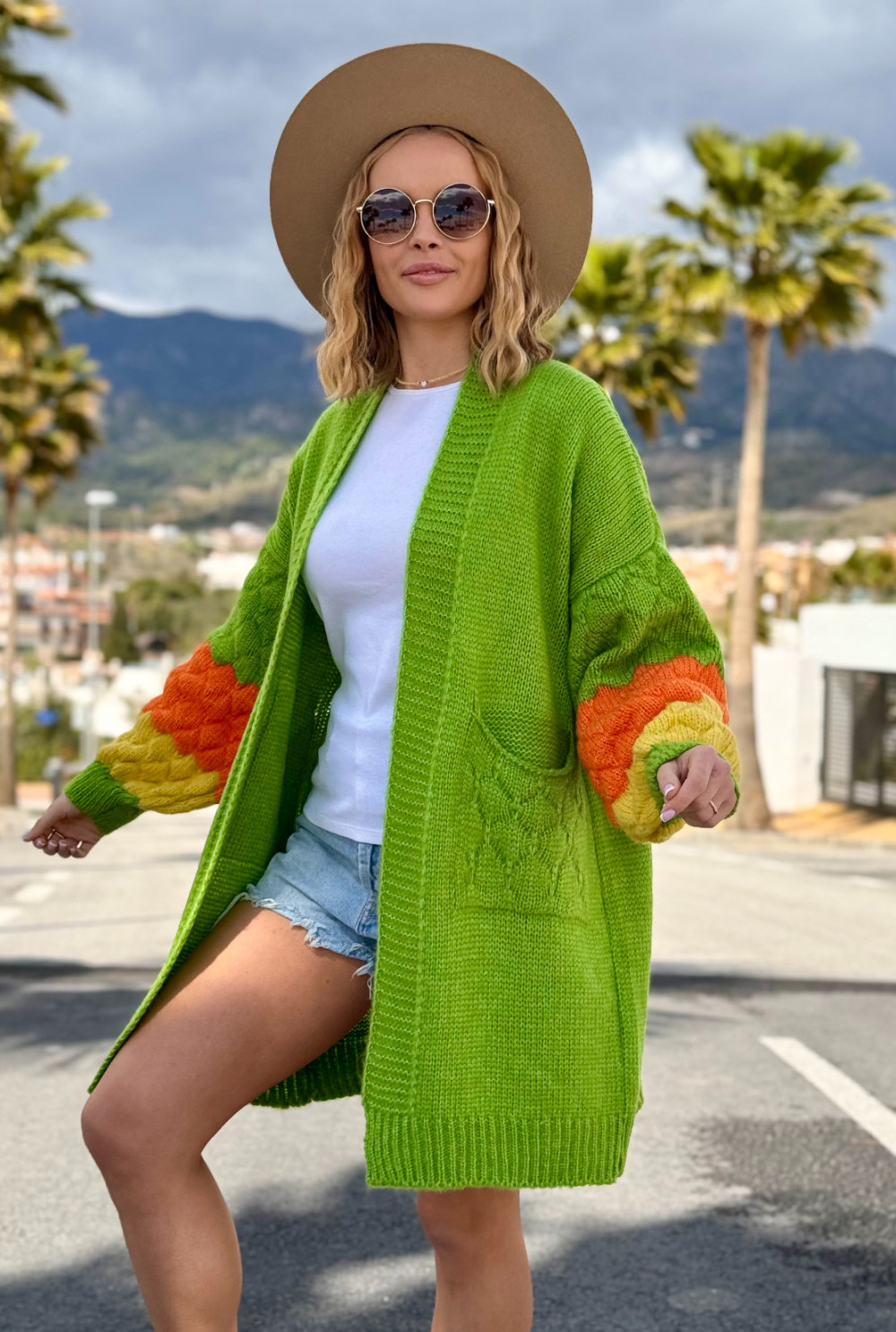 Kardigan o oversizowym kroju z domieszką wełny. Uroku nadają mu kolorowe pasy na rękawach. Model posiada praktyczne kieszenie z przodu. Na rękawach zakończony jest ściągaczami. Dostępny w wielu wersjach kolorystycznych.