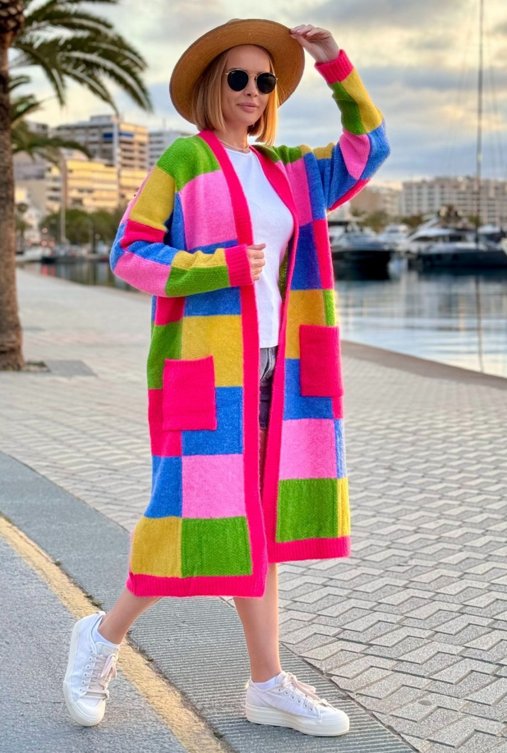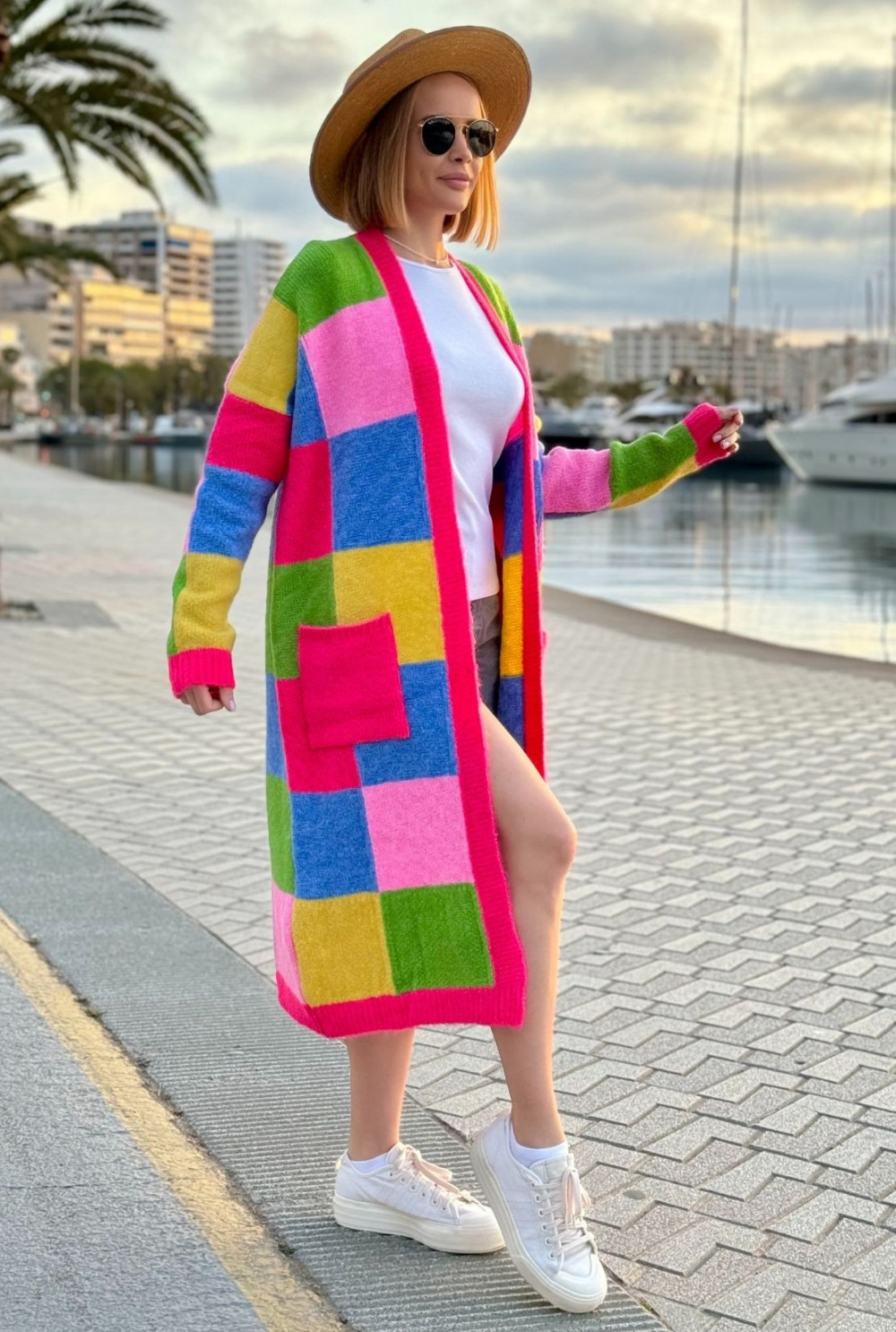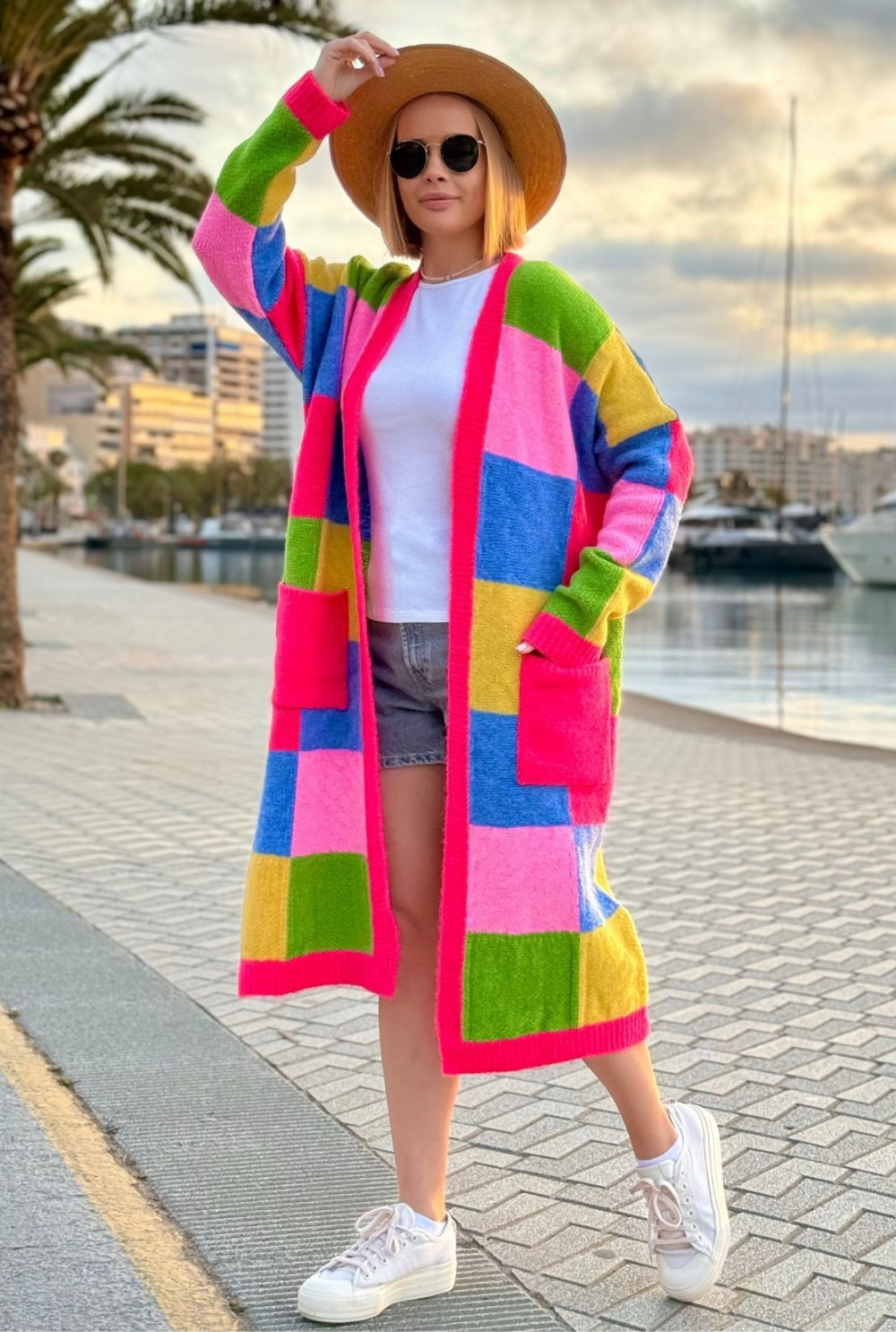 Długi kolorowy kardigan z kieszeniami Valeria Fuksja-trawa