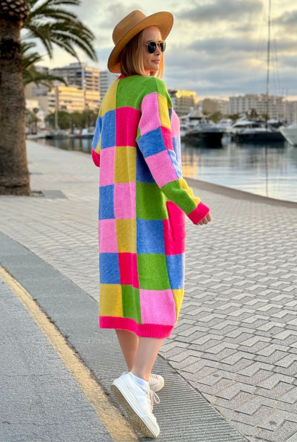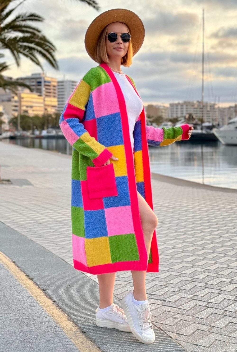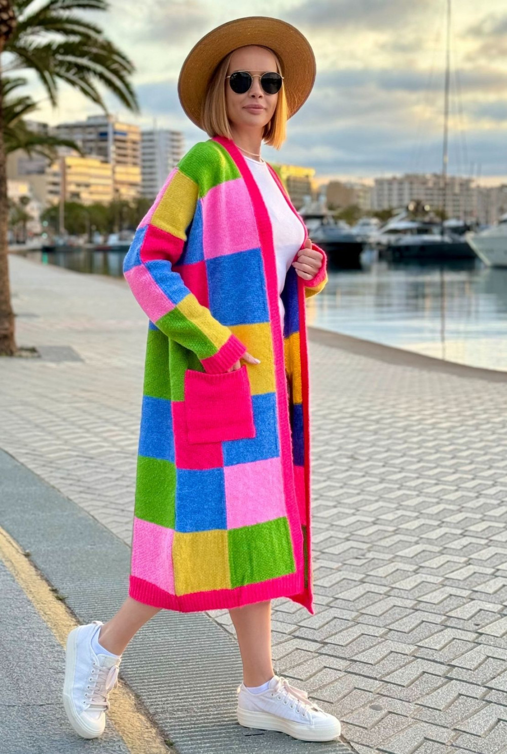 Długi kolorowy kardigan z kieszeniami Valeria Fuksja-trawa