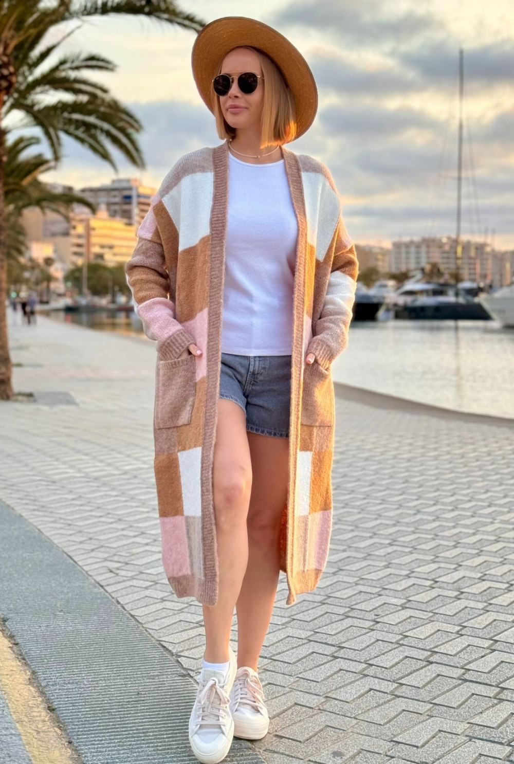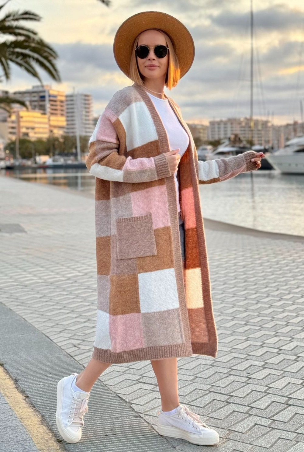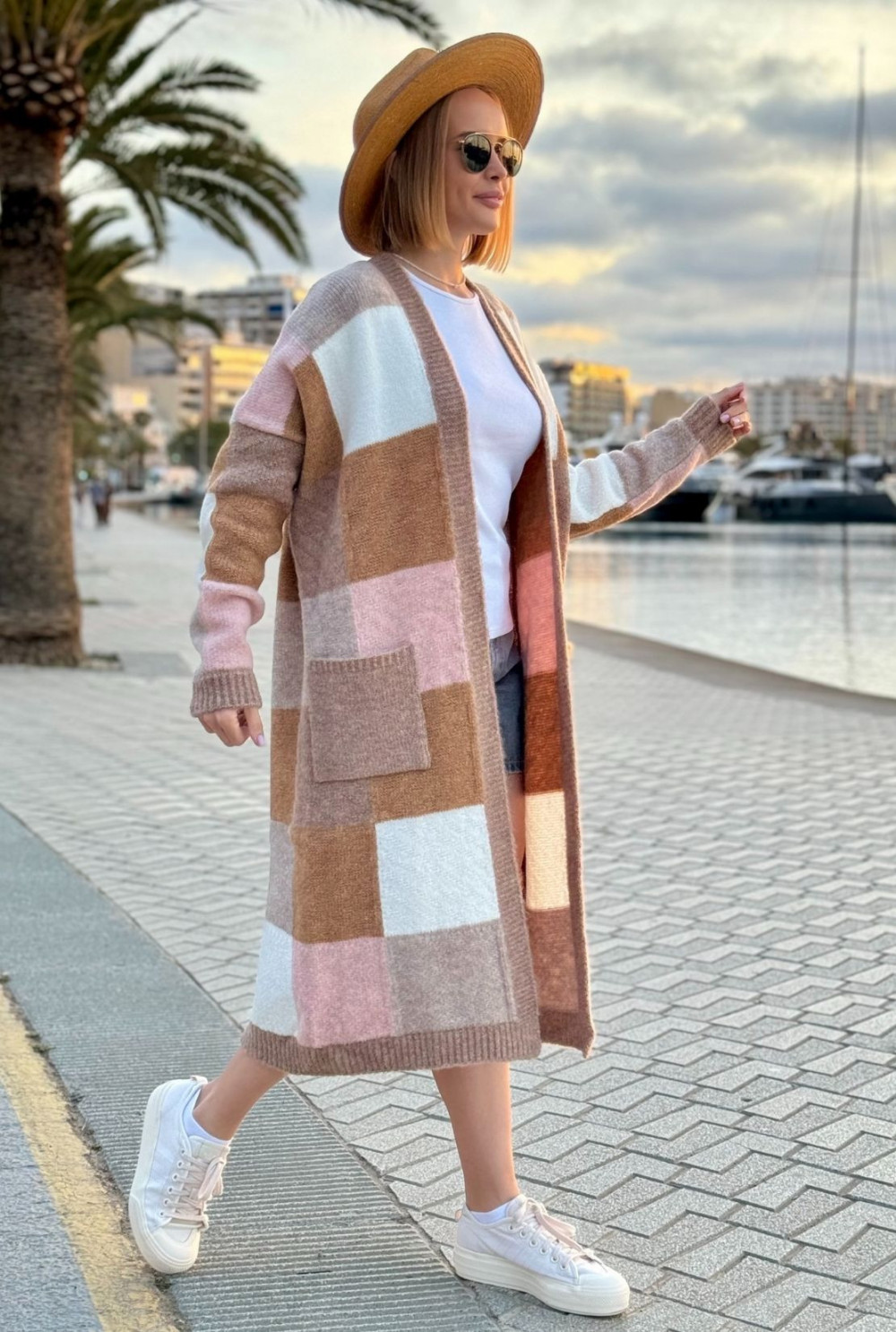 Długi kolorowy kardigan z kieszeniami Valeria Latte-beż