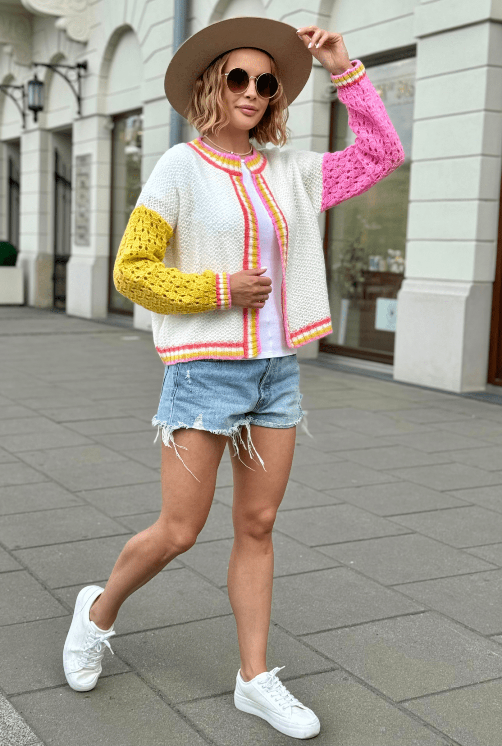 Krótki, kolorowy kardigan wykonany z wysokiej jakości materiału z domieszką wełny, to idealna propozycja do codziennych stylizacji. Model wyróżnia się ażurowymi rękawami. Dostępny w wielu wariantach kolorystycznych!