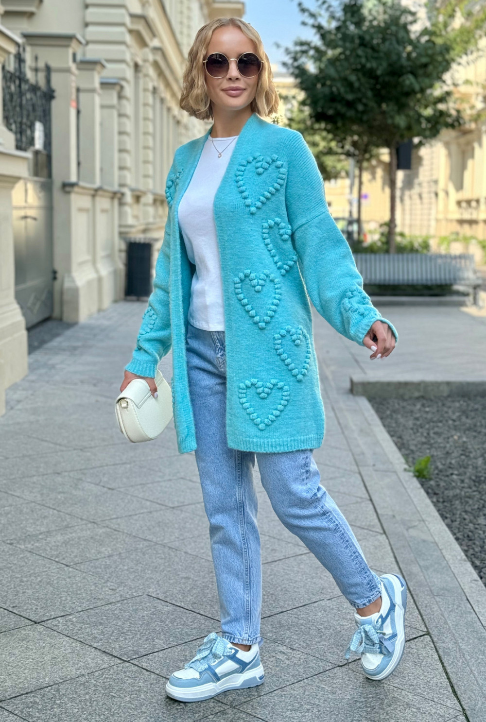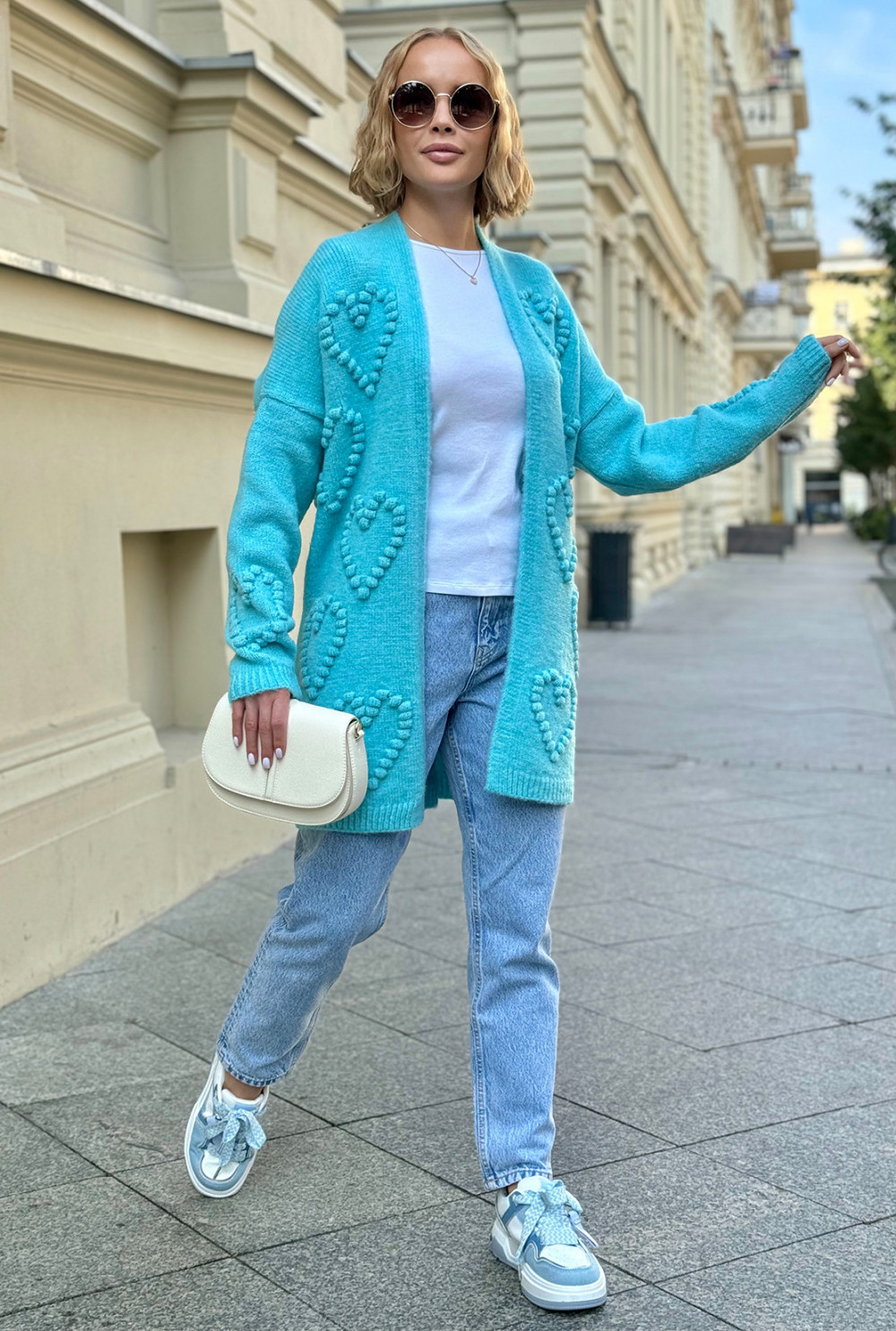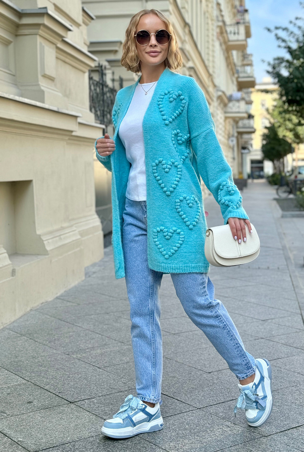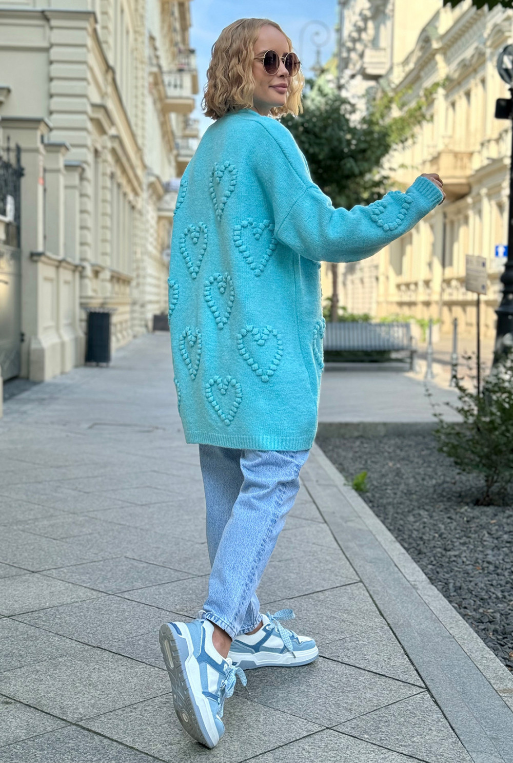 Niepowtarzalny kardigan to propozycja stworzona z myślą o chłodniejszych dniach. Wyróżnia się wypukłymi sercami, co dodaje mu wyjątkowego, romantycznego charakteru. To model o oversizowym fasonie z długimi rękawami, które zakończone zostały ściągaczami.