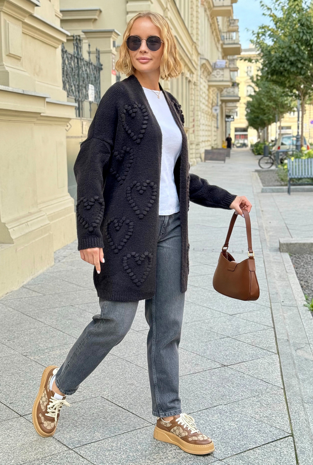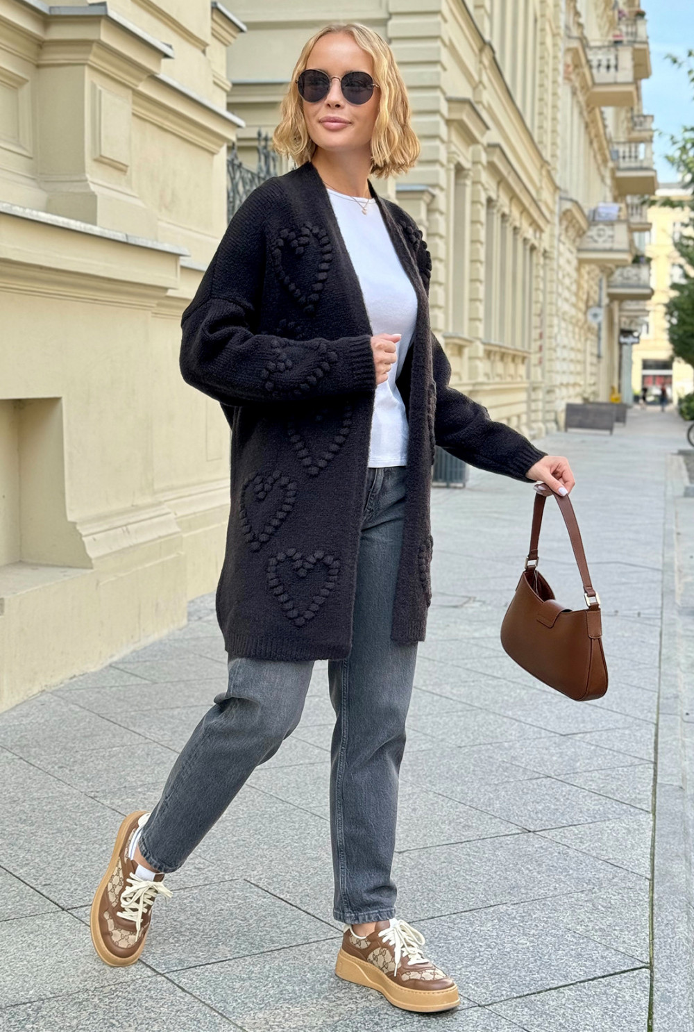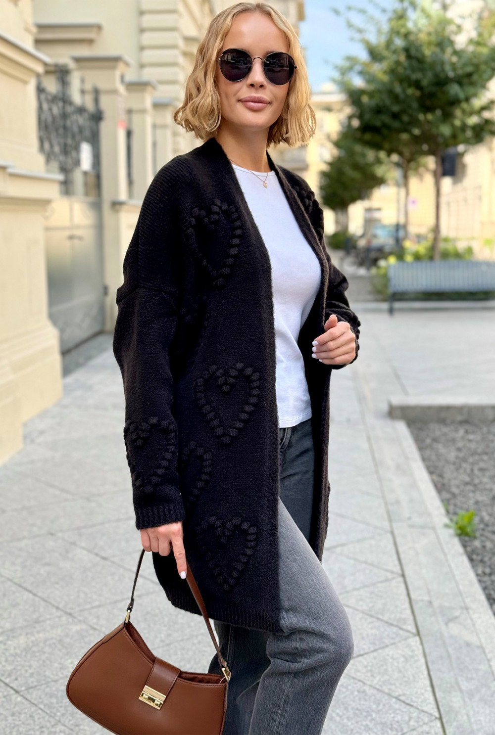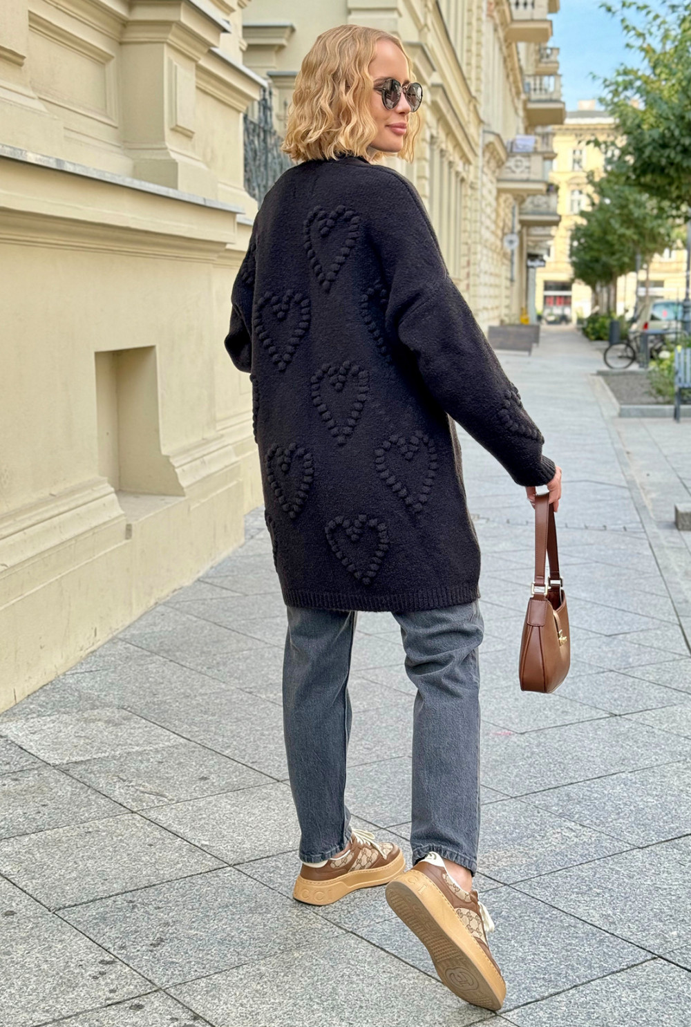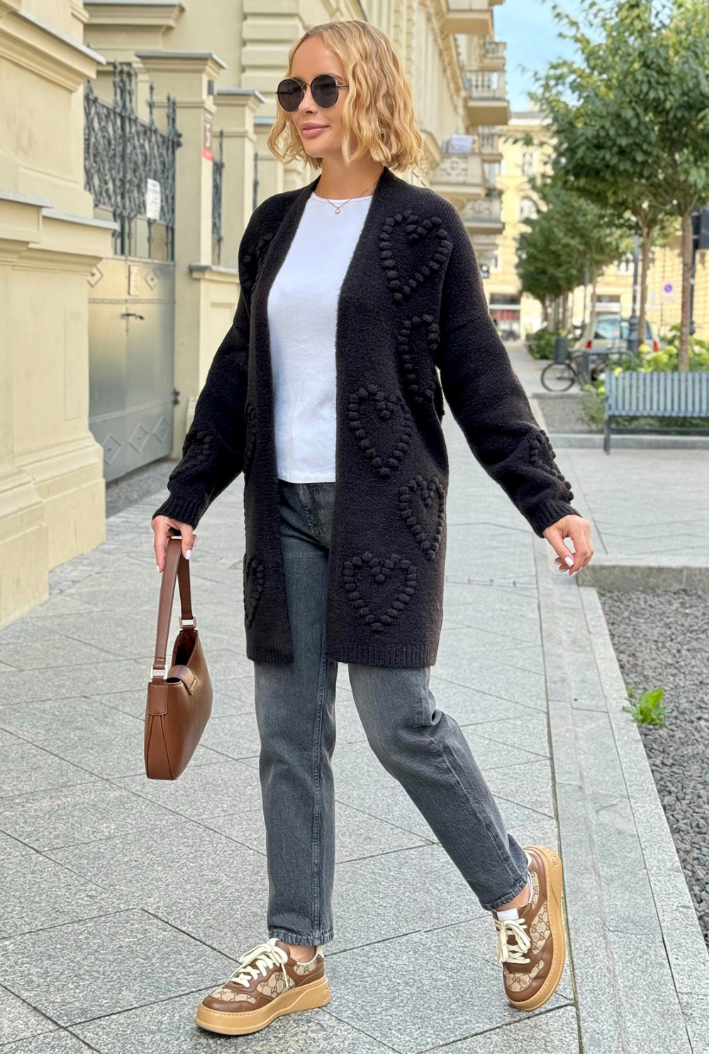 Niepowtarzalny kardigan to propozycja stworzona z myślą o chłodniejszych dniach. Wyróżnia się wypukłymi sercami, co dodaje mu wyjątkowego, romantycznego charakteru. To model o oversizowym fasonie z długimi rękawami, które zakończone zostały ściągaczami.