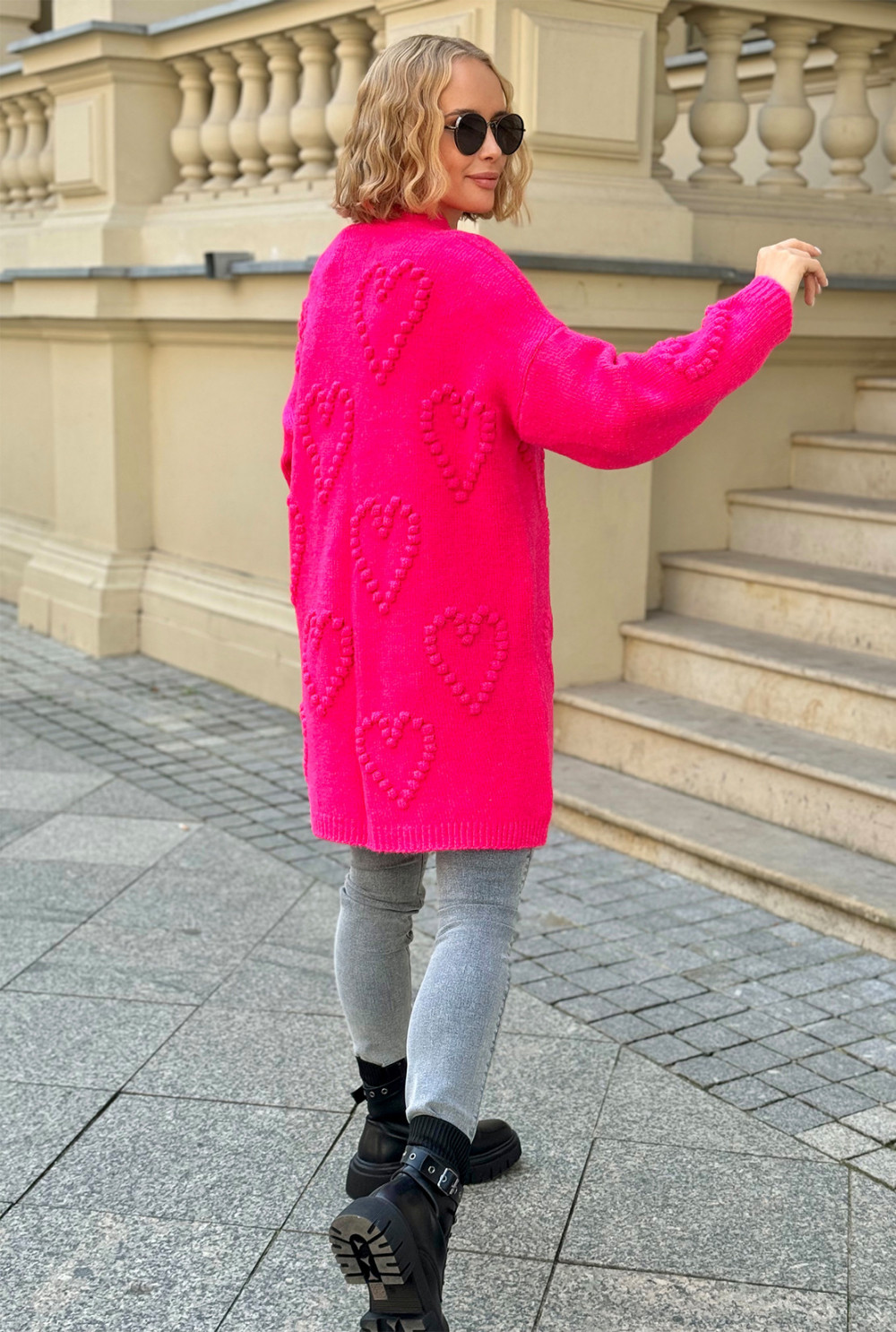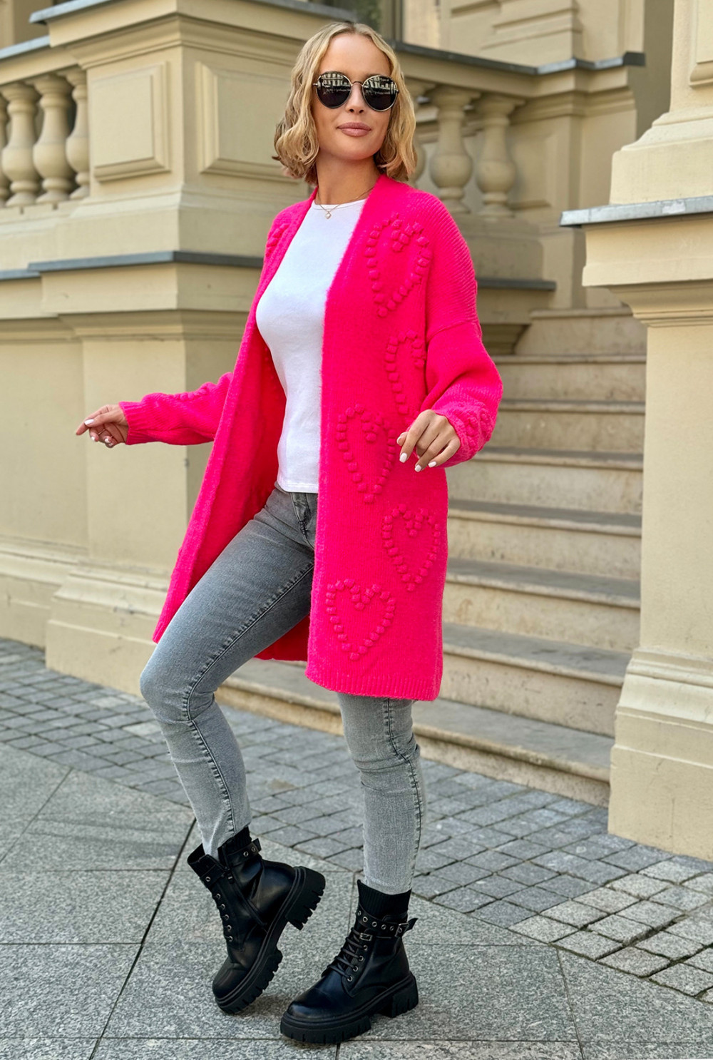 Niepowtarzalny kardigan to propozycja stworzona z myślą o chłodniejszych dniach. Wyróżnia się wypukłymi sercami, co dodaje mu wyjątkowego, romantycznego charakteru. To model o oversizowym fasonie z długimi rękawami, które zakończone zostały ściągaczami.