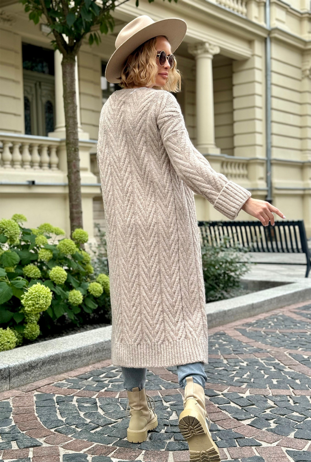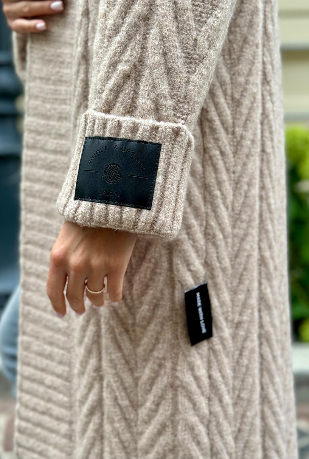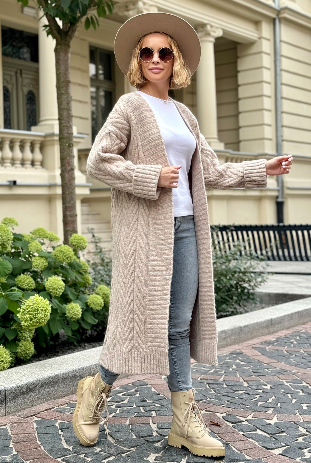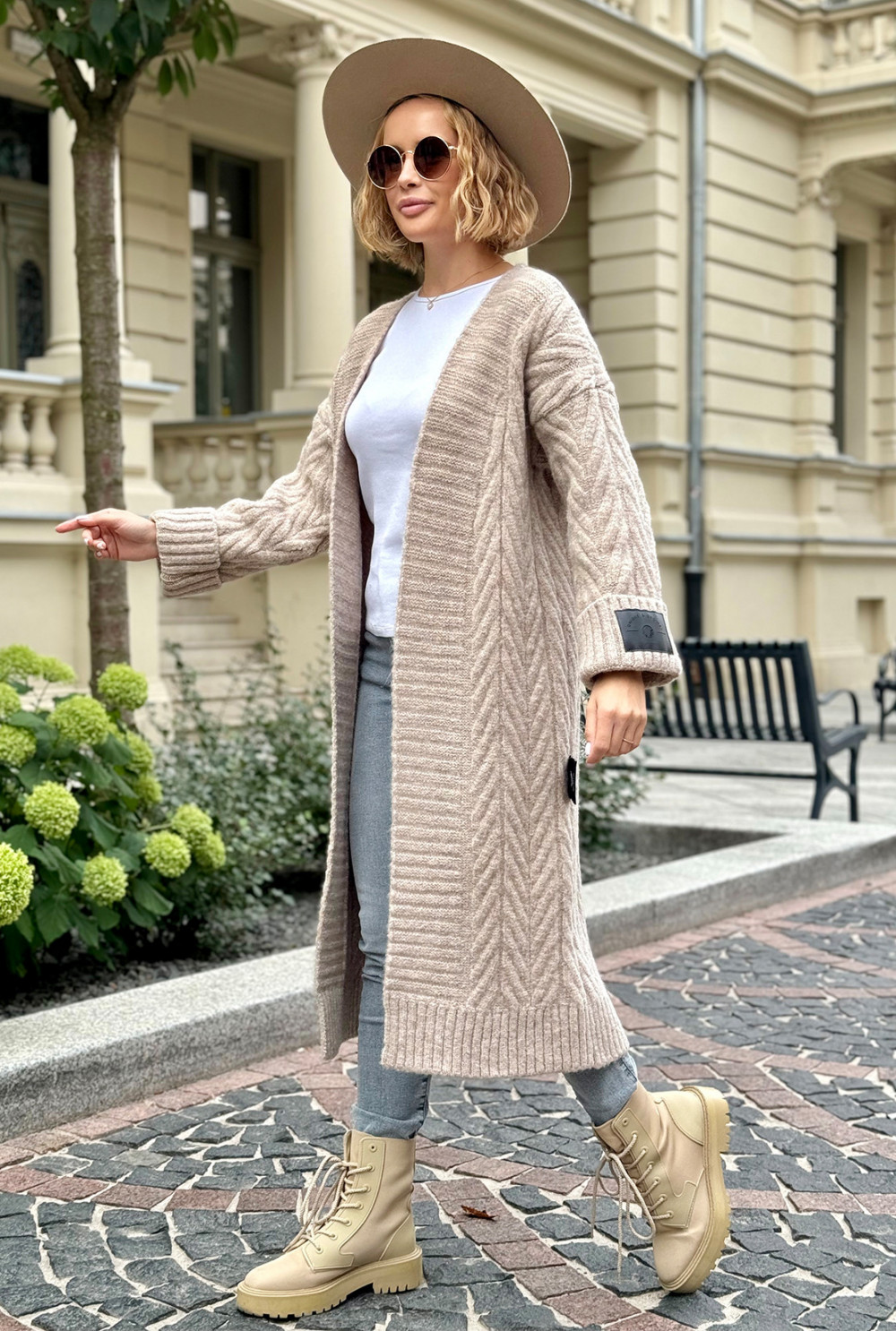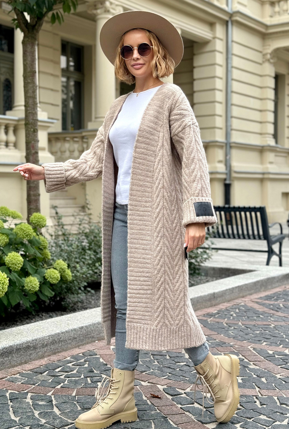 Oryginalny kardigan wykonany z warkoczowego splotu. Model posiada skórzaną naszywkę na rękawie. Ciepły i przyjemny w dotyku. Idealne uzupełnienie każdej stylizacji - dostępny w kilku kolorach!
