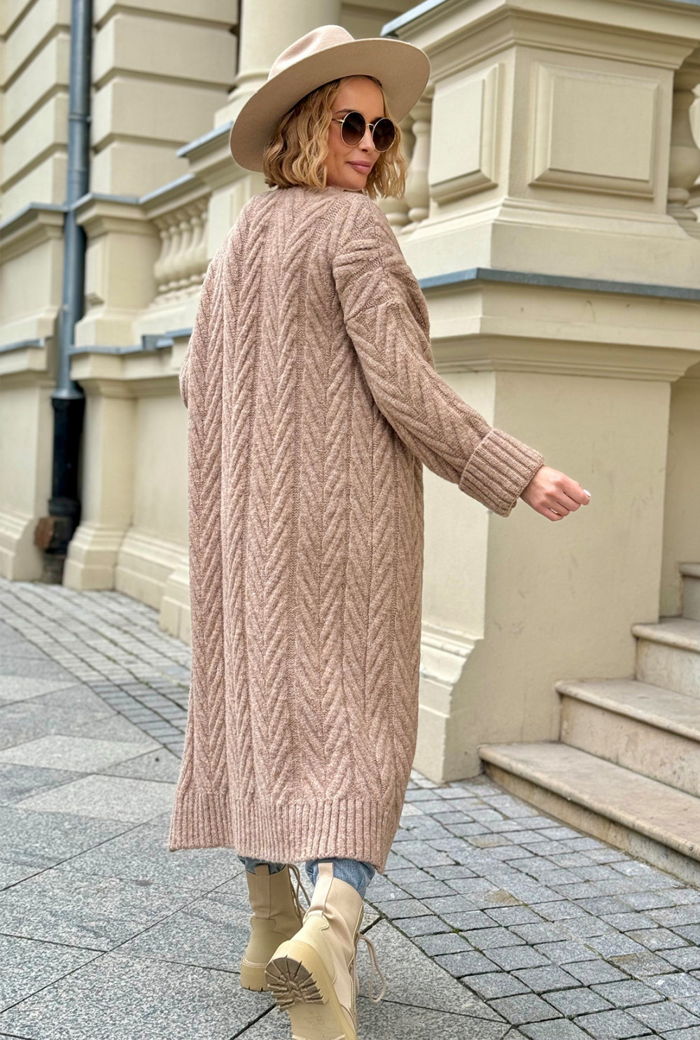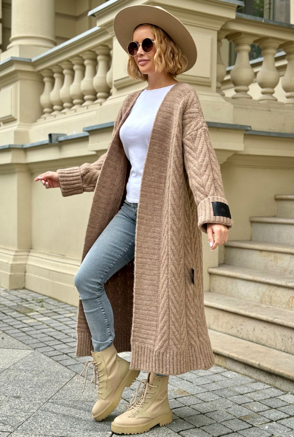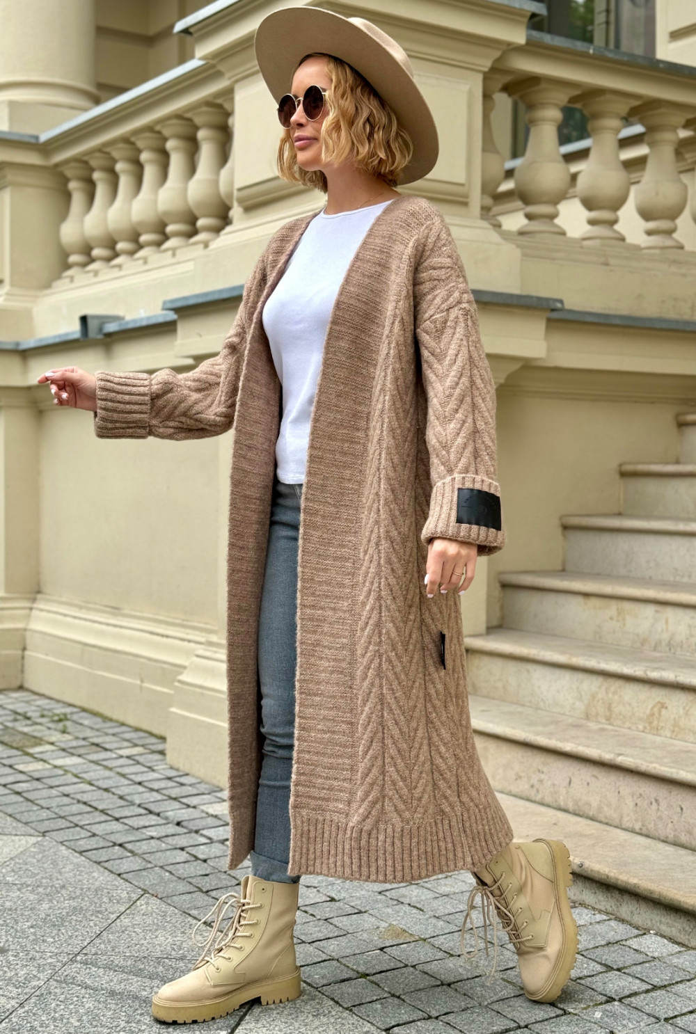 Oryginalny kardigan wykonany z warkoczowego splotu. Model posiada skórzaną naszywkę na rękawie. Ciepły i przyjemny w dotyku. Idealne uzupełnienie każdej stylizacji - dostępny w kilku kolorach!
