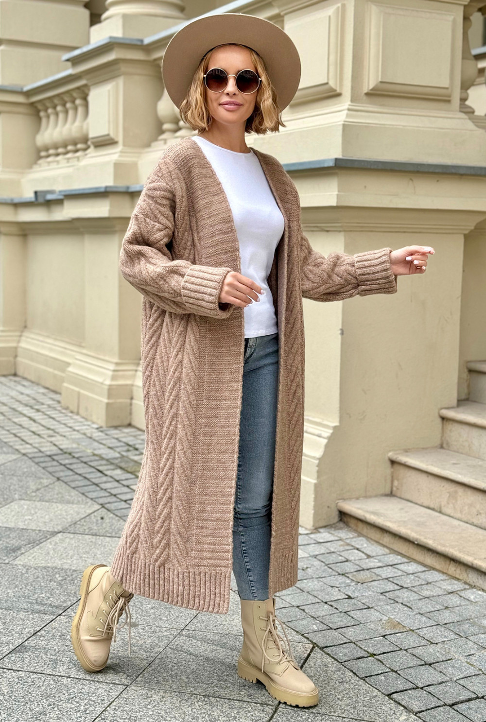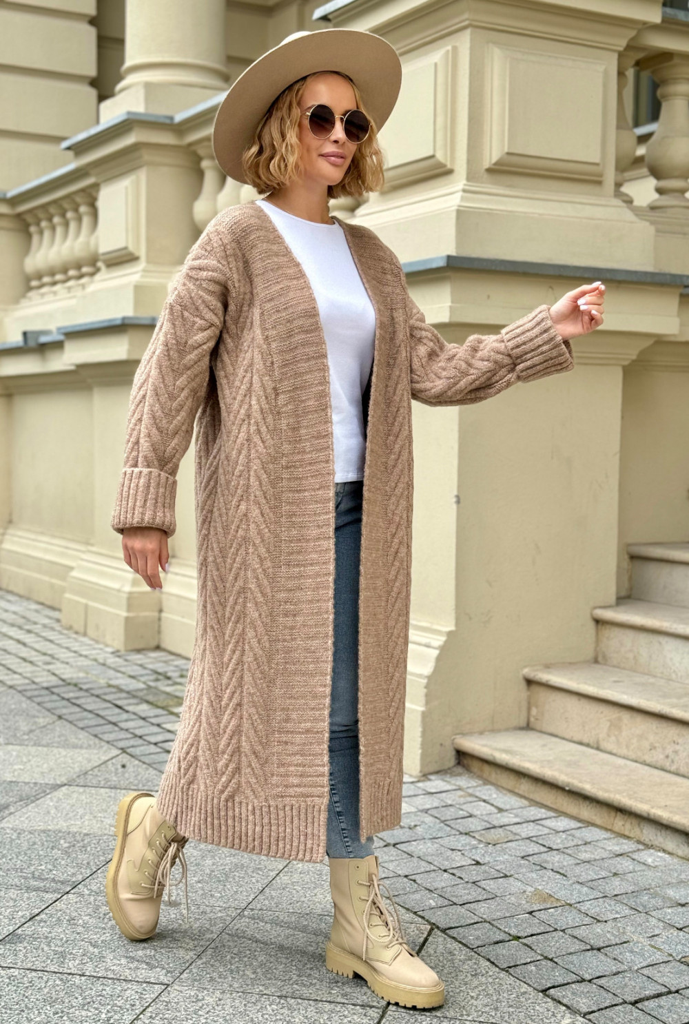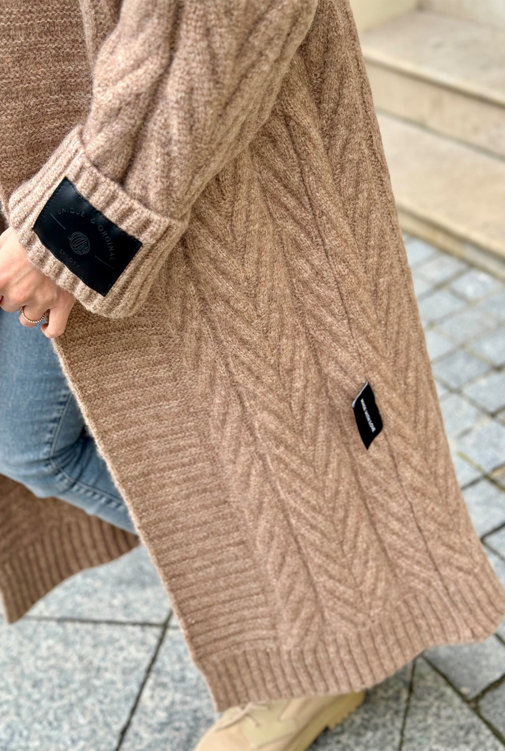 Oryginalny kardigan wykonany z warkoczowego splotu. Model posiada skórzaną naszywkę na rękawie. Ciepły i przyjemny w dotyku. Idealne uzupełnienie każdej stylizacji - dostępny w kilku kolorach!