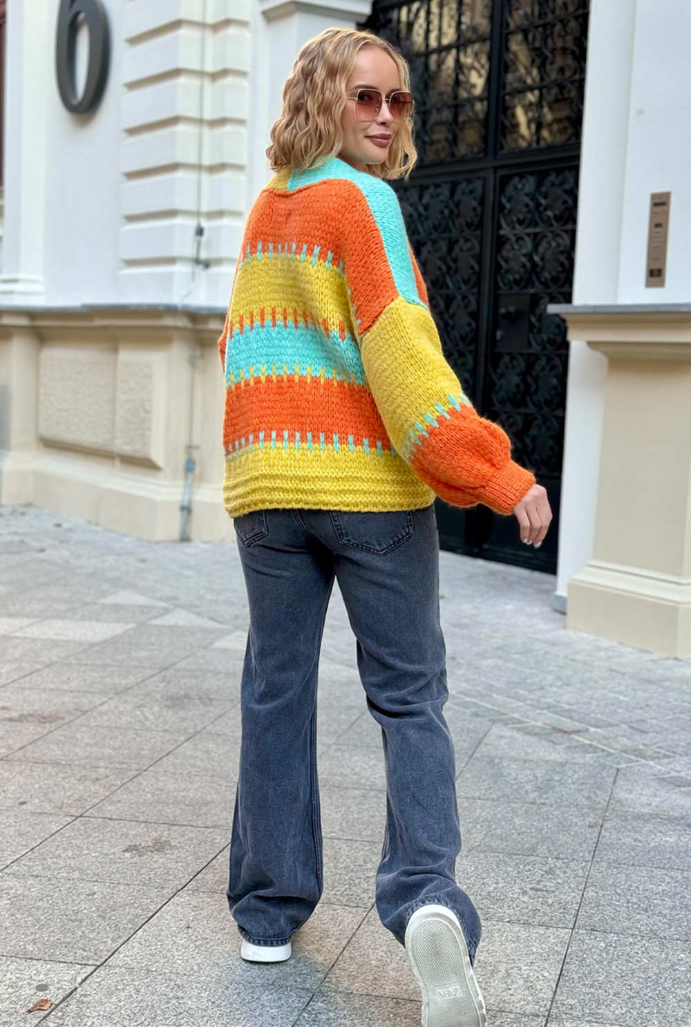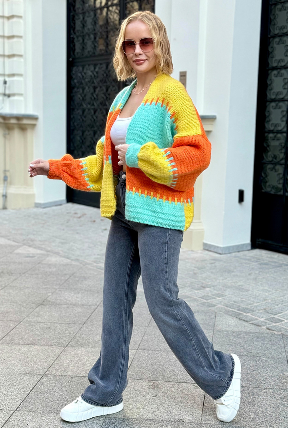 Kardigan z domieszką wełny to opcja, która fenomenalnie sprawdzi się w stylizacjach na chłodniejsze dni. Wyróżnia się oryginalnym połączeniem kolorystycznym, a także szerokimi rękawami, które zakończone zostały ściągaczami. To oversizowy kardigan o krótkim fasonie bez zapięcia.