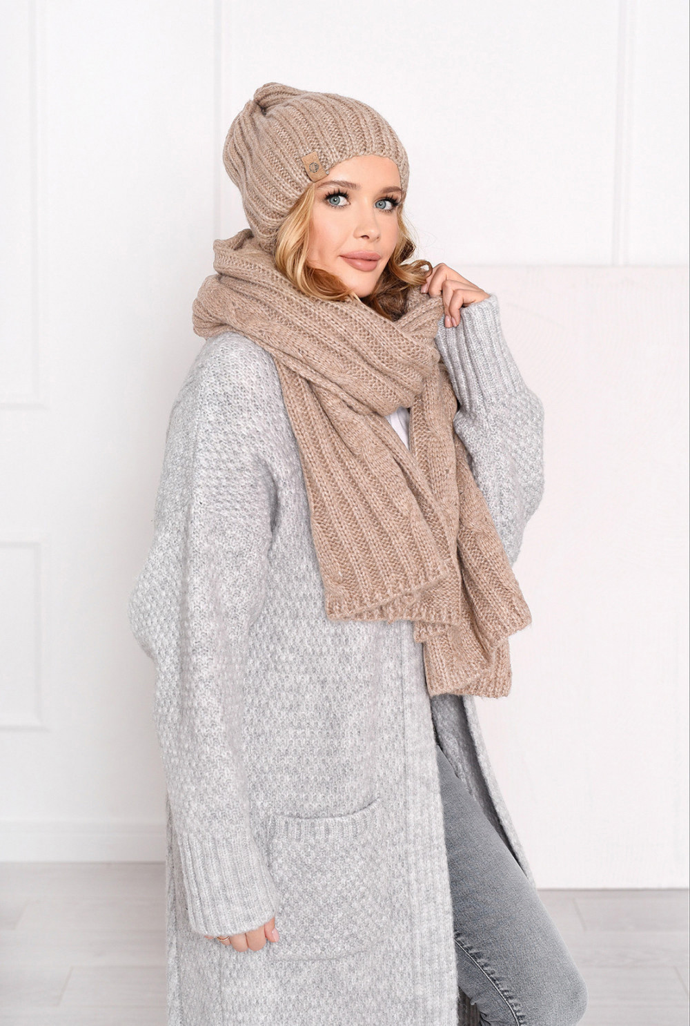 Ciepły komplet składający się z czapki i długiego szalika. Wykonany z wysokiej jakości materiałów. Ogrzeje Cię w chłodne dni i uzupełni Twój jesienno-zimowy look!