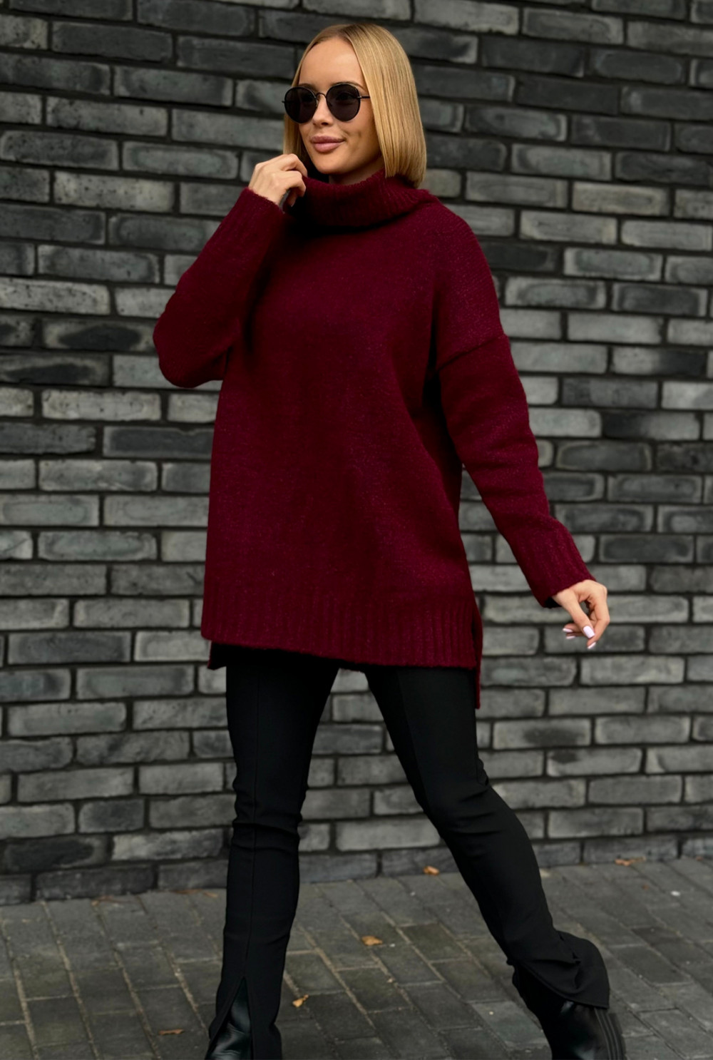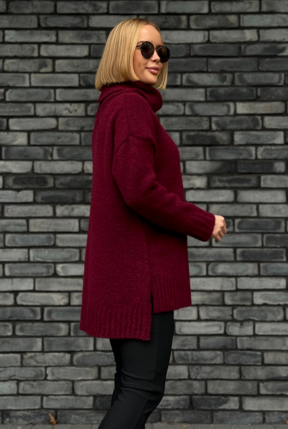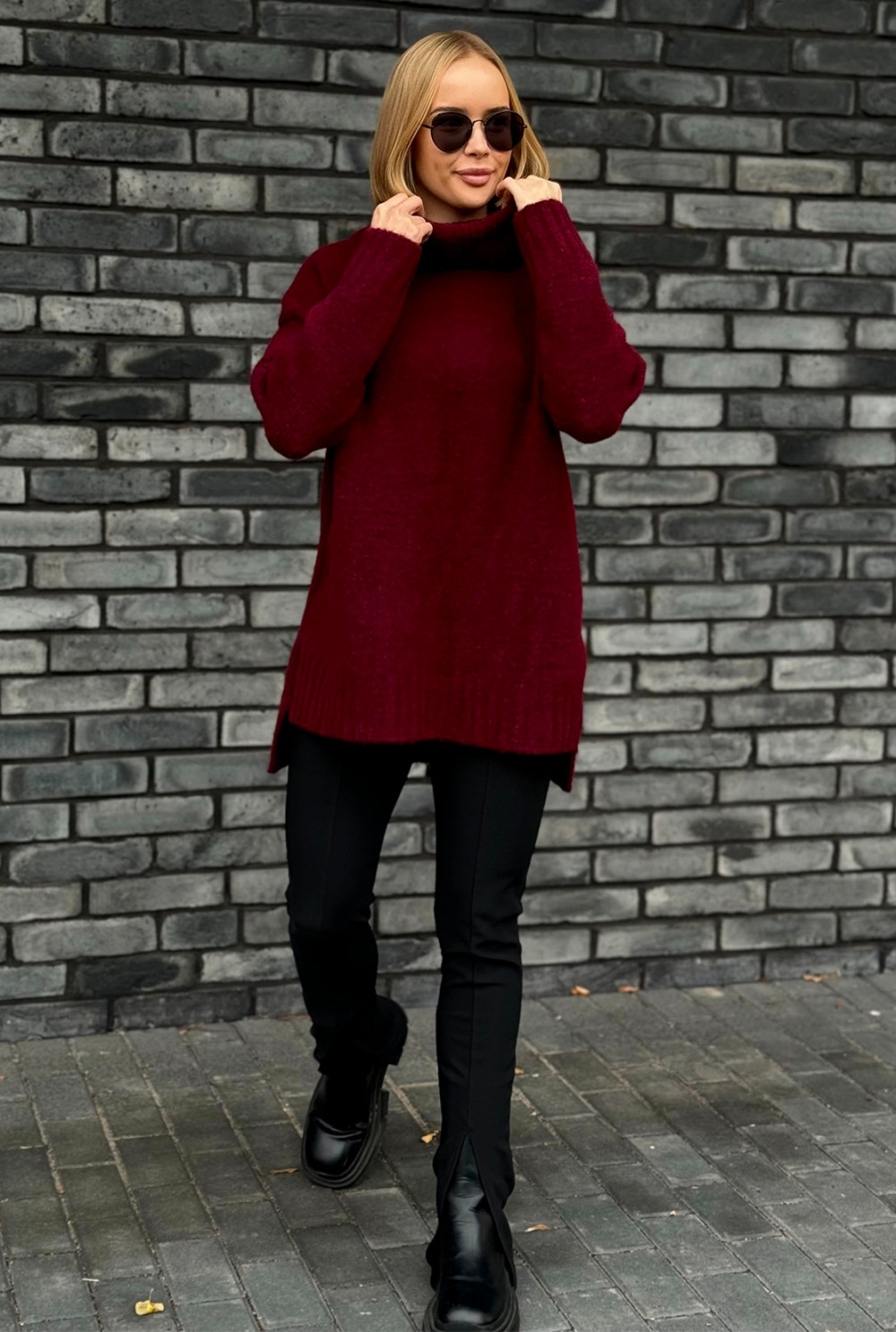 Ciepły sweter z golfem wykonany z wysokiej jakości materiałów. Model asymetryczny, z rozcięciami na bokach, zakończony ściągaczami przy rękawach i na dole. To doskonały wybór do skomponowania wielu codziennych stylizacji!