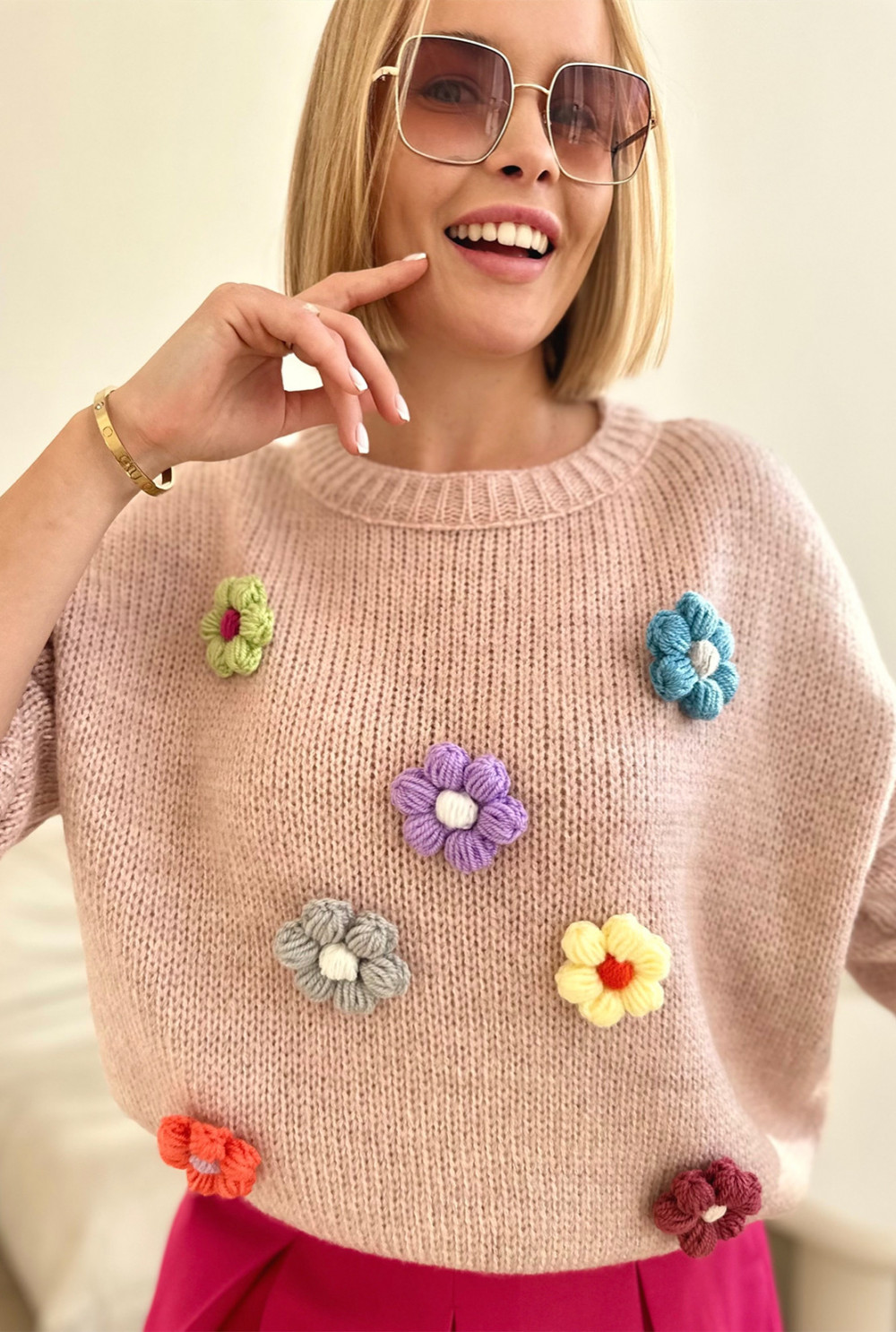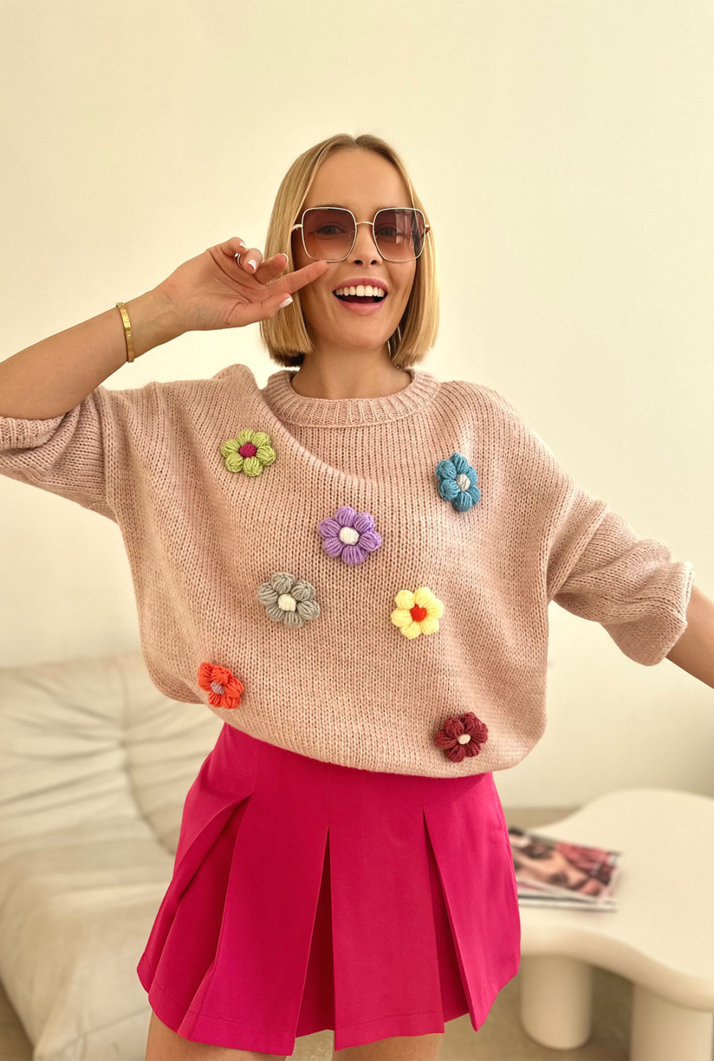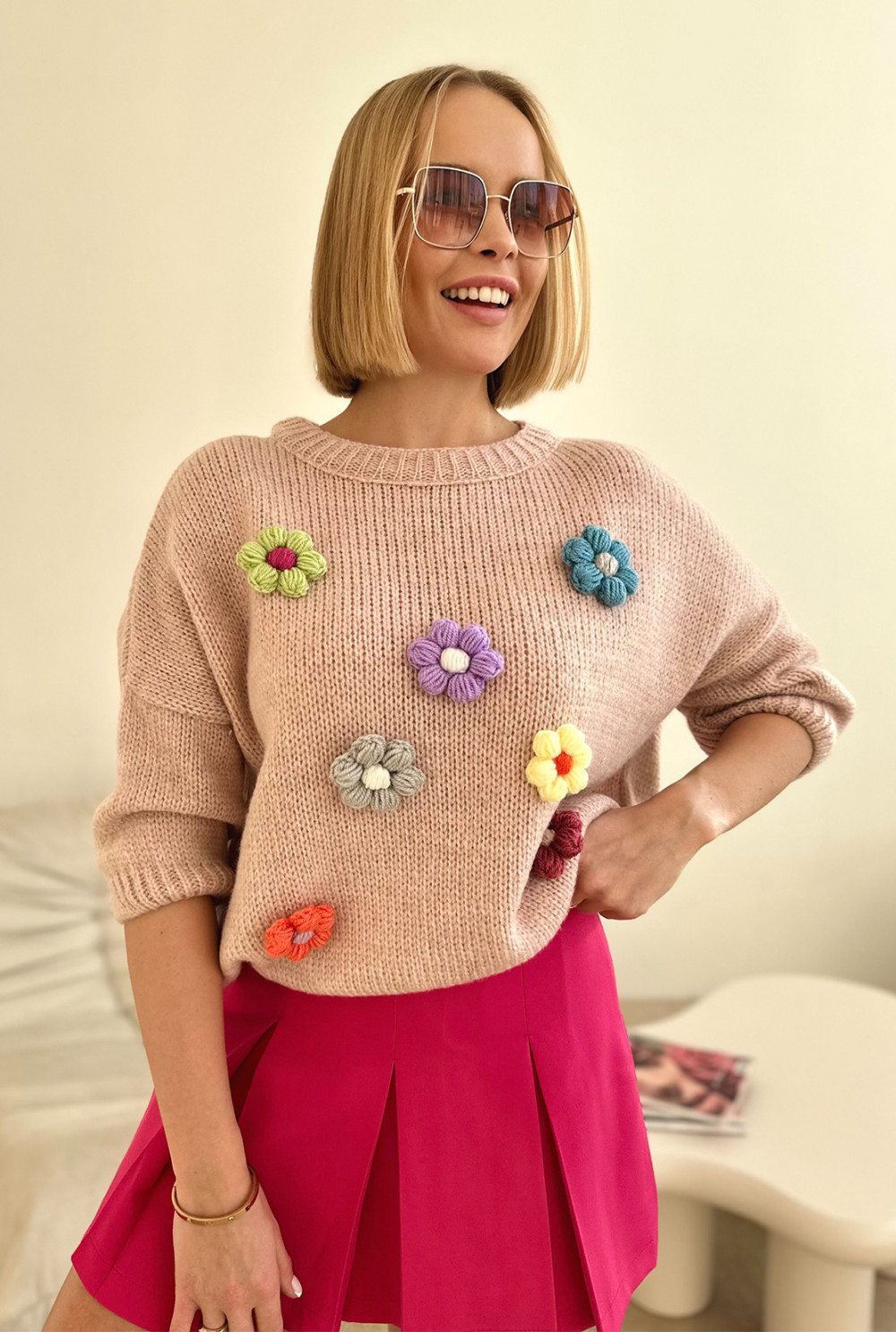 Sweter zdobiony kolorowymi kwiatkami Rosalia Puder Róż
