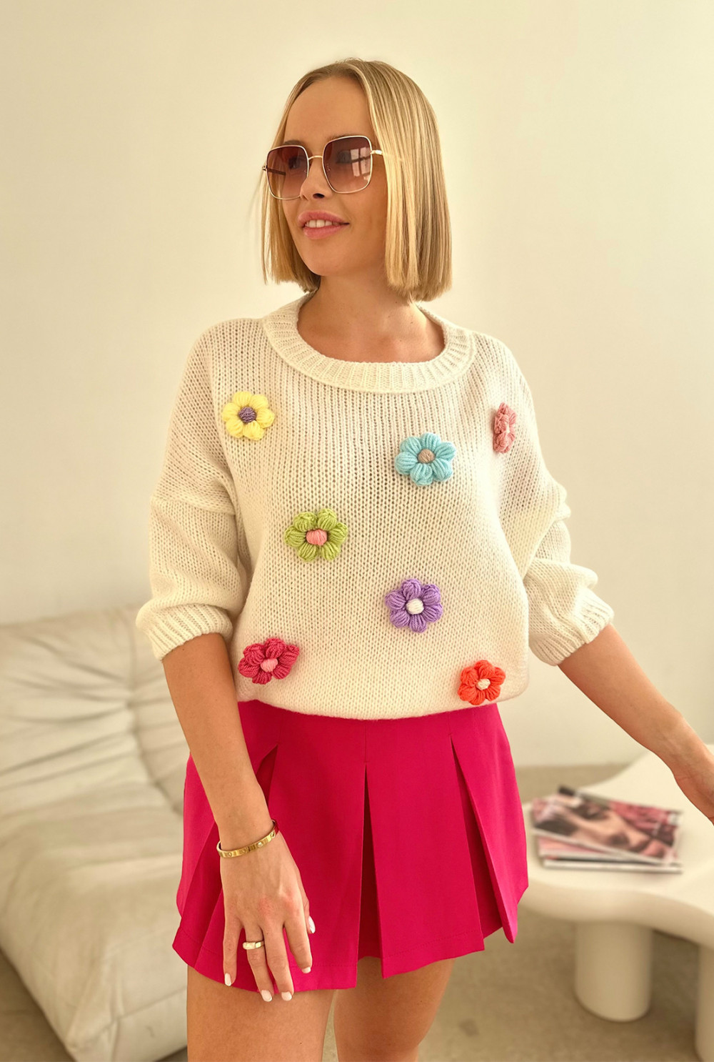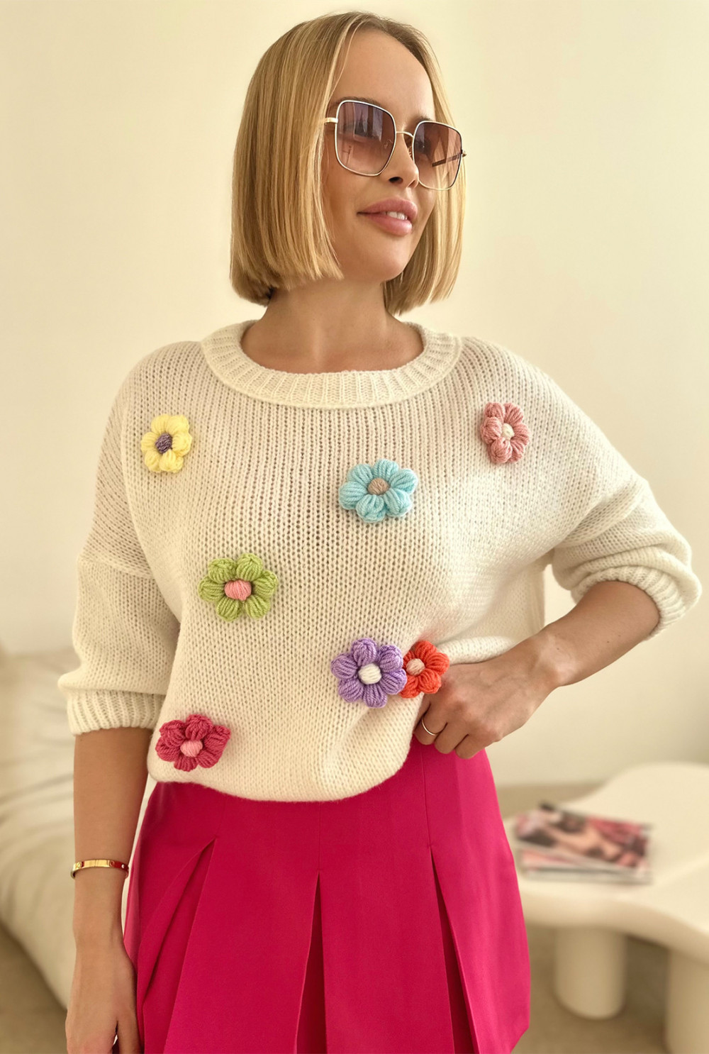 Sweter zdobiony kolorowymi kwiatkami Rosalia Ecru