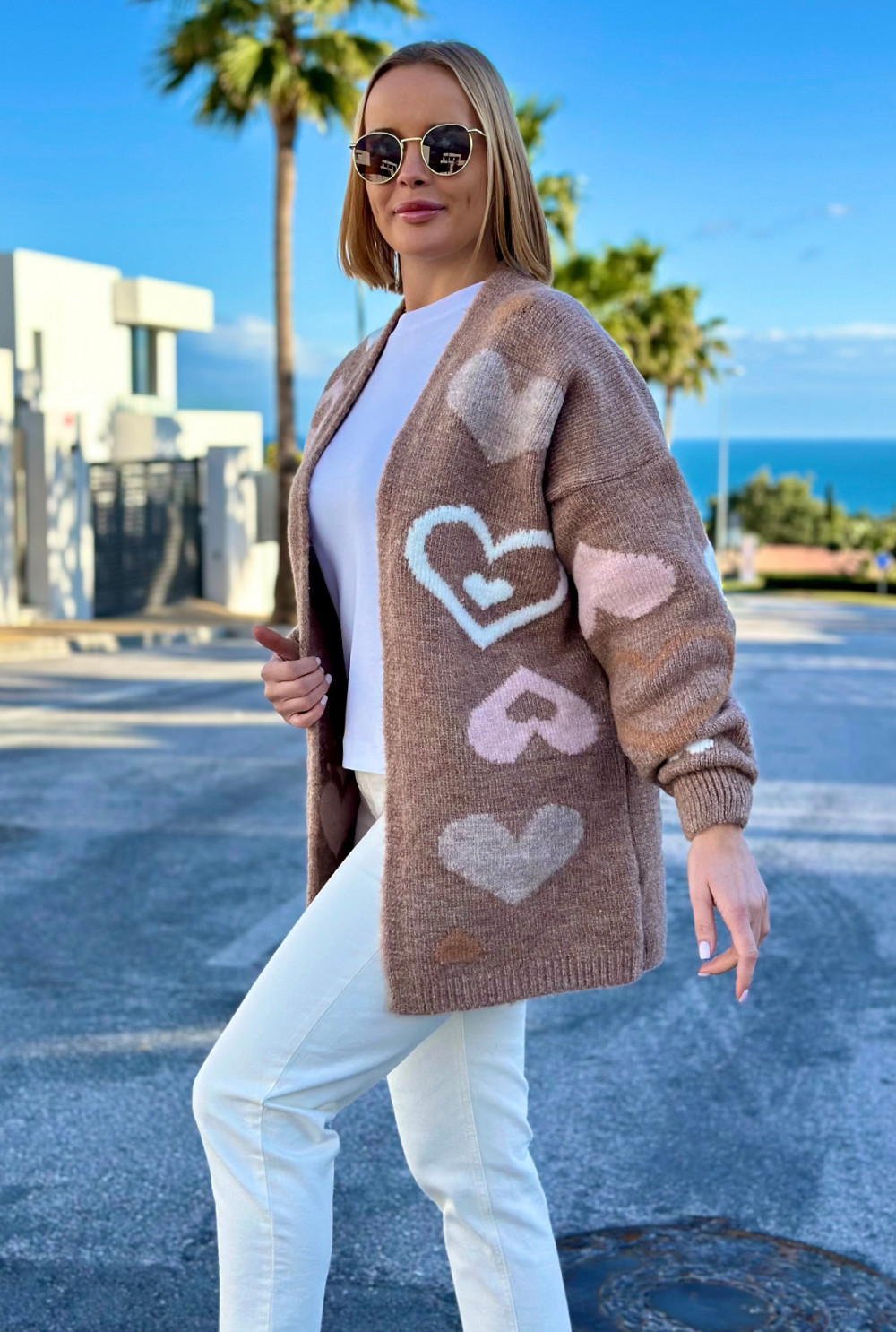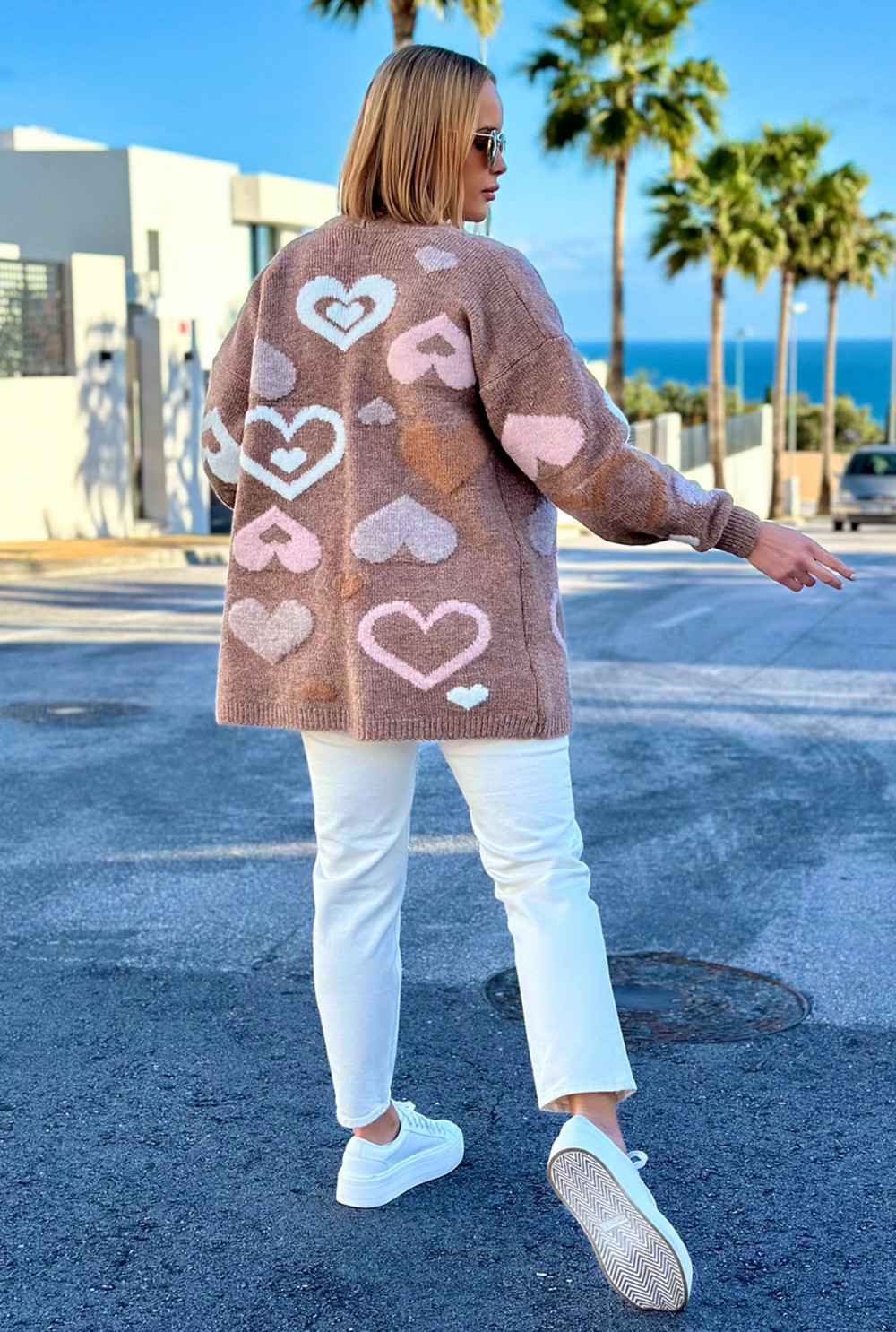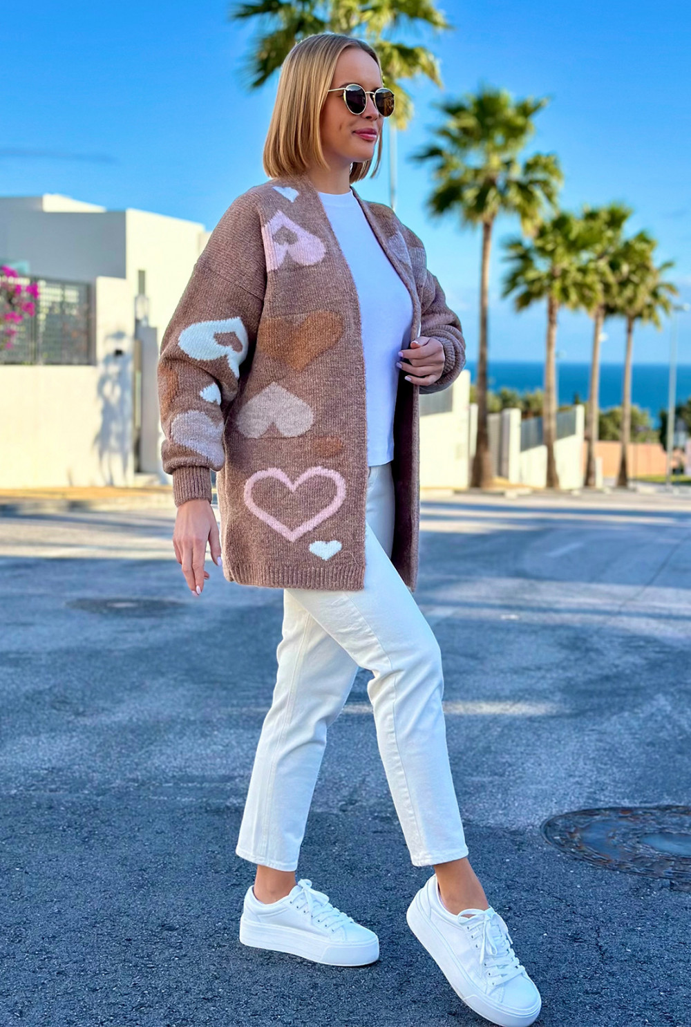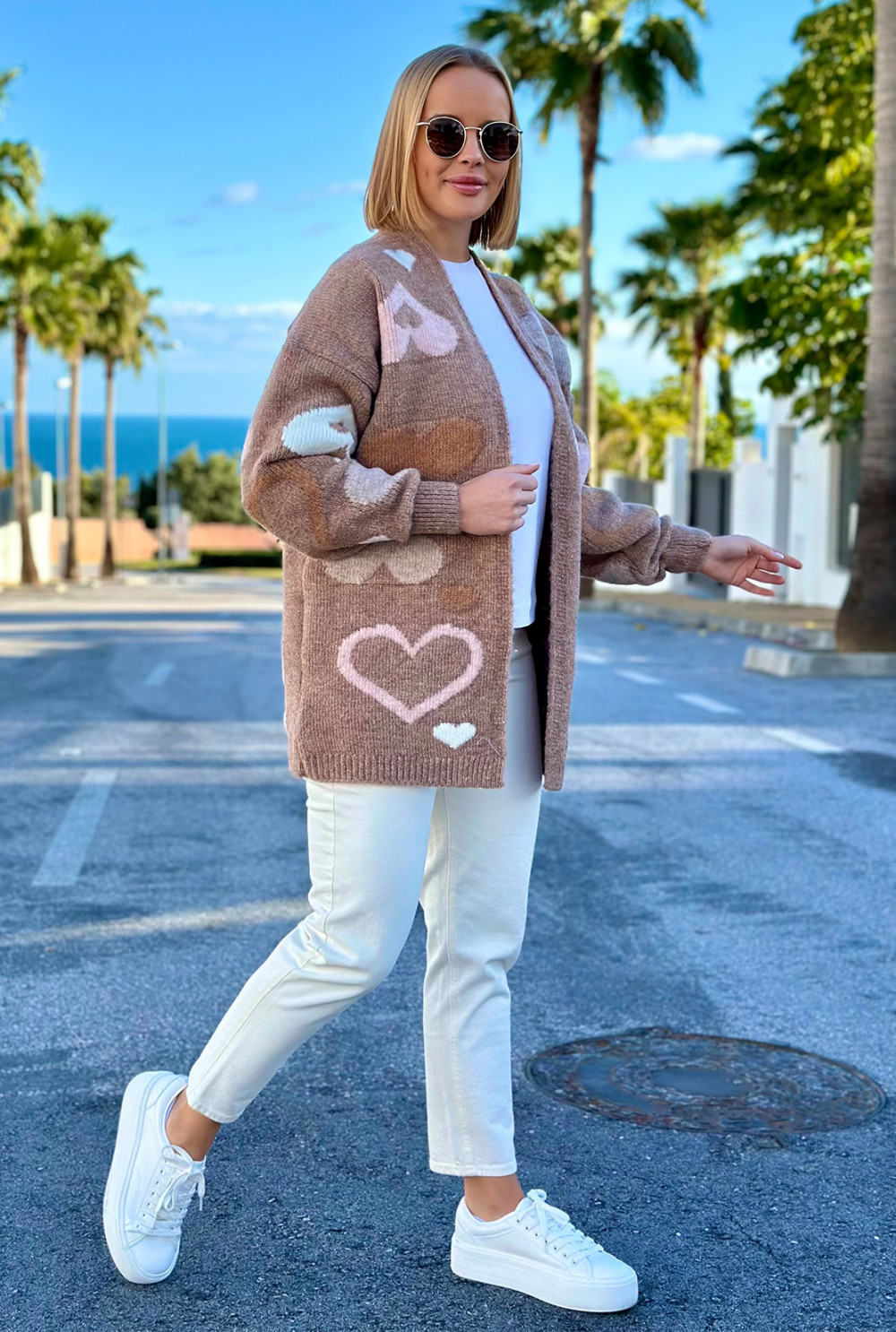 Oversizowy kardigan to ten element garderoby, który doskonale wpasuje się w różnego rodzaju stylizacje. To niezapinany model w serca o dłuższym fasonie. Zakończony ściągaczami przy rękawach. Wyróżnia się świetnie połączoną gamą kolorystyczną.