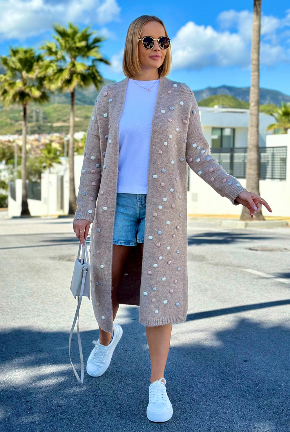 Kardigan o oversizowym kroju wykonany z wysokiej jakości materiału to doskonały wybór na chłodniejsze dni. Model wyróżnia się kolorowymi, wypukłymi zdobieniami, które dodają całości niezwykłego charakteru. Całość prezentuje się naprawdę efektownie i doskonale sprawdzi się w każdej kobiecej garderobie