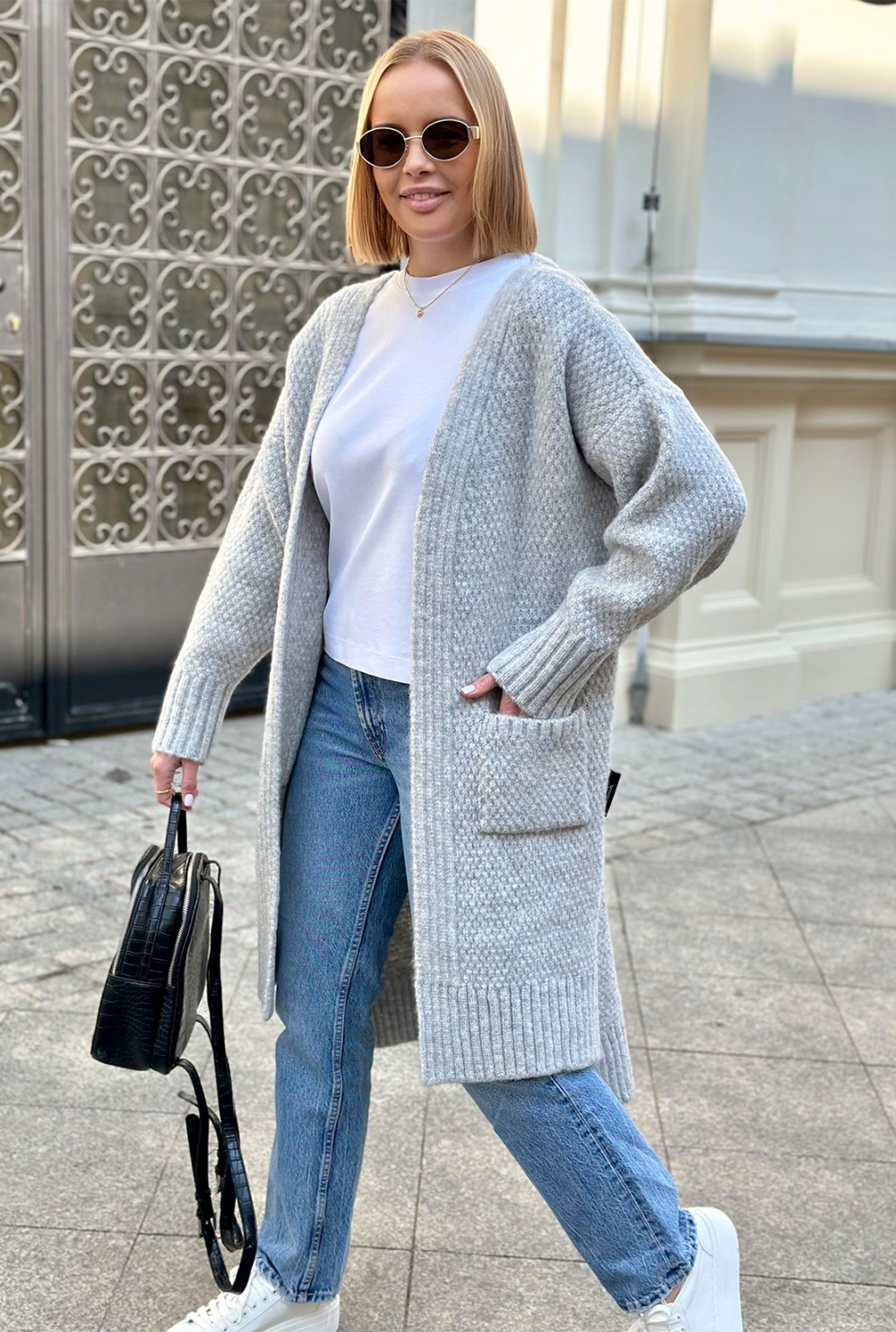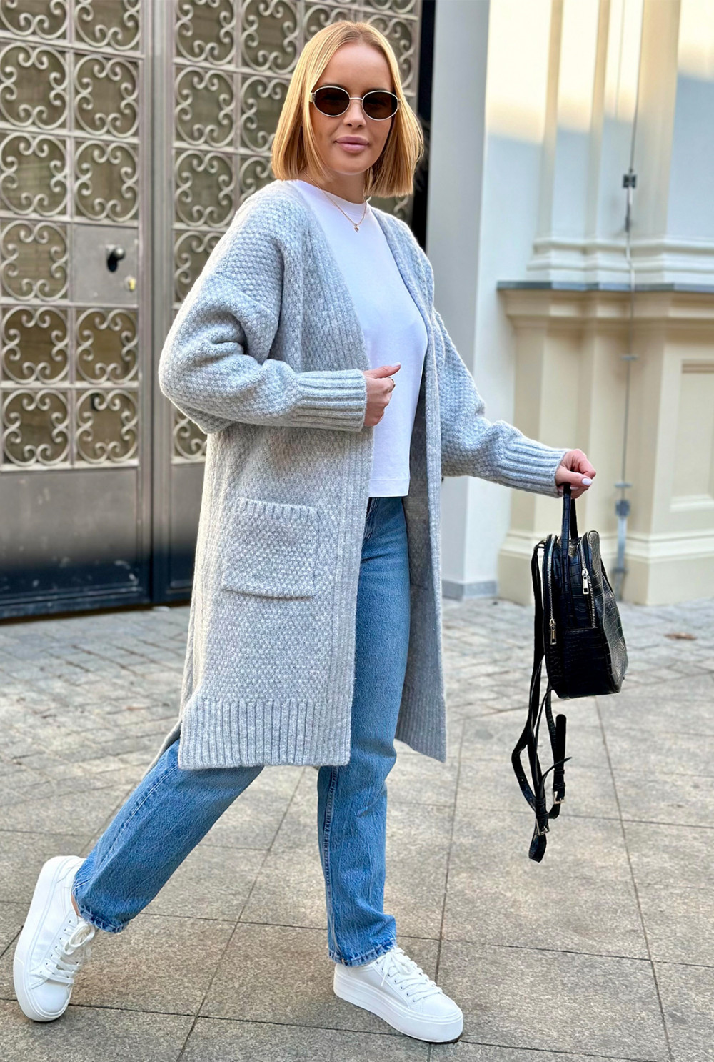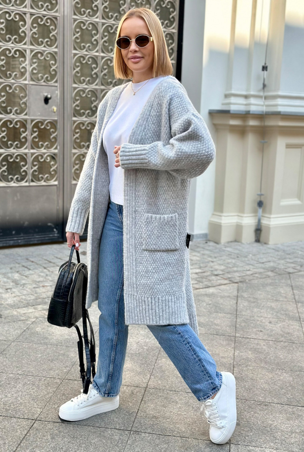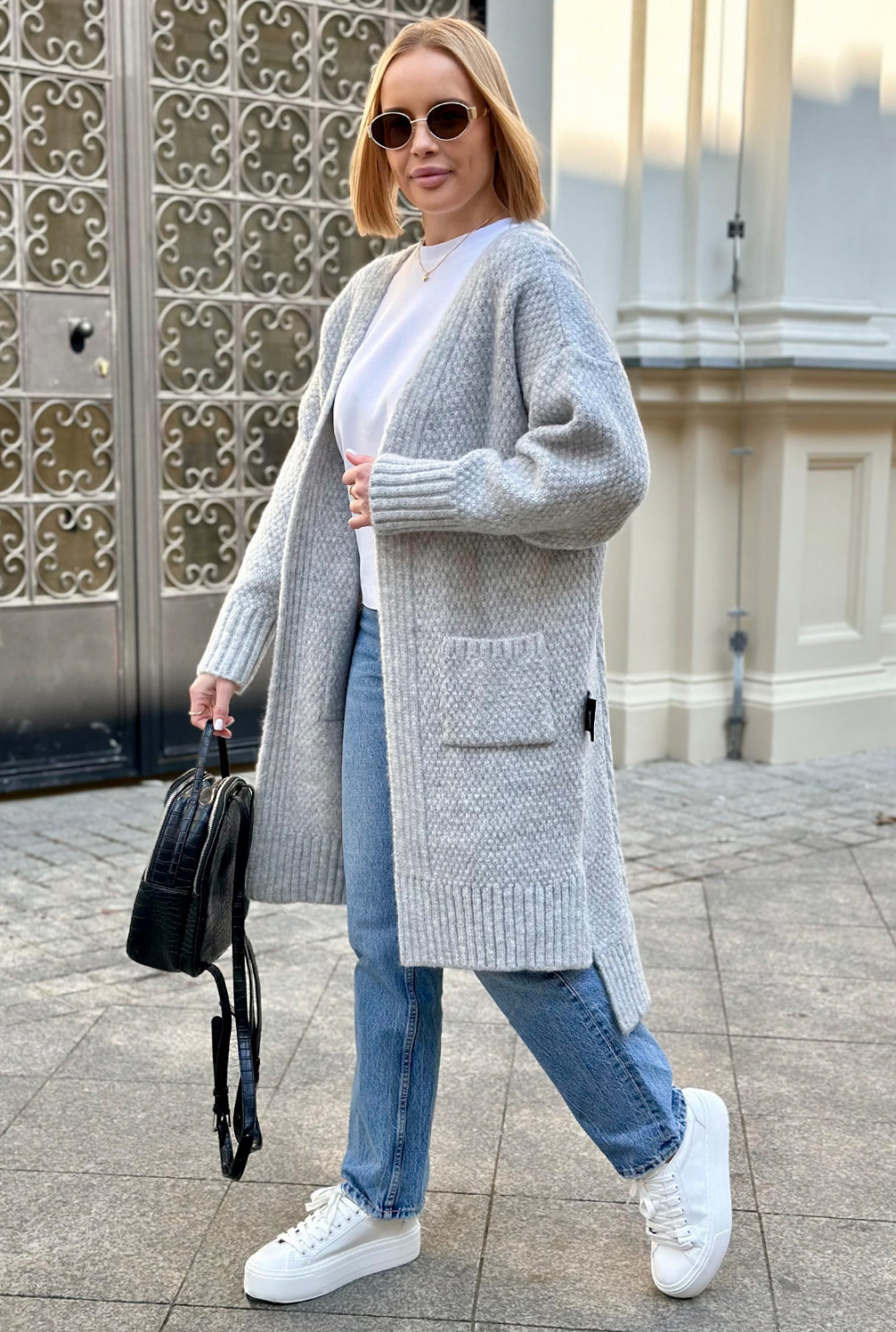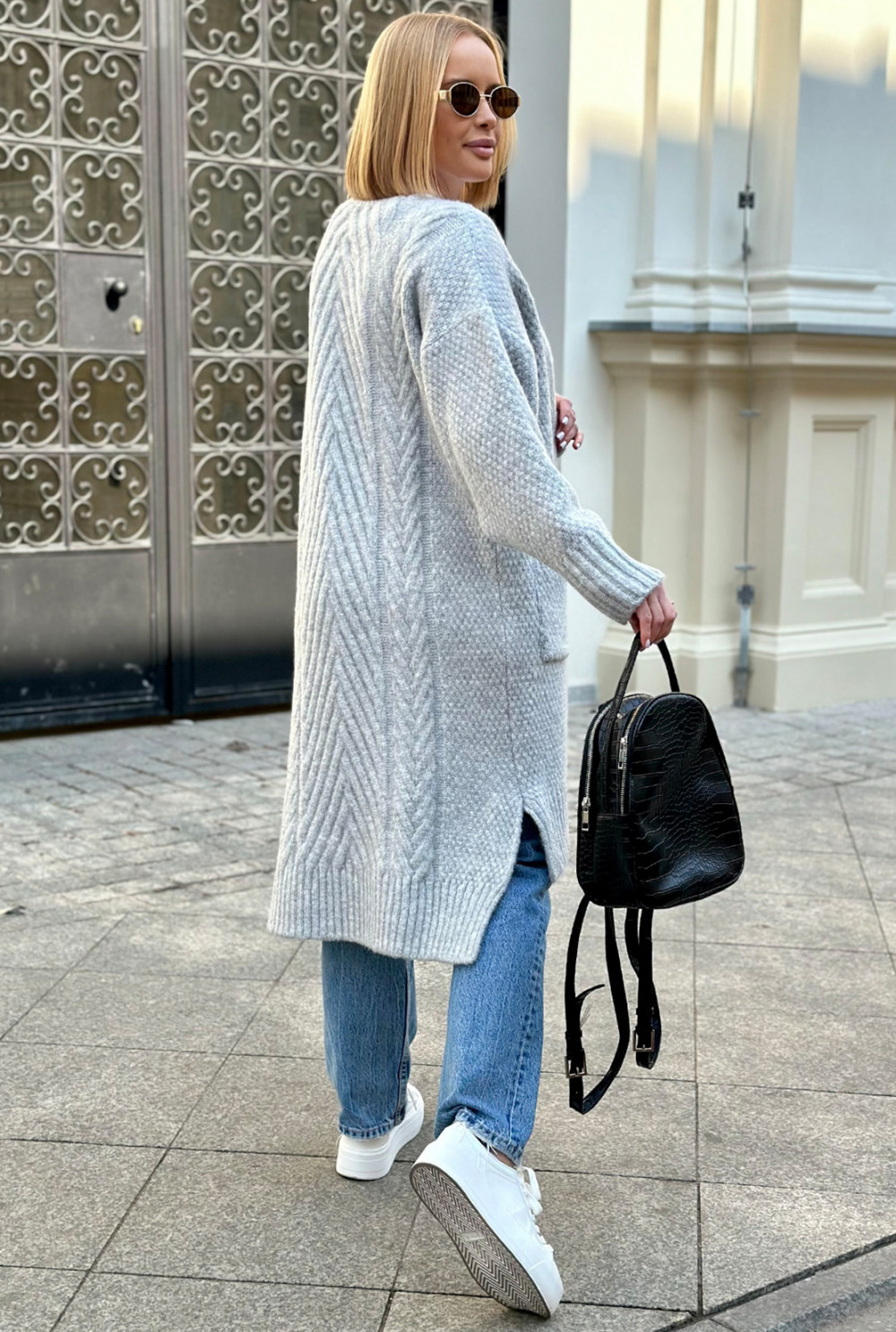 Wyjątkowo miękki kardigan z kieszeniami to propozycja, która koniecznie powinna znaleźć się w każdej garderobie! Model o asymetrycznym kroju, posiada ozdobny splot na plecach. Świetnie dopełni codzienne looki na chłodniejsze dni.