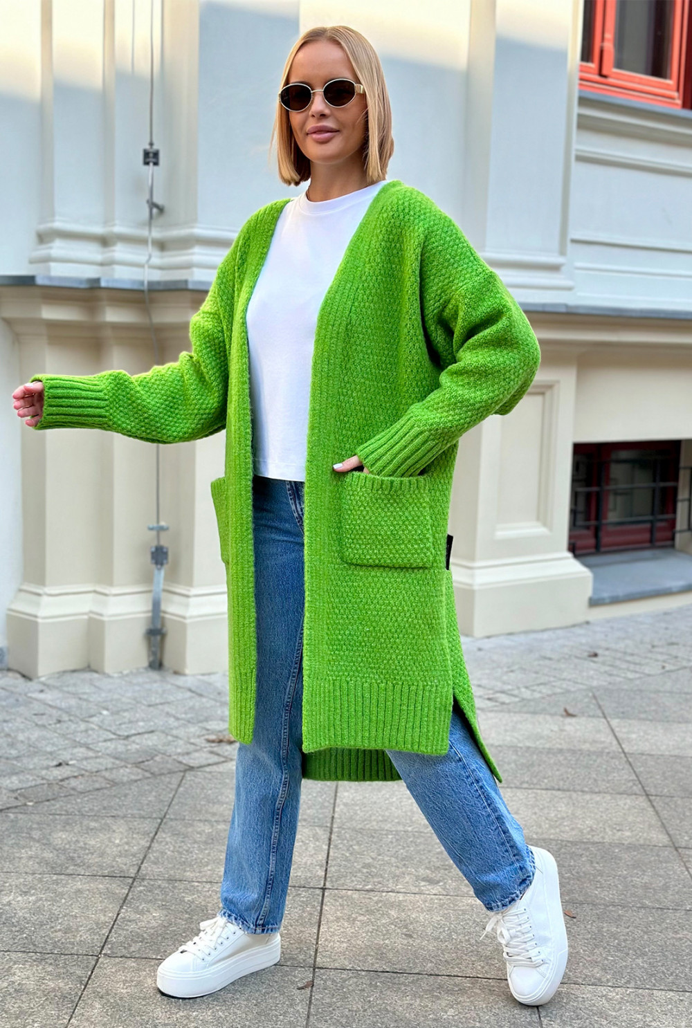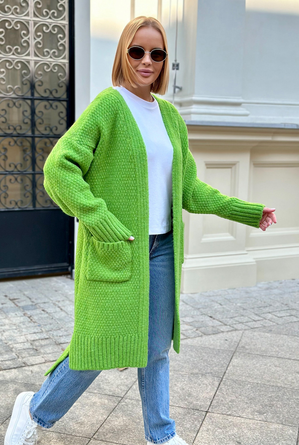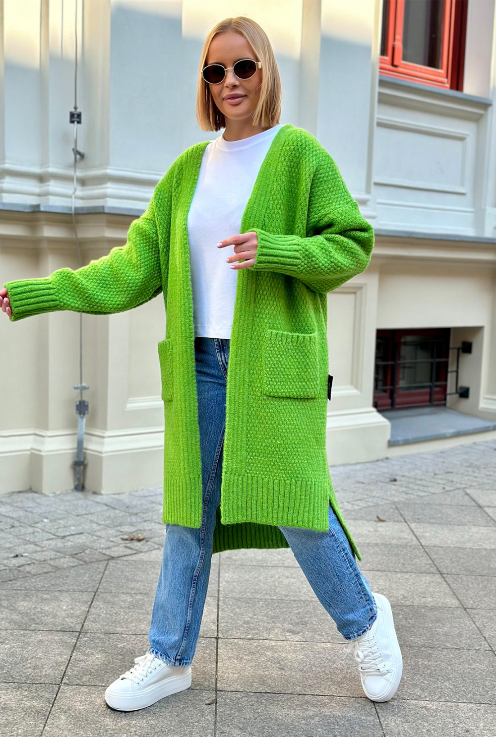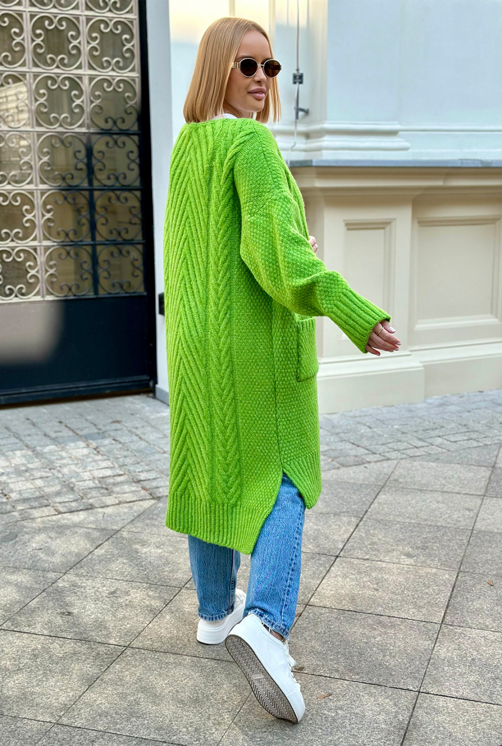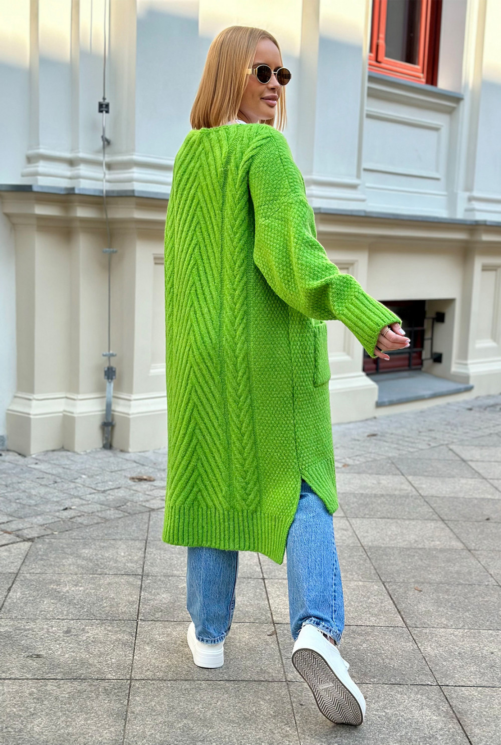 Wyjątkowo miękki kardigan z kieszeniami to propozycja, która koniecznie powinna znaleźć się w każdej garderobie! Model o asymetrycznym kroju, posiada ozdobny splot na plecach. Świetnie dopełni codzienne looki na chłodniejsze dni.