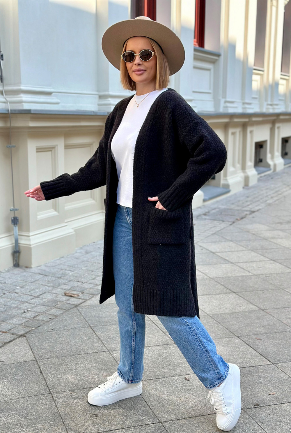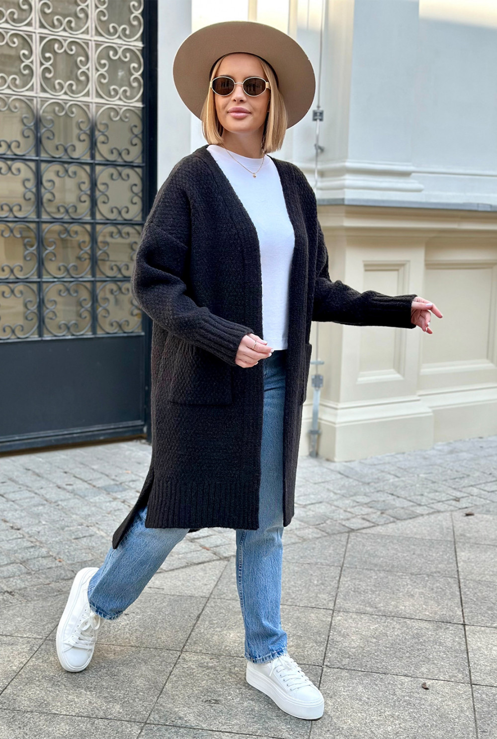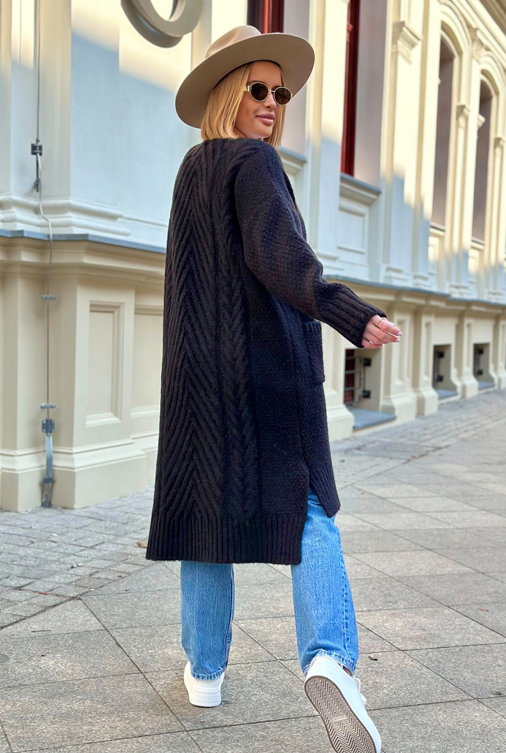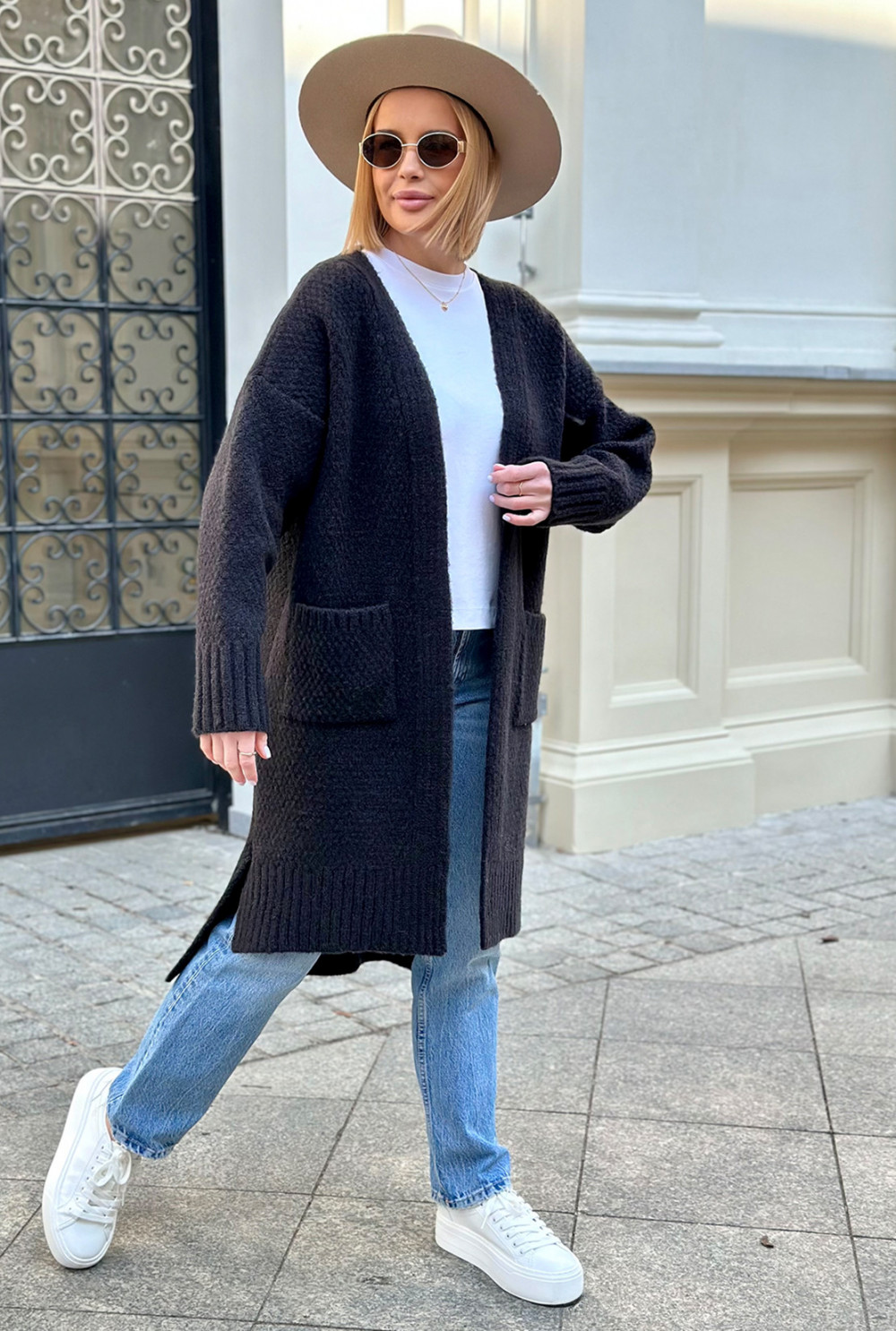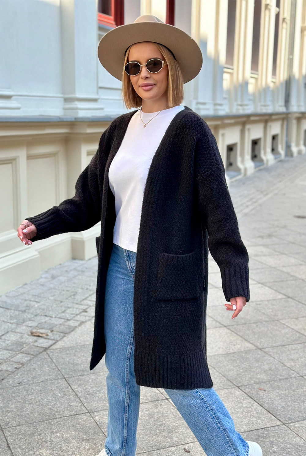 Wyjątkowo miękki kardigan z kieszeniami to propozycja, która koniecznie powinna znaleźć się w każdej garderobie! Model o asymetrycznym kroju, posiada ozdobny splot na plecach. Świetnie dopełni codzienne looki na chłodniejsze dni.